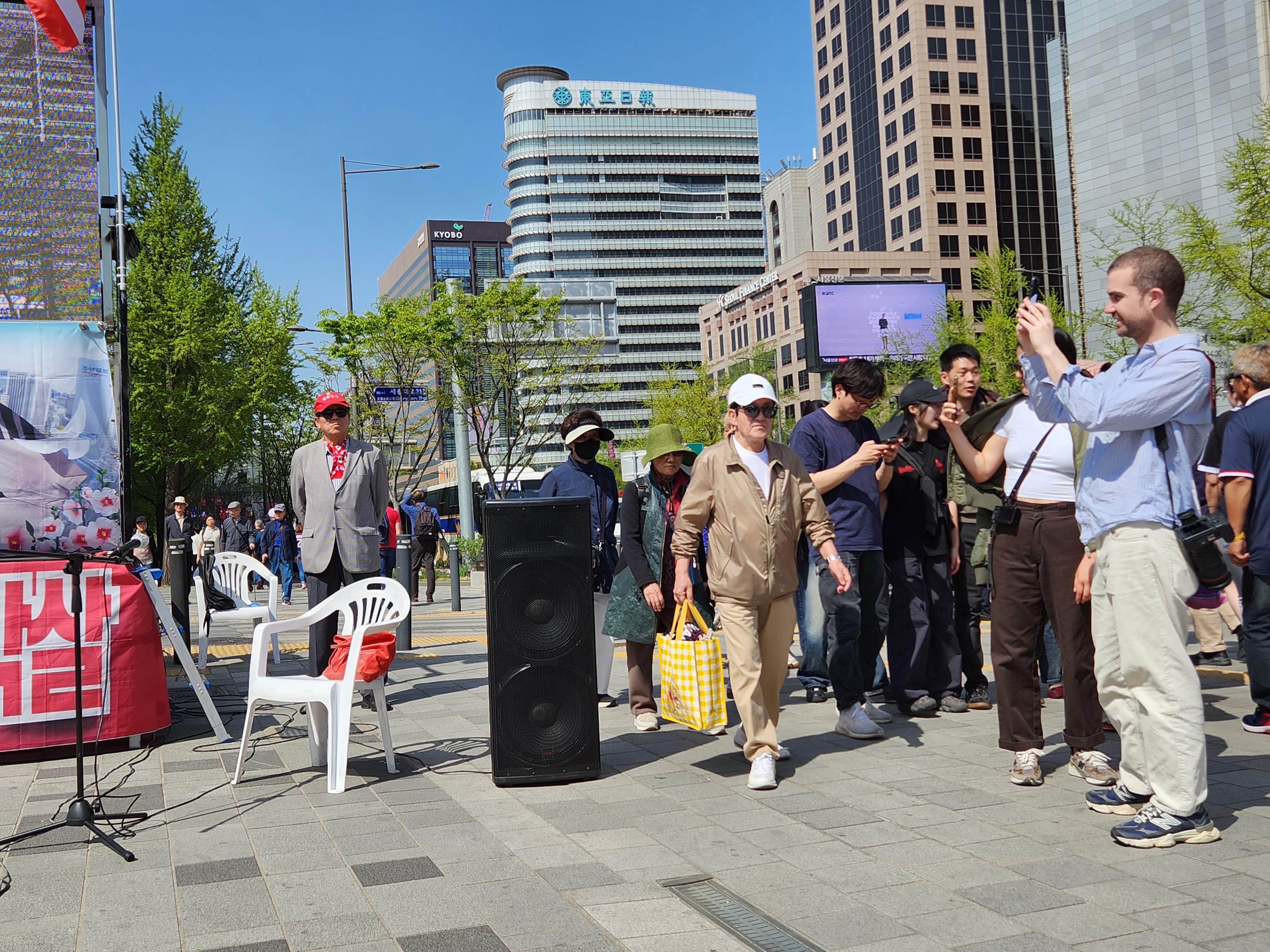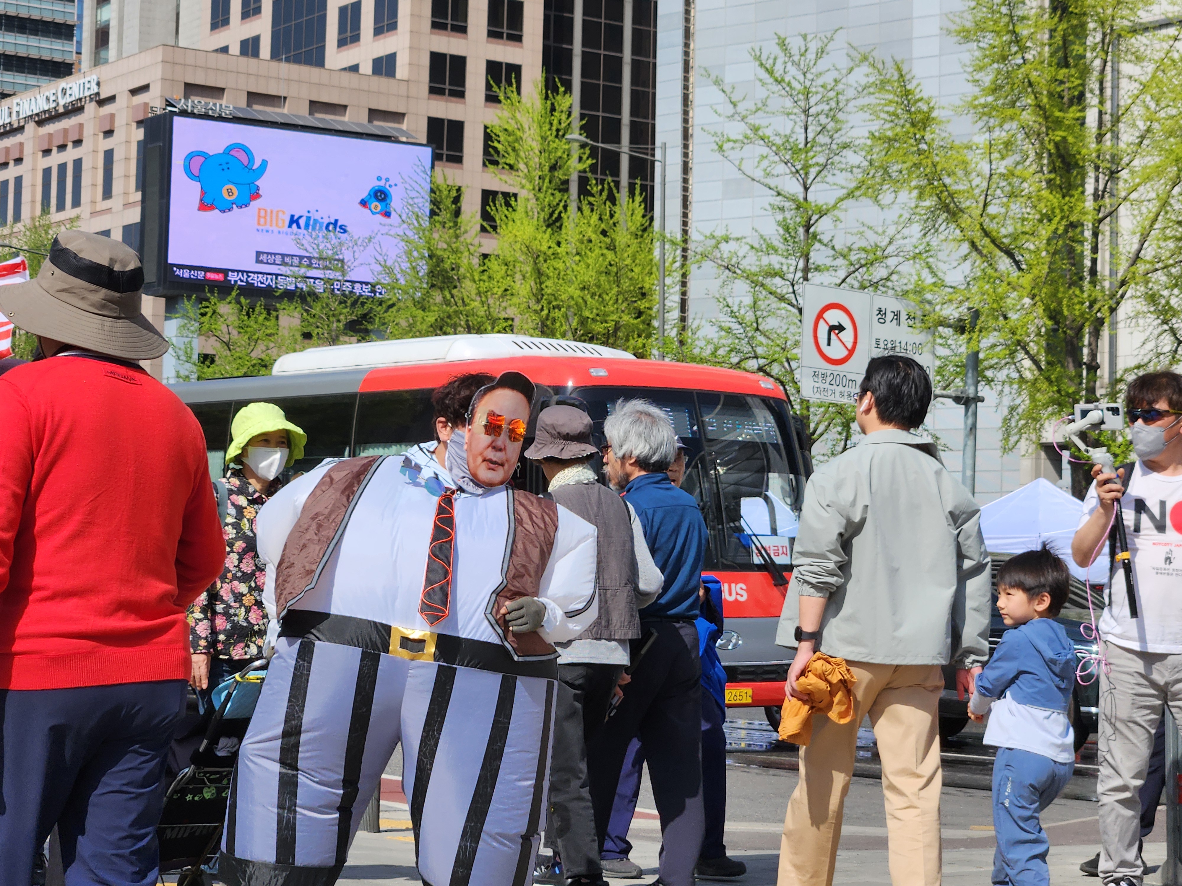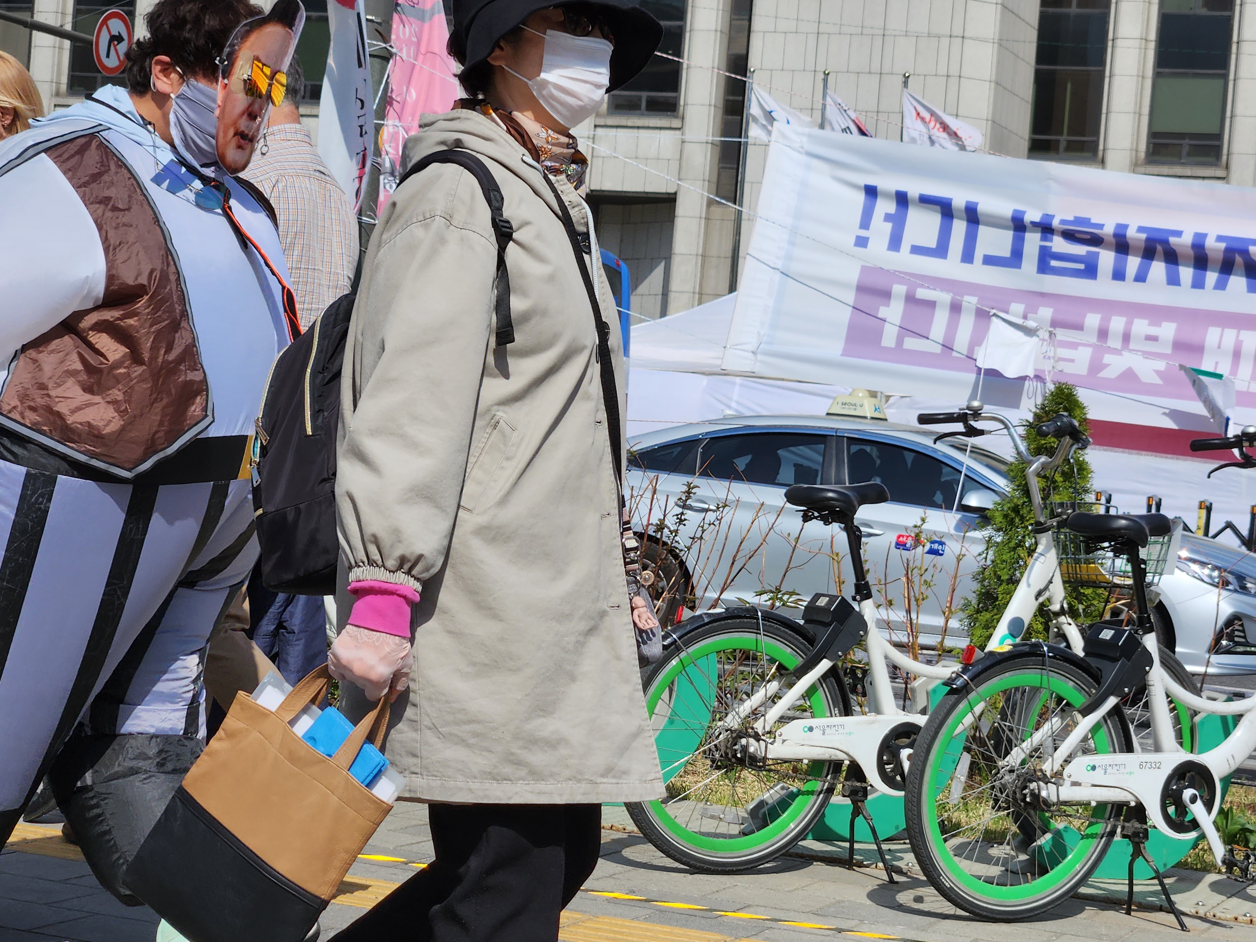 어느 좌파인사가 윤대통령을 조롱하는 복장으로 지나고 있다.