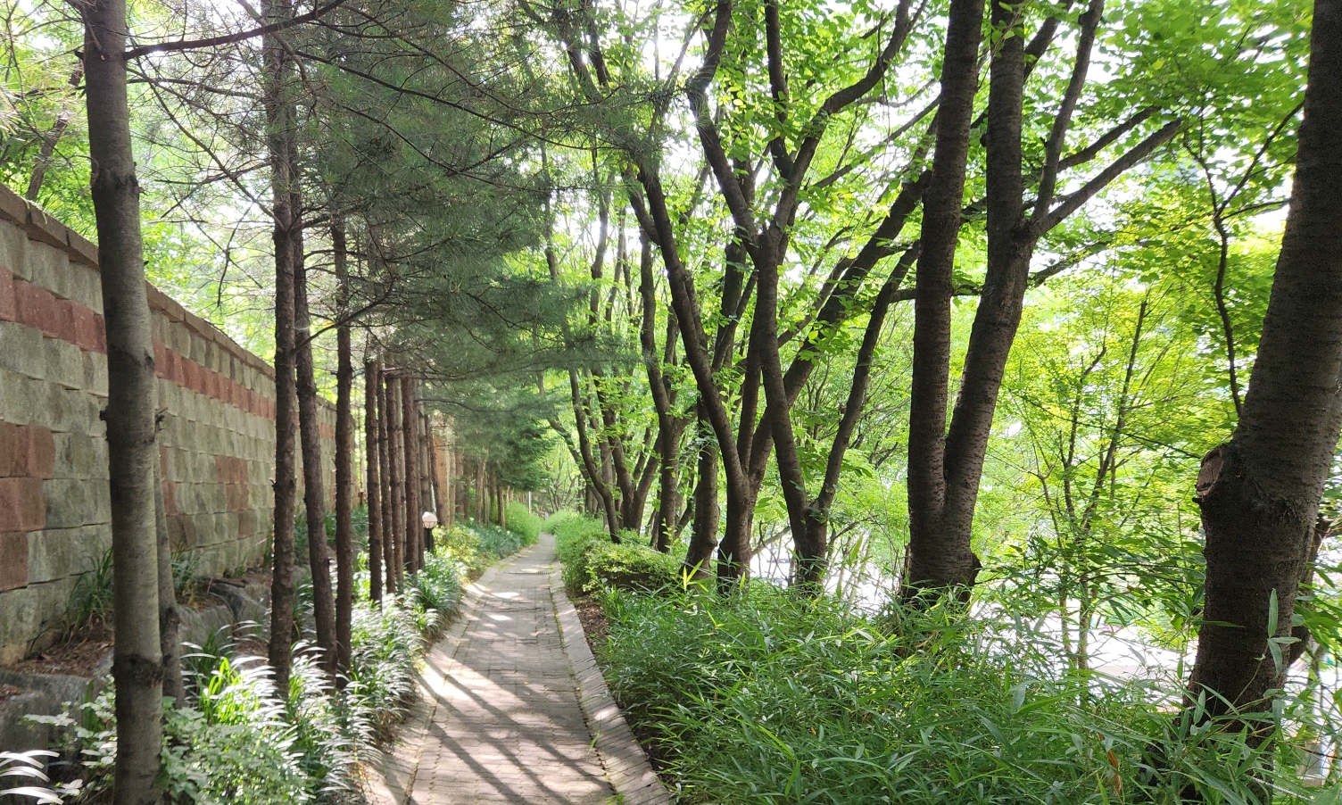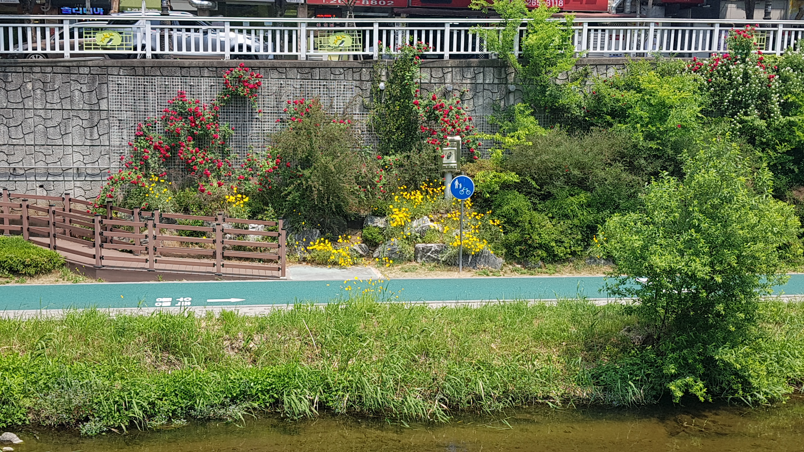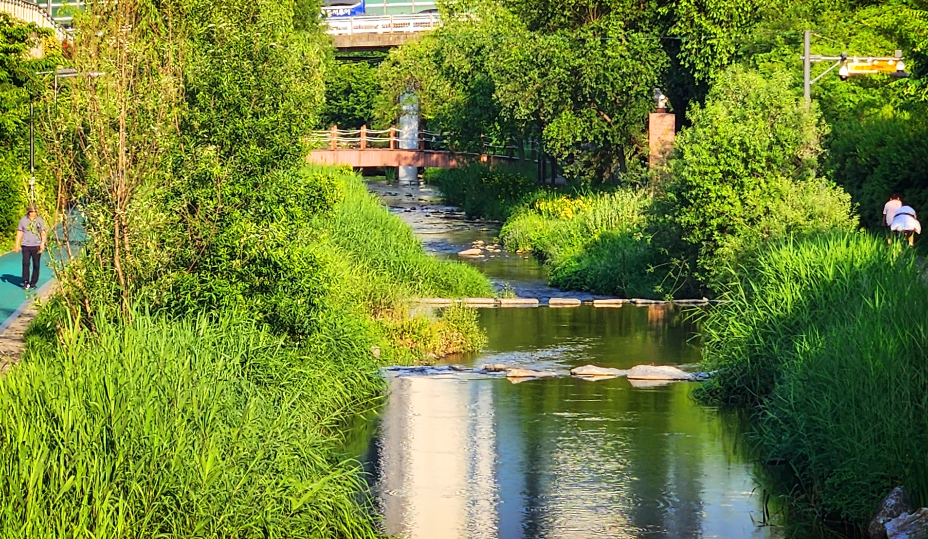 노오란 금계국과 빨간 장미가 산책로에 활짝 피어있고 키큰 갈대가 바람에 한들거린다. 하얀 개망초가 허드러지게 피어있고 클로버, 샛대 등 이 즈음에는 화초 아닌 잡초가 없다. 키크고 잎이 넓은 뽕나무에는 오디가 까맣게 먹음직스레 익어가고 있어 고향 밭언덕 풍경이 떠오른다.
