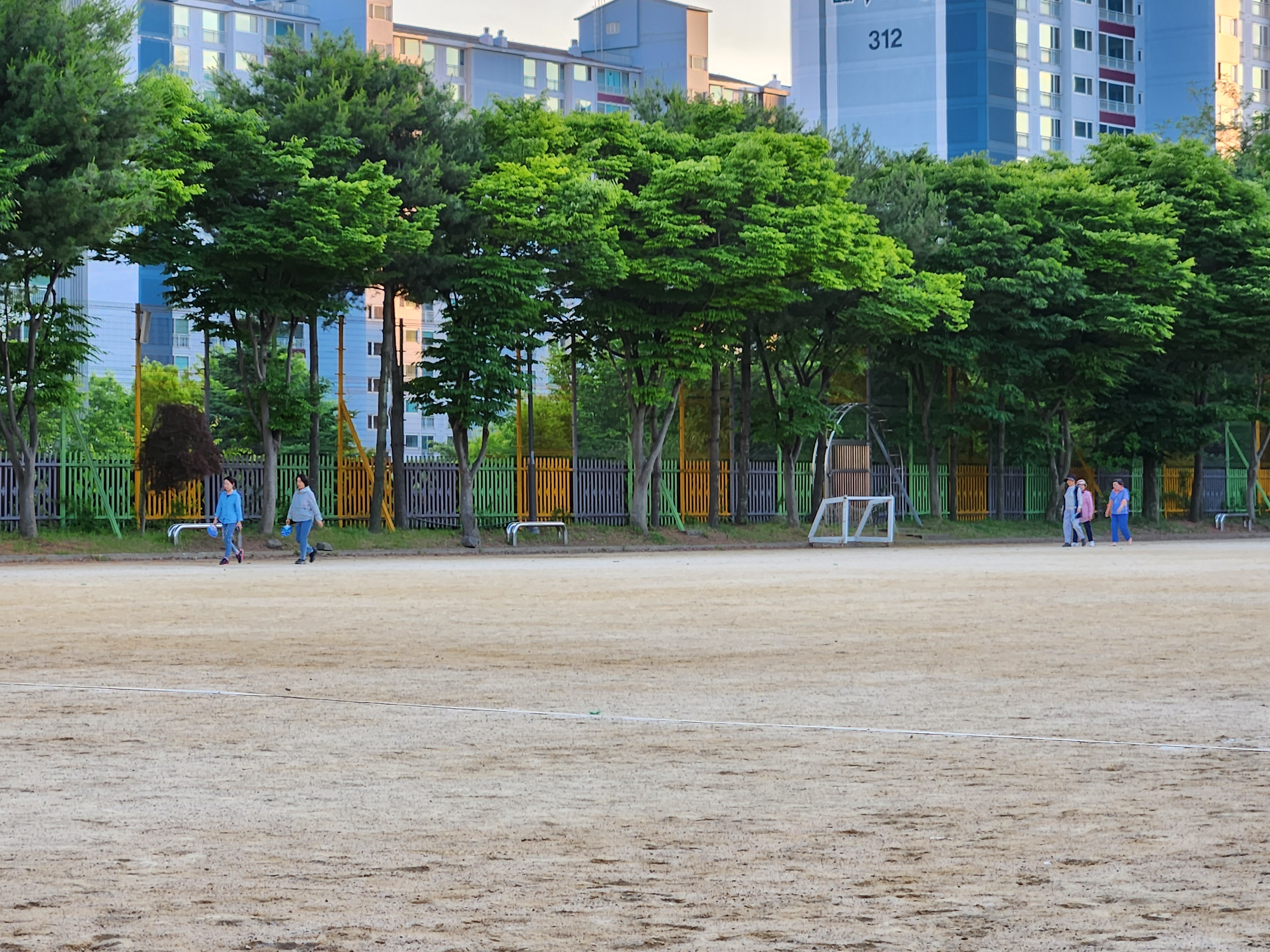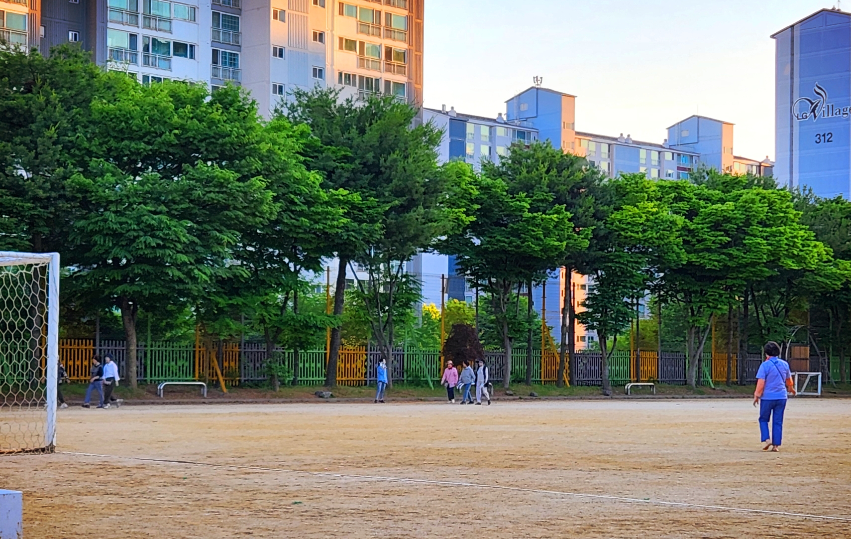 저녁이 되면 아파트 아주머니들의 걷기운동 집합소가 운동장이다. 10명 이상 끼리끼리 모이면서 동네 사랑방모임이 되고 있다.