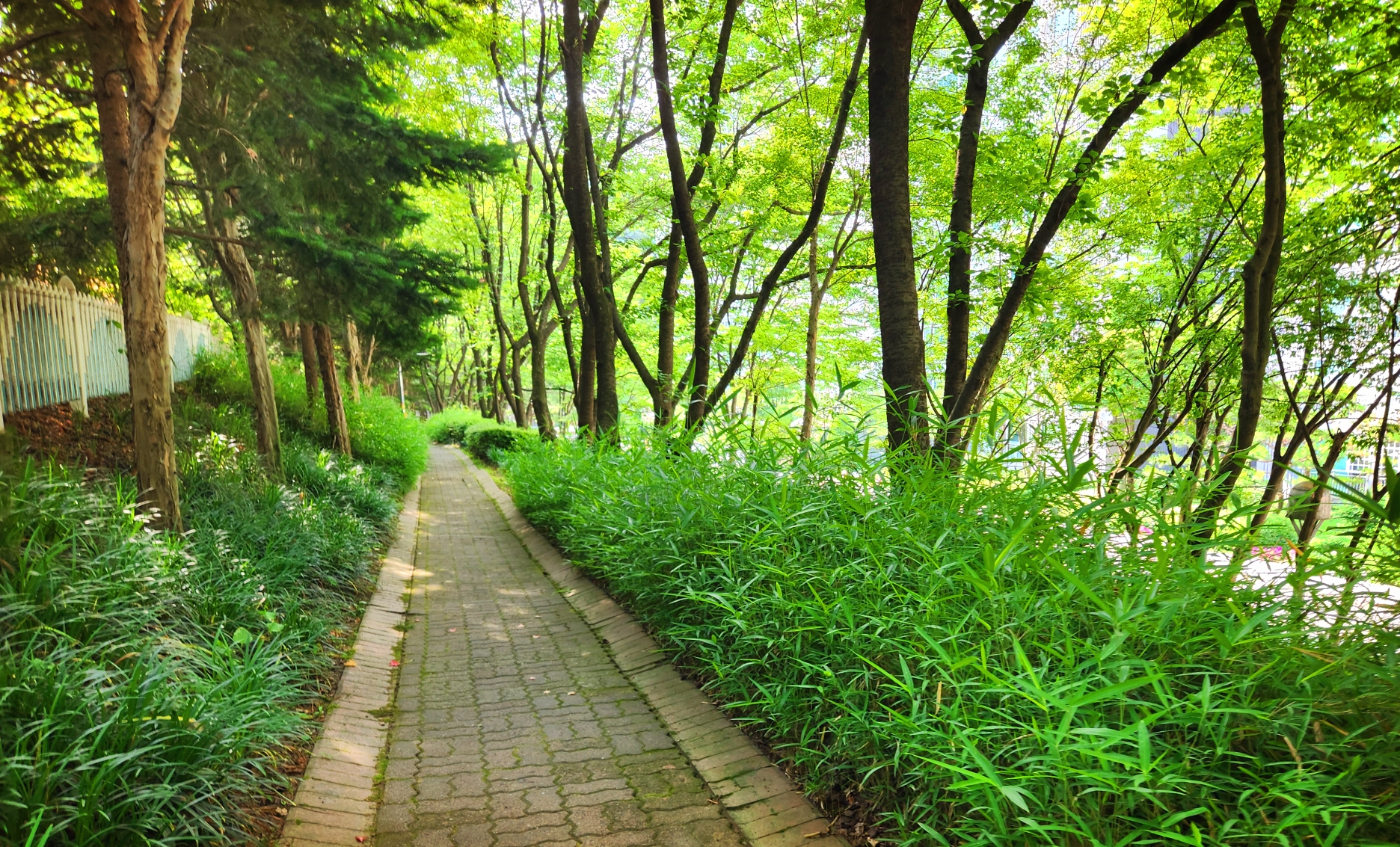 이런 동네의 분위기를 서울시내에 사는 이들에게 이야기하면 딴세상 같은 얘기라고 한다. 이른 아침에 짹짹거리는 새소리와 뻐꾸기 소리를 들으면서 잠을 깨어나고 사색의 길인 아침산책로에는 까치가 폴짝폴짝 뛰면서 길을 안내해 준다. 아파트 바로 뒤쪽의 초등학교, 중학교 운동장으로는 학생들 오기 전에 아파트 주민들의 맨발걷기가 새벽부터 이어진다. 8시경 등교길에 초중학생들이 길을 가득 걸어 올라간다. 초등학교 운동장에서 어린이들의 조잘대는 경쾌한 소리, 시간마다 수업을 알리는 알림 음악소리가 내 어릴적의 교정을 연상하게 해준다. 아파트에서 창밖으로 내다보면 파아란 하늘과 흰 구름, 병풍처럼 둘러싸인 뒷산의 푸르른 녹음, 보이고 들리는 것들이 다 부드럽고 편안함을 주고 있다. 비라도 내리는 날에는 어디선가 개구리와 맹꽁이가 울고 이제 곧 여름이 되면 매미가 울 차례가 된다.