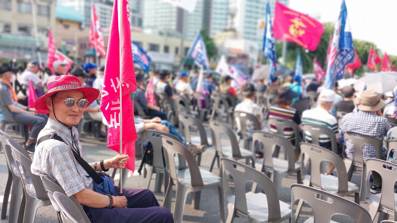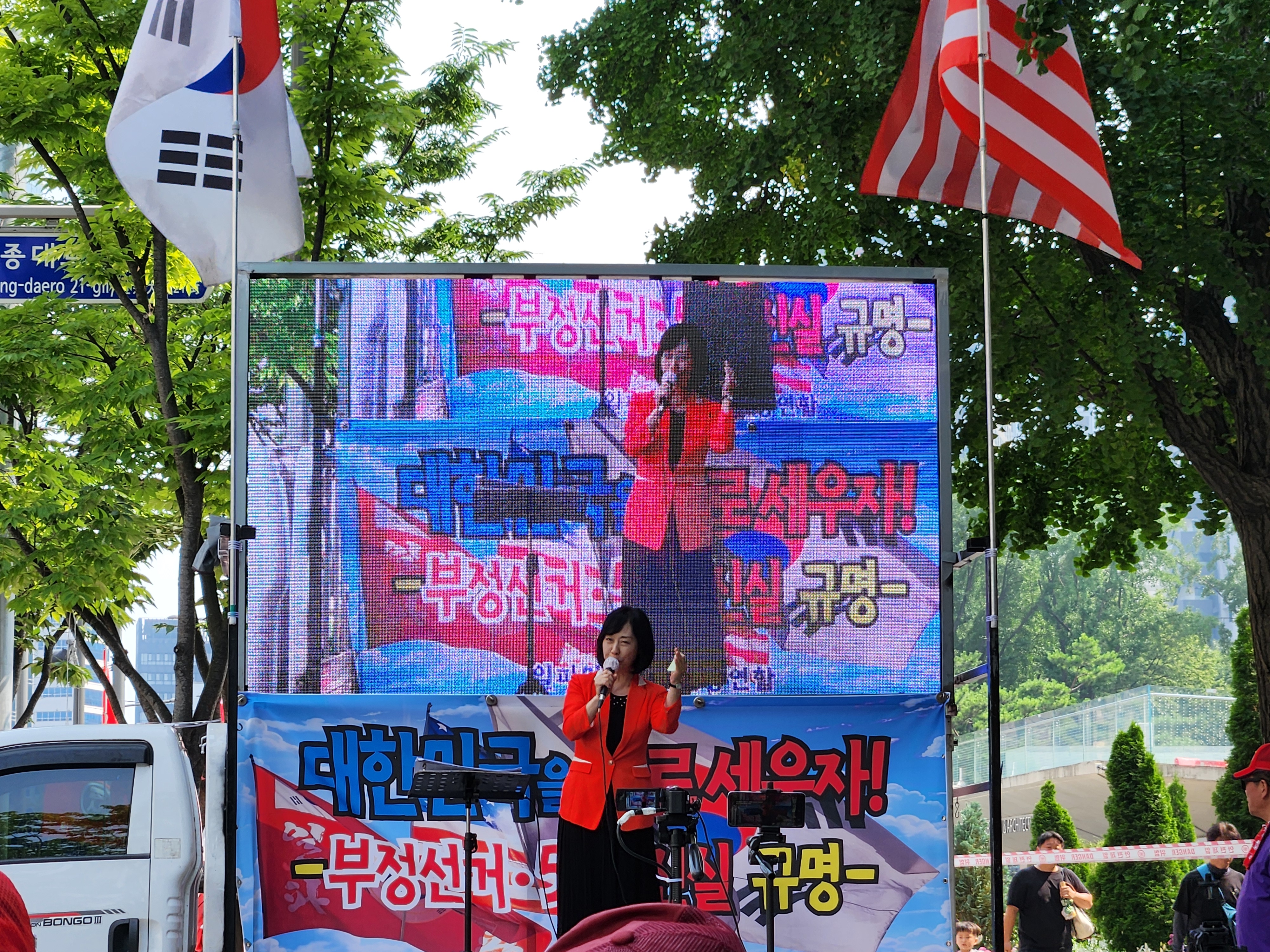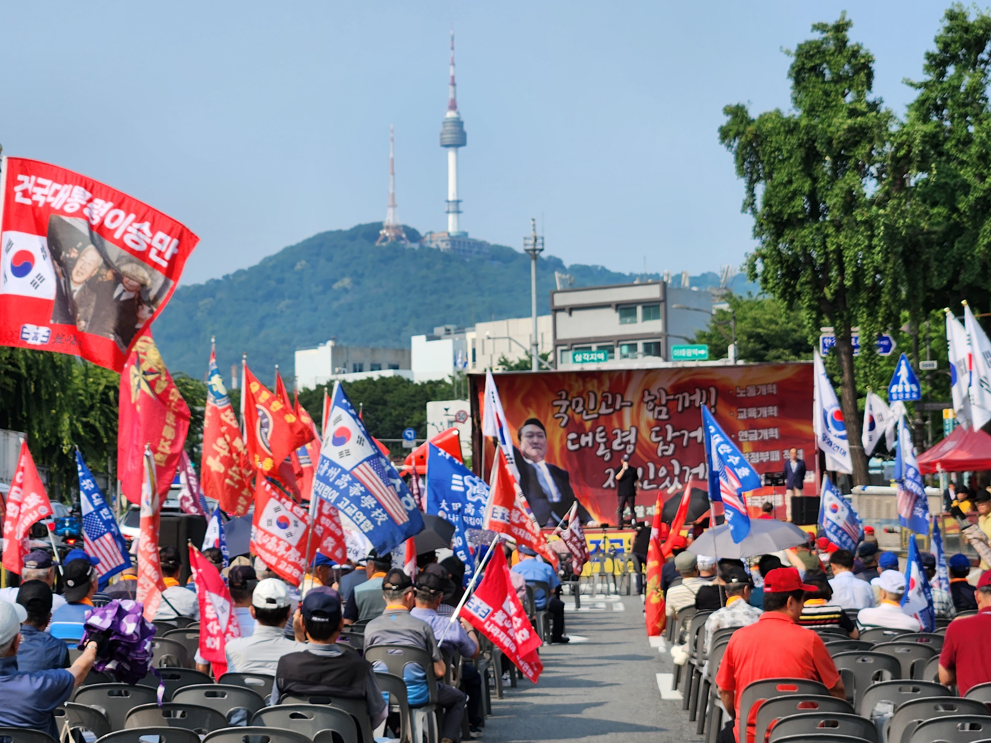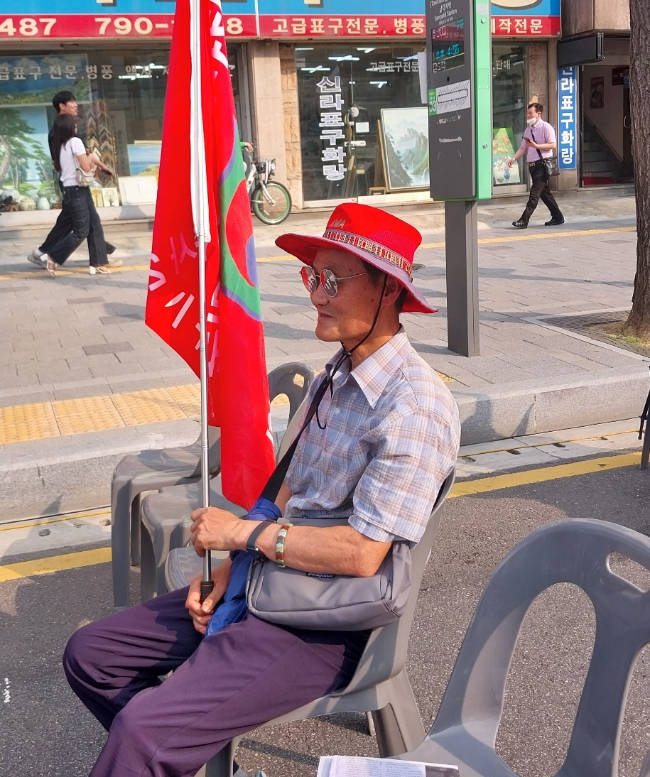 오후4시 쨍쨍햇볕 아스팔트 도로에서 신자유연대 김상진대표가 구속된 상태에서도 용산을 잘 지켜내고 있다. 김명희여사의 봉사는 여전하시고 34기 5명도 동참.