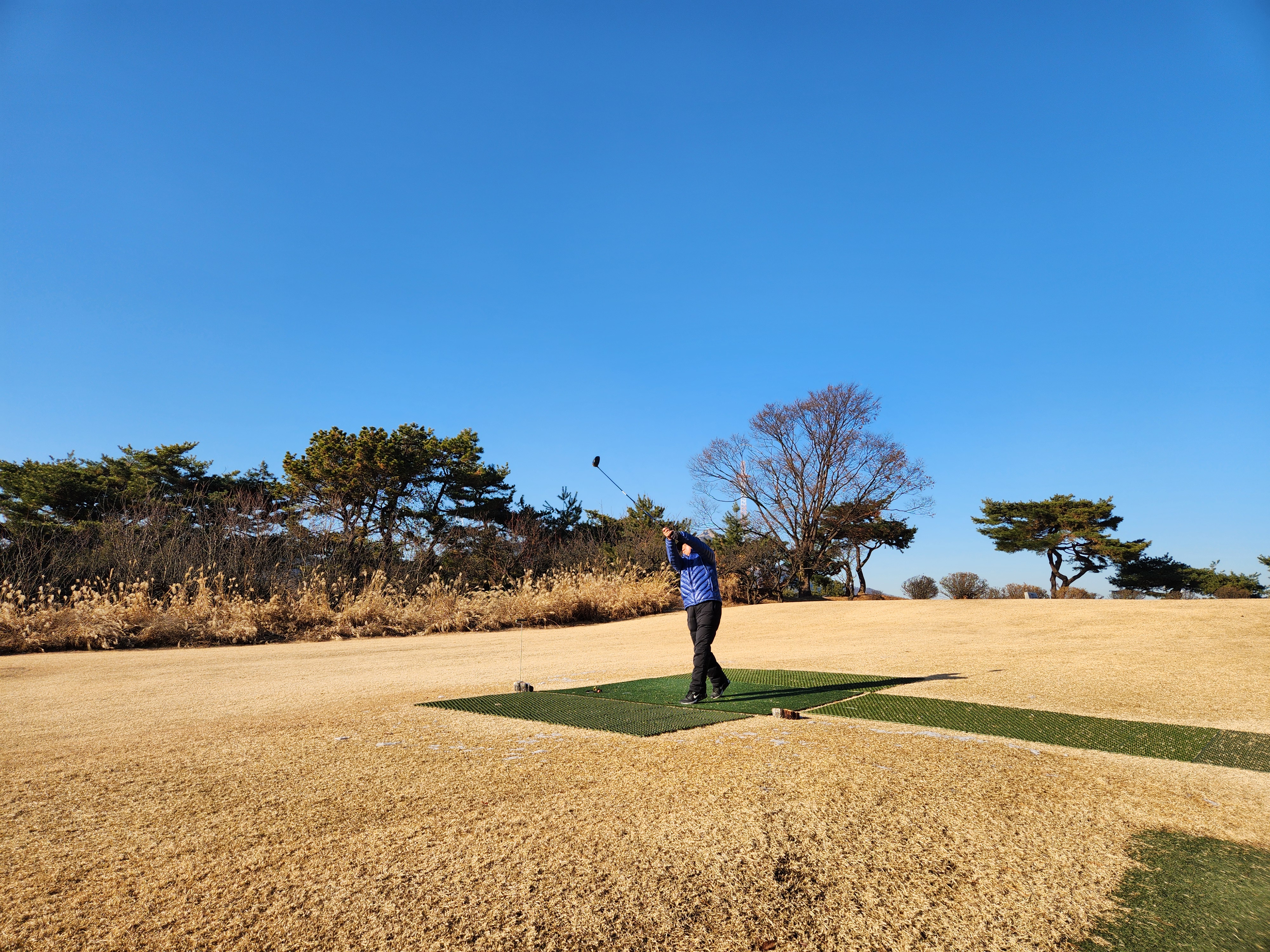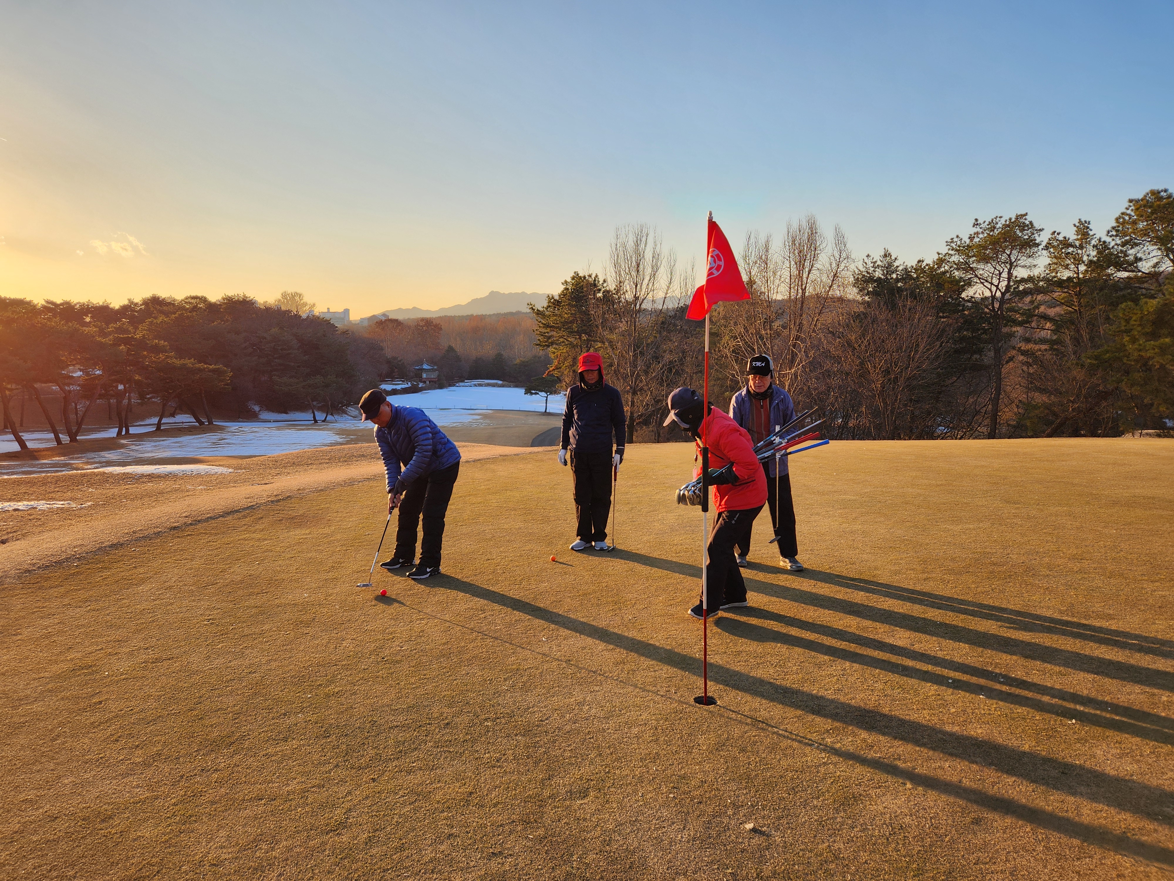 겨울에 만나기 어려운 푸근한 날이다. 이전에 내린 눈이 페어웨이와 그린 주변 곳곳에 남아 있지만 play에 지장이 있을 정도는 아니고 빨간 공이라야 잘 보이고 찾기가 쉽다. 덕분에 공 1개로 끝까지 버티었다.