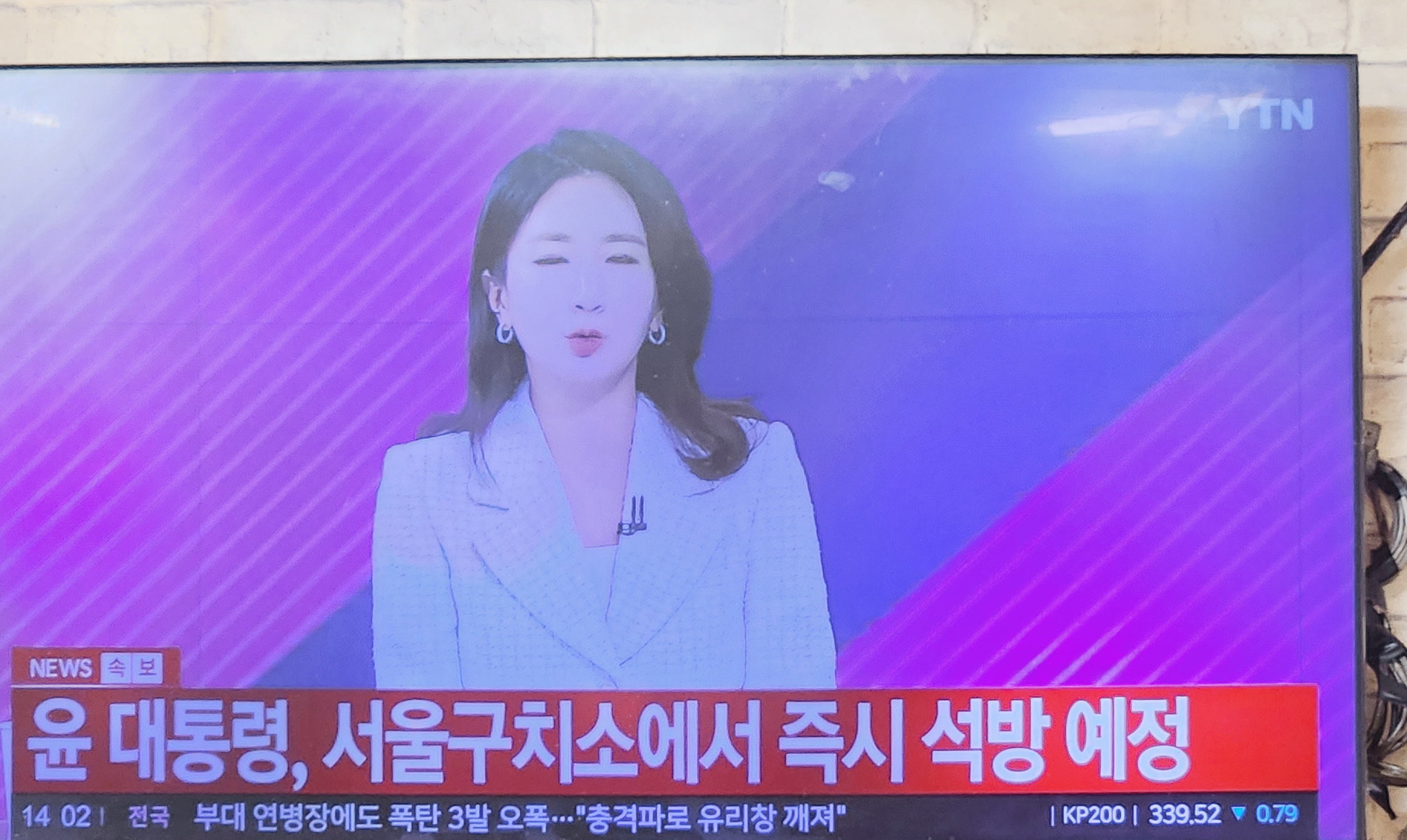 식사중에 TV에서 긴급뉴스가 보도되고 있다.
