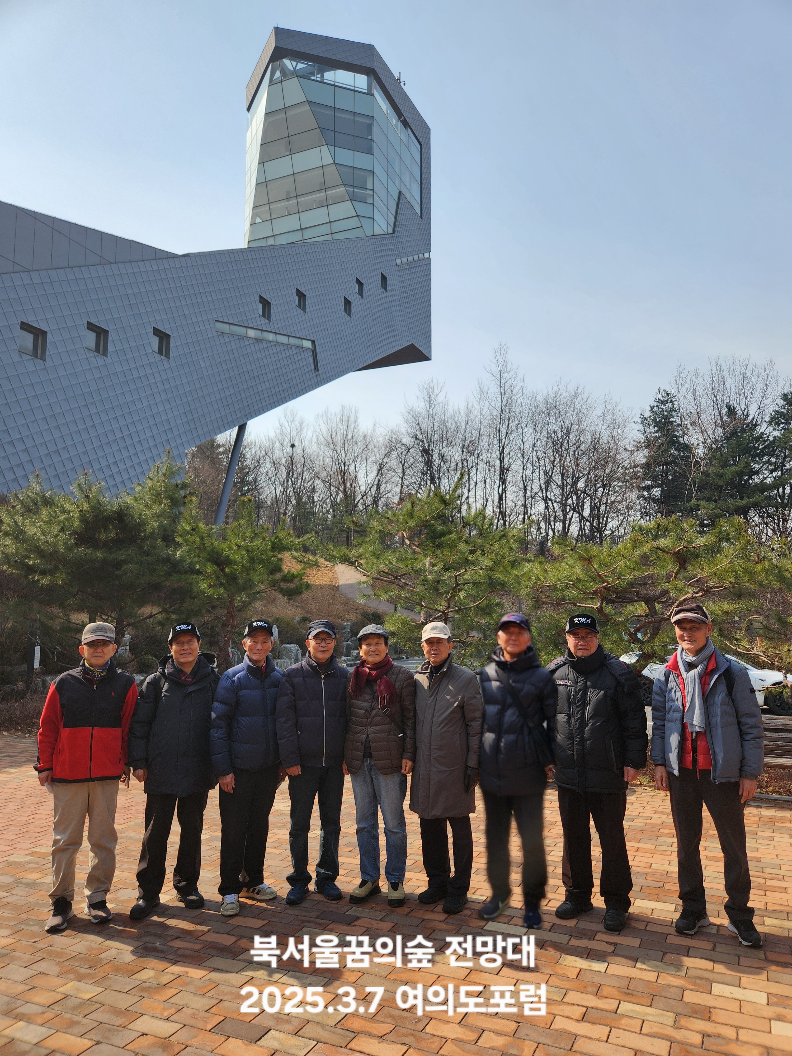 '25.3.7(금) 11시, 미아사거리역 1출구에서 동기회 여의도포럼 9명이 만나 버스로 4정거장, 북서울꿈의숲 서문으로 이동, 전망대에서 주변을 조망하고 차담을 나눈 후 내려와 고지 산책로로 올라 기공체조,