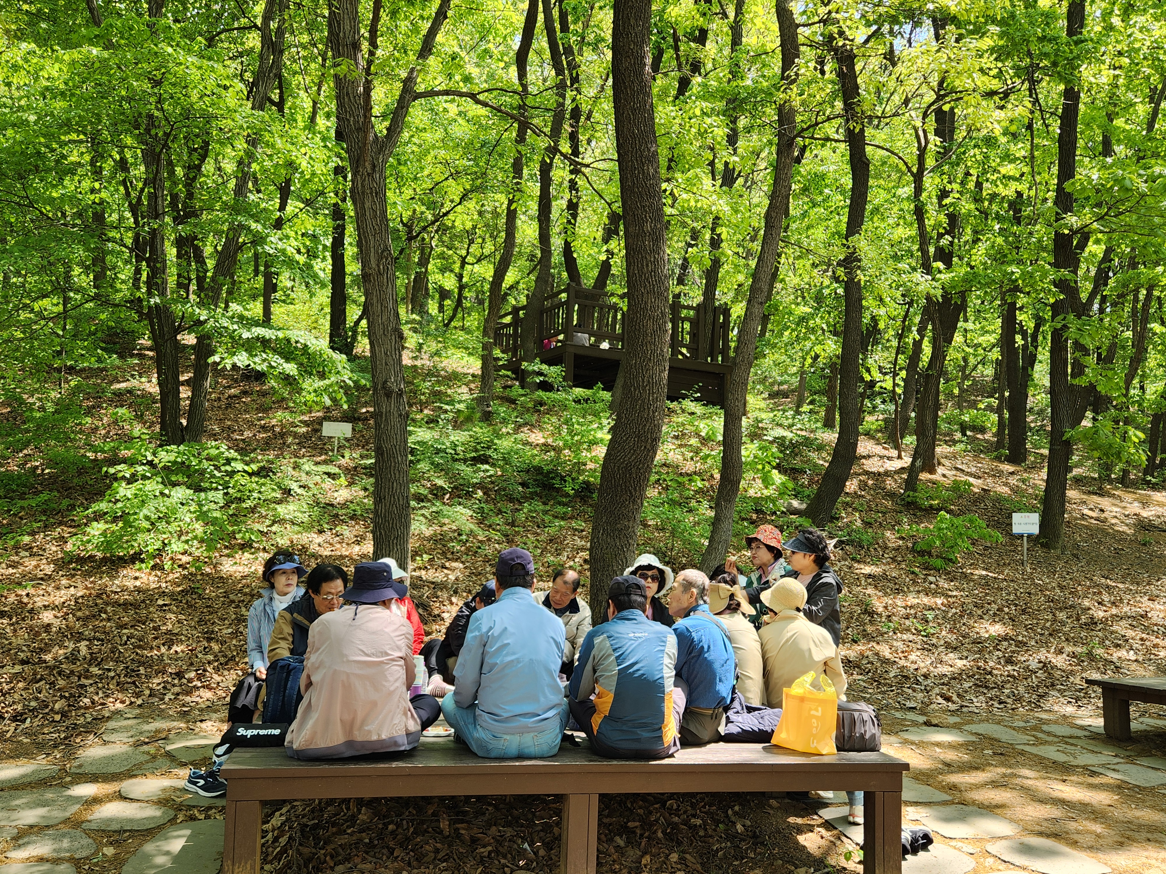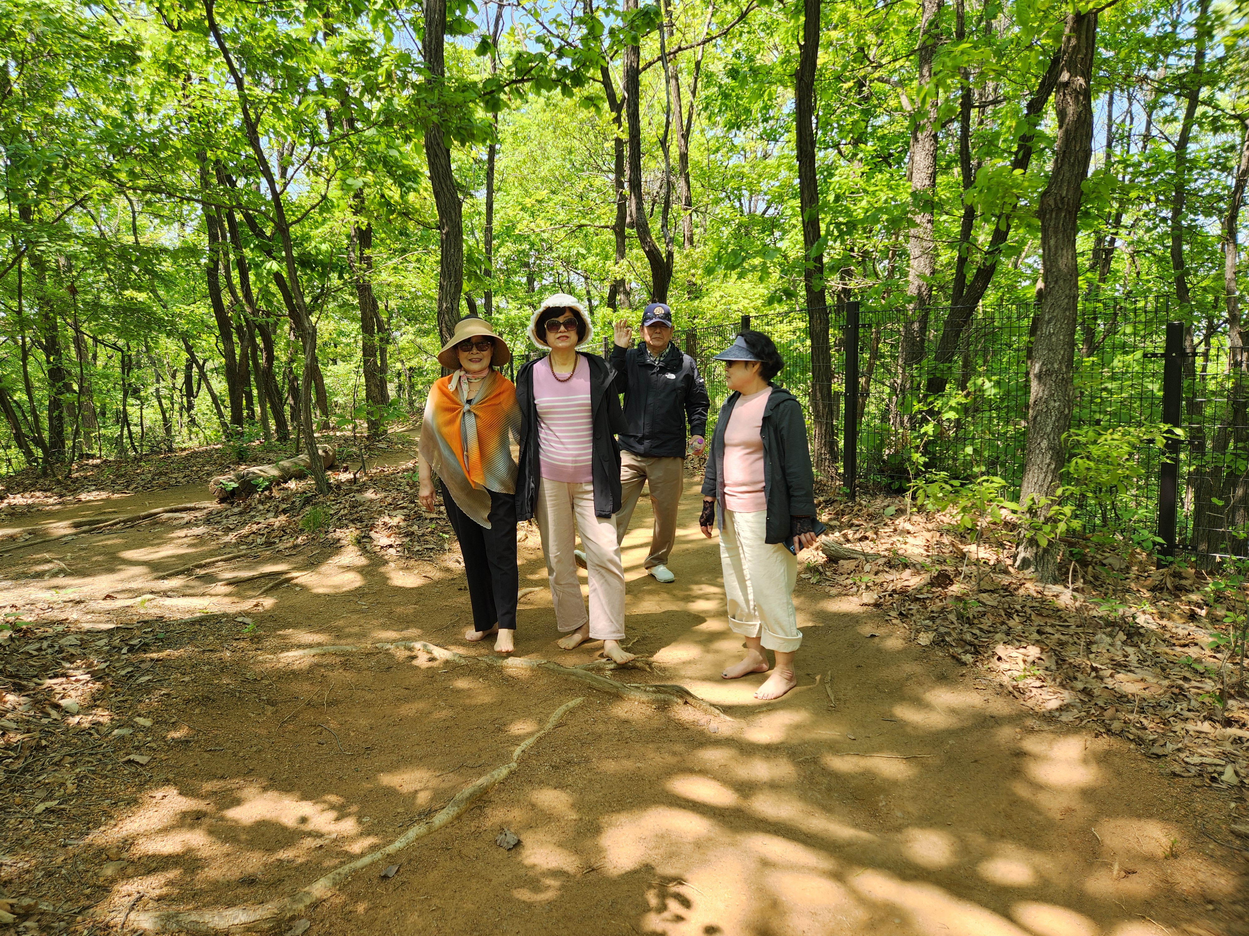 여기저기 예쁜 곳을 배경으로 기념촬영을 하면서 숲쪽에 평상으로 가서 둘러앉았다. 따끈한 커피와 간식타임이다. 싱그러운 참나무그늘에 앉으니 정화된 공기와 신선한 산소, 피톤치드가 몸과 마음을 상쾌하게 해준다. 살아서 천국이 바로 여기다.