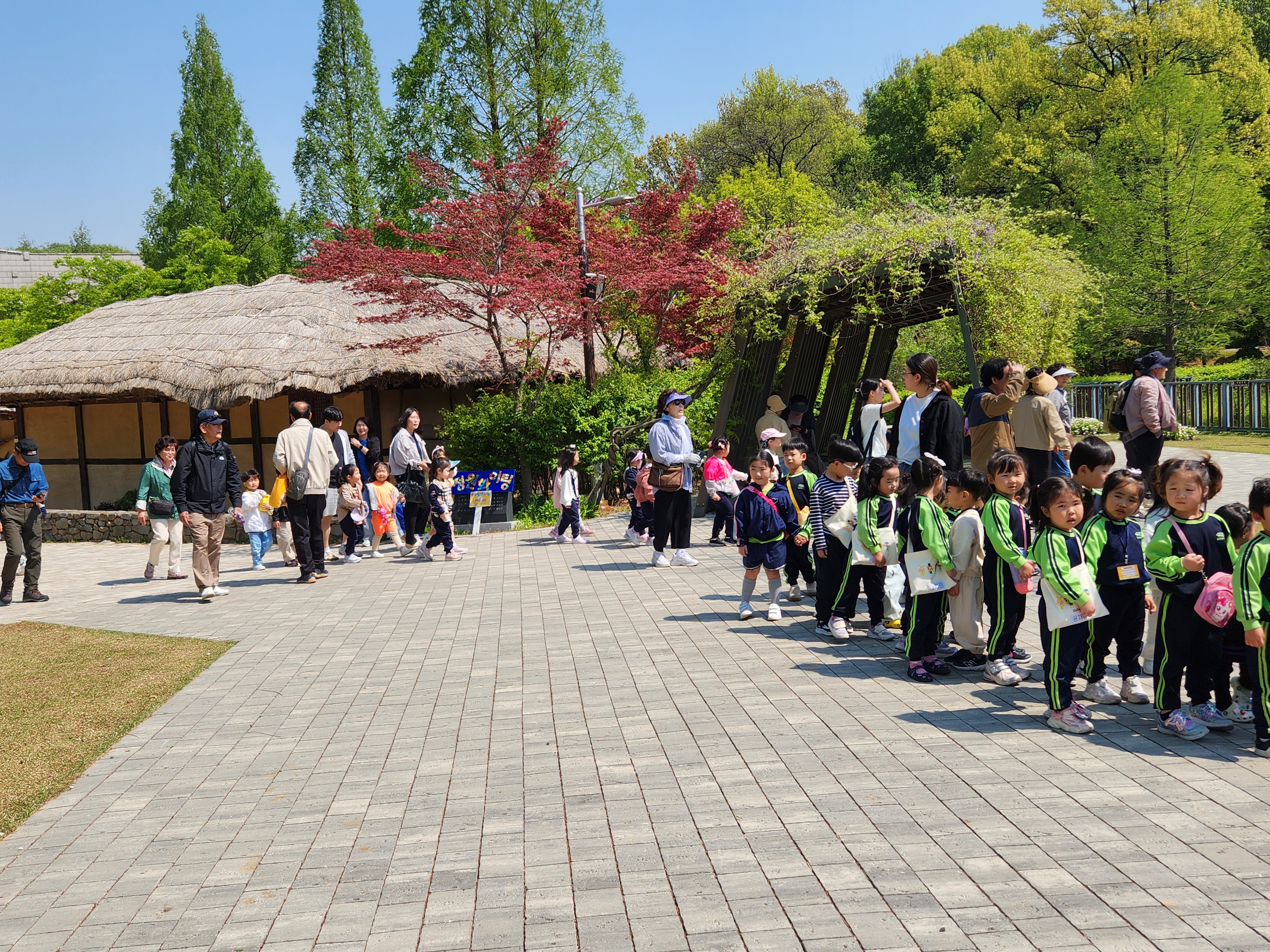 7호선 까치울역에서 10시반에 만나 600m 정도 걸어 생태공원 튤립과 무릉도원 수목원을 돌아본다. 경로는 무료입장이다. 초가집과 빨갛고 노오란 튤립꽃이 조화를 이루고 있다. 어른들도 많지만 유아원, 유치원생들이 엄청 많다. 아이들이 꽃이다. 꽃보다 예쁘고 보는것 만으로도 괜히 웃음이 나온다.