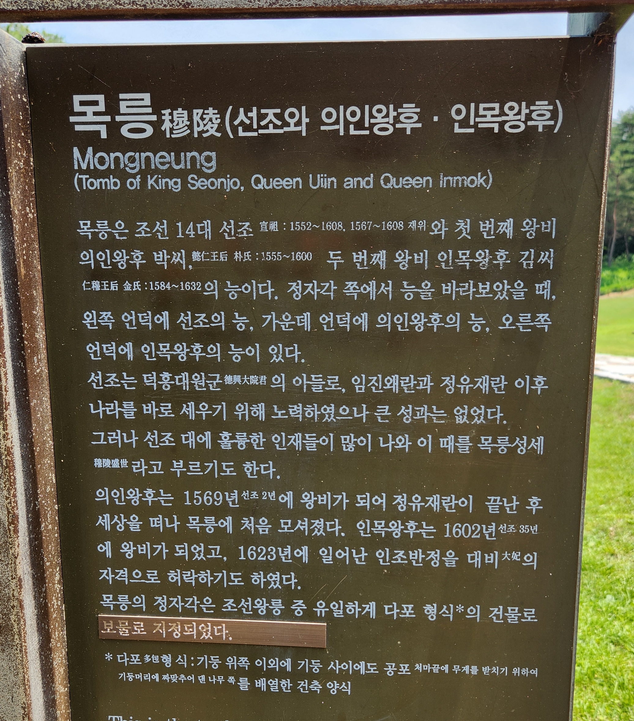 건원릉 오른편에 있는 목릉으로 향한다. 목릉(穆陵)은 '신의 정원'으로 조선 14대 왕 선조와 의인왕후, 인목왕후가 묻혀있다. 선조 하면 임진왜란이 먼저 떠오른다. 왜군이 부산에 상륙해 파죽지세로 북상하자 보름만에 신하들의 반대에도 불구하고 피란을 떠났다. 개경으로, 평양으로, 의주까지 피신했다. 조선 왕 중 세번째로 긴 41년간 나라를 다스리는 동안 이황, 이이, 허준 등 걸출한 인재들을 다수 배출했지만 국가적 위기에 무능했던 왕이라는 비판을 받기도 했다. 선조는 적통이 아닌 방계 혈통으로 처음 왕이 된 컴플렉스를 극복하지 못한 탓인지 후궁 소생인 광해군을 이미 세자로 책봉해 놓고도 자신이 50살에 18살 밖에 안된 인목왕후를 새로 들여 영창대군을 낳음으로서 훗날 비극의 씨앗을 뿌리기도 했다.