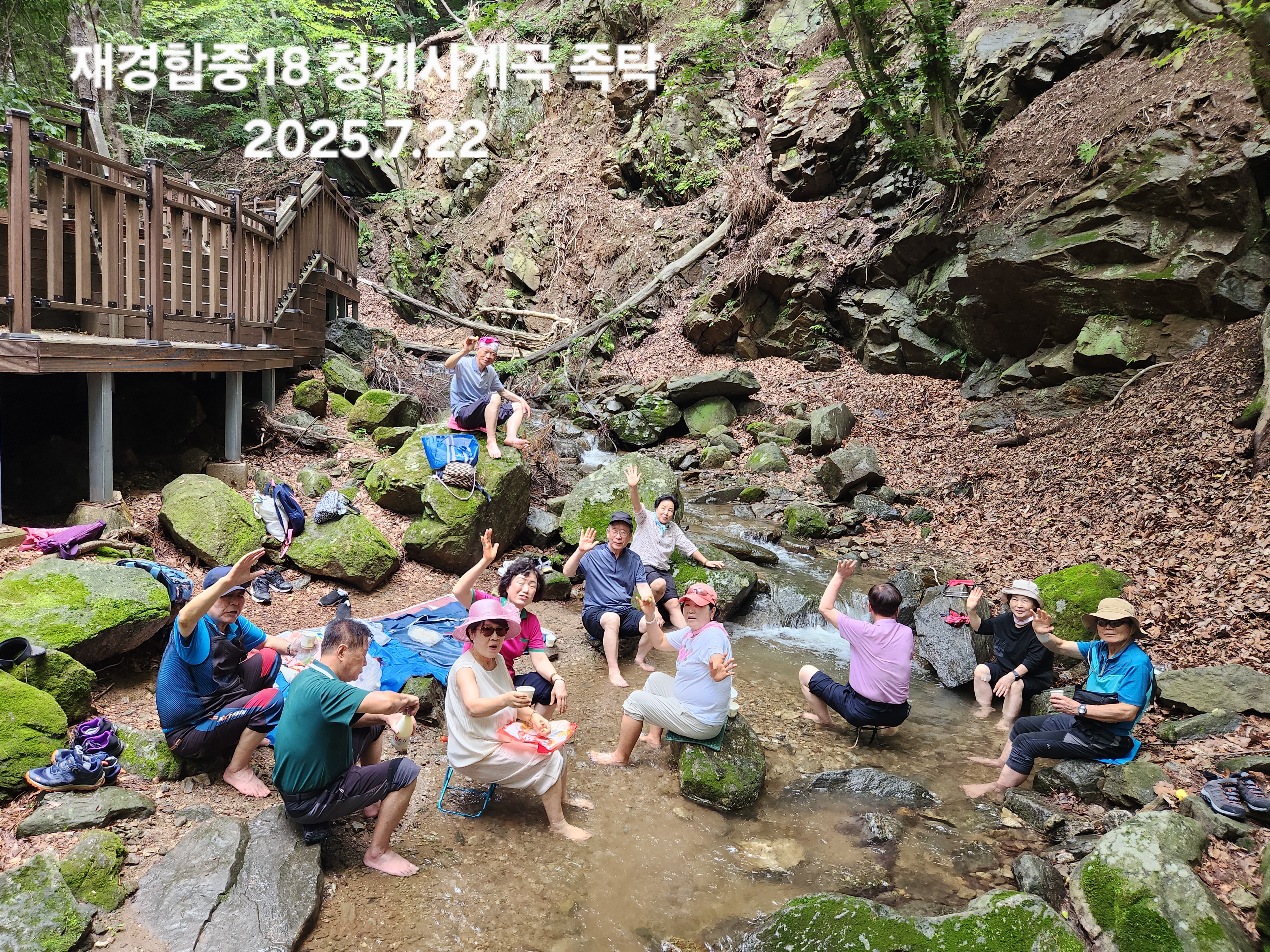 '25.7.22(화) 10:30, 4호선 인덕원역 2출구 지하에서 재경합중18 친구와 가족 12명이 만나 10번버스로 청계사주차장 종점으로 이동, 도보로 10여분 계곡따라 진입하여 널찍한 곳에서 여름나기 족탁