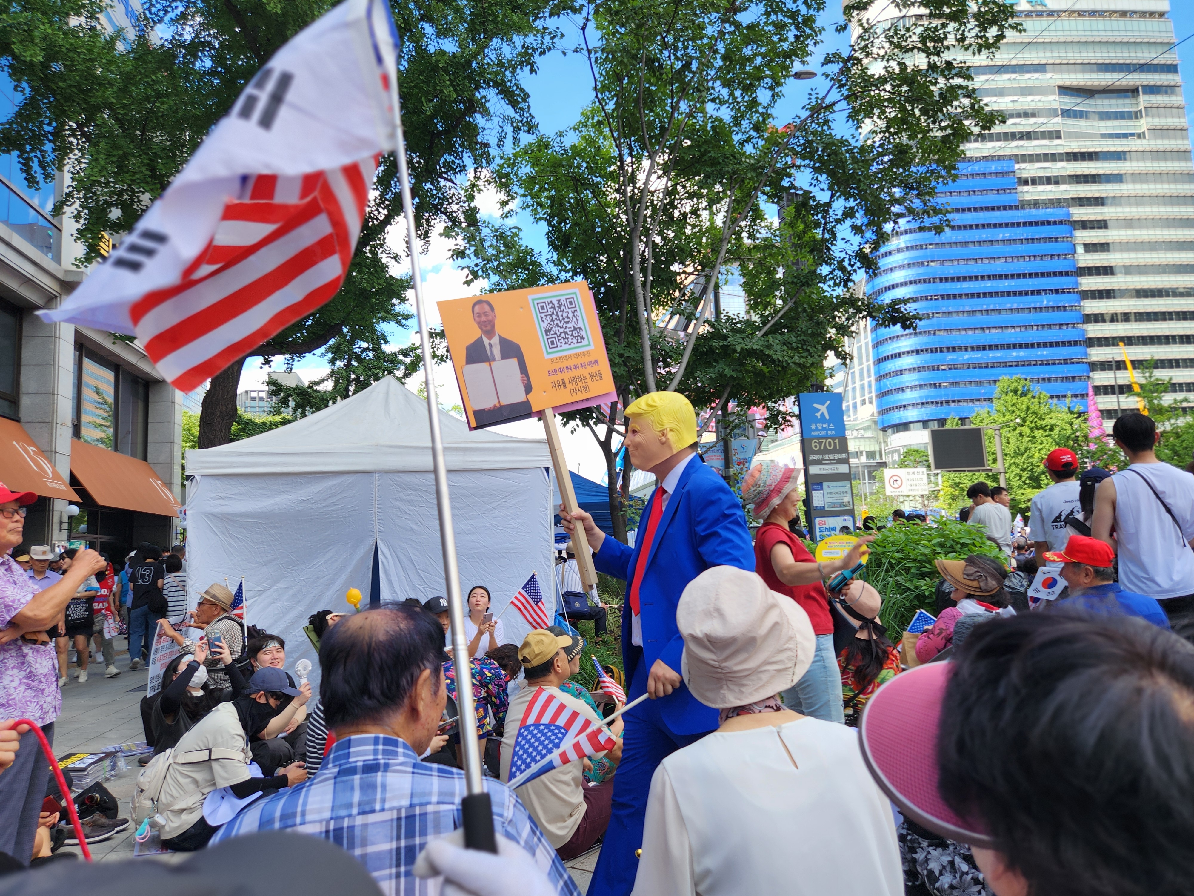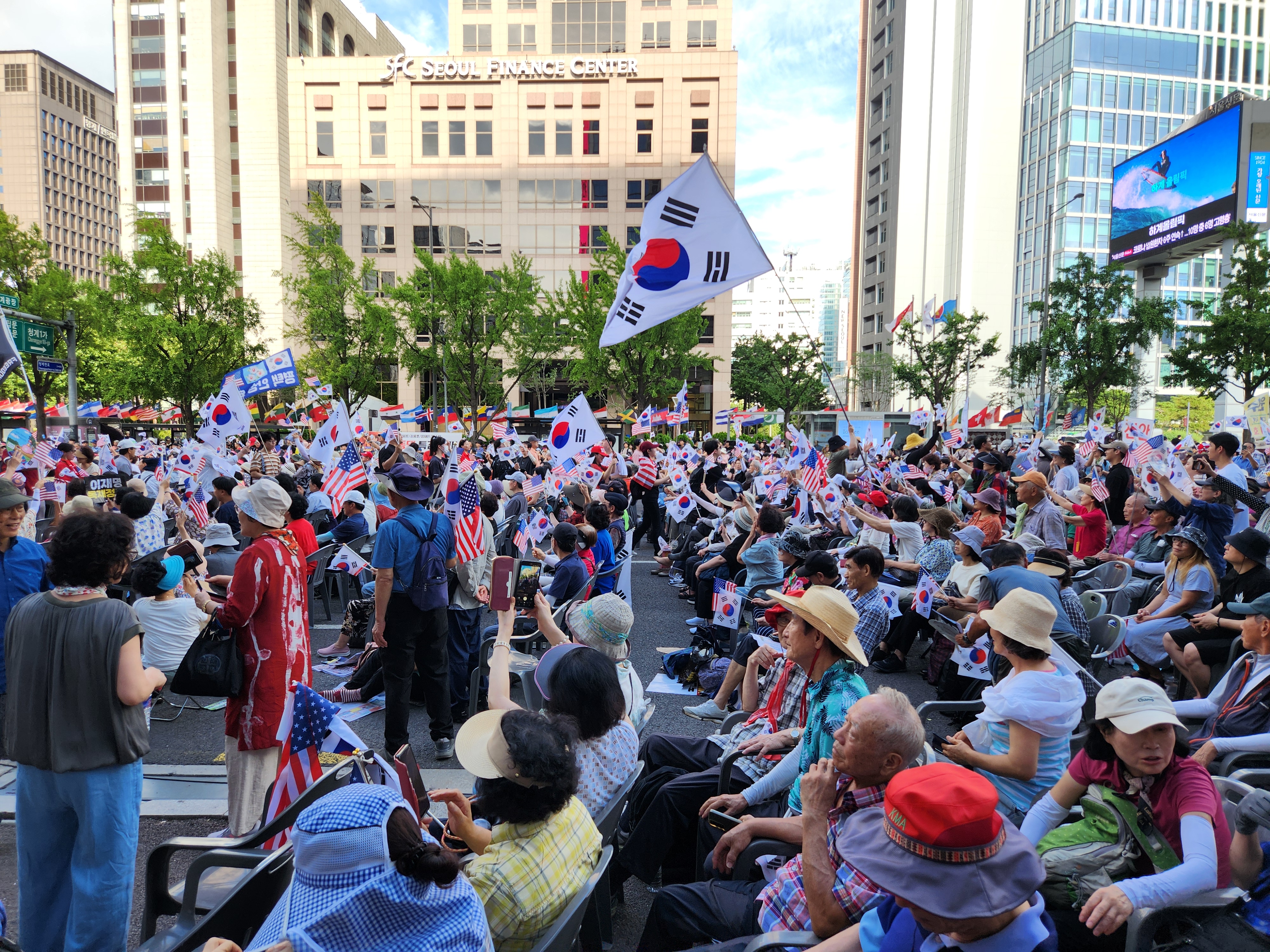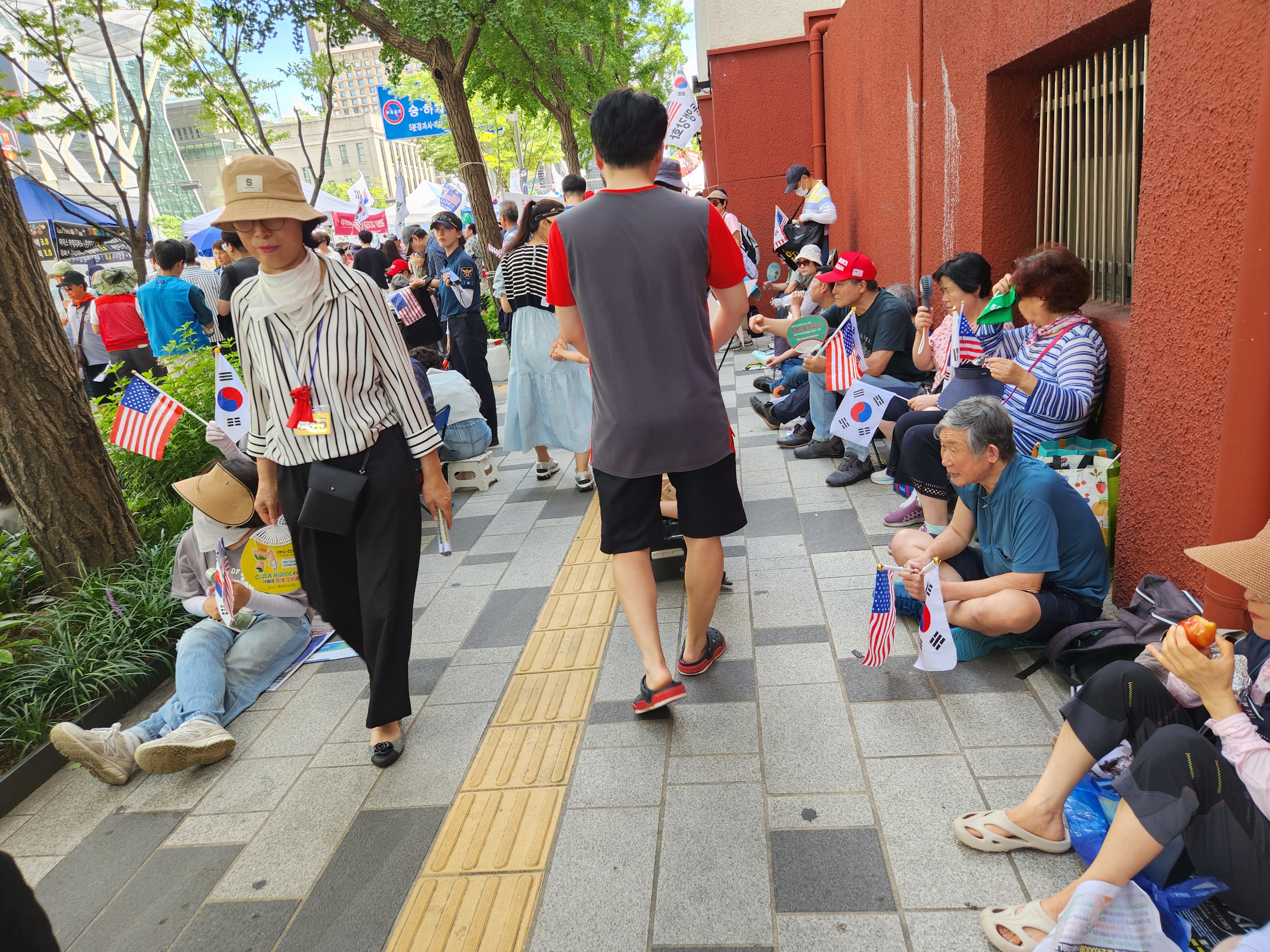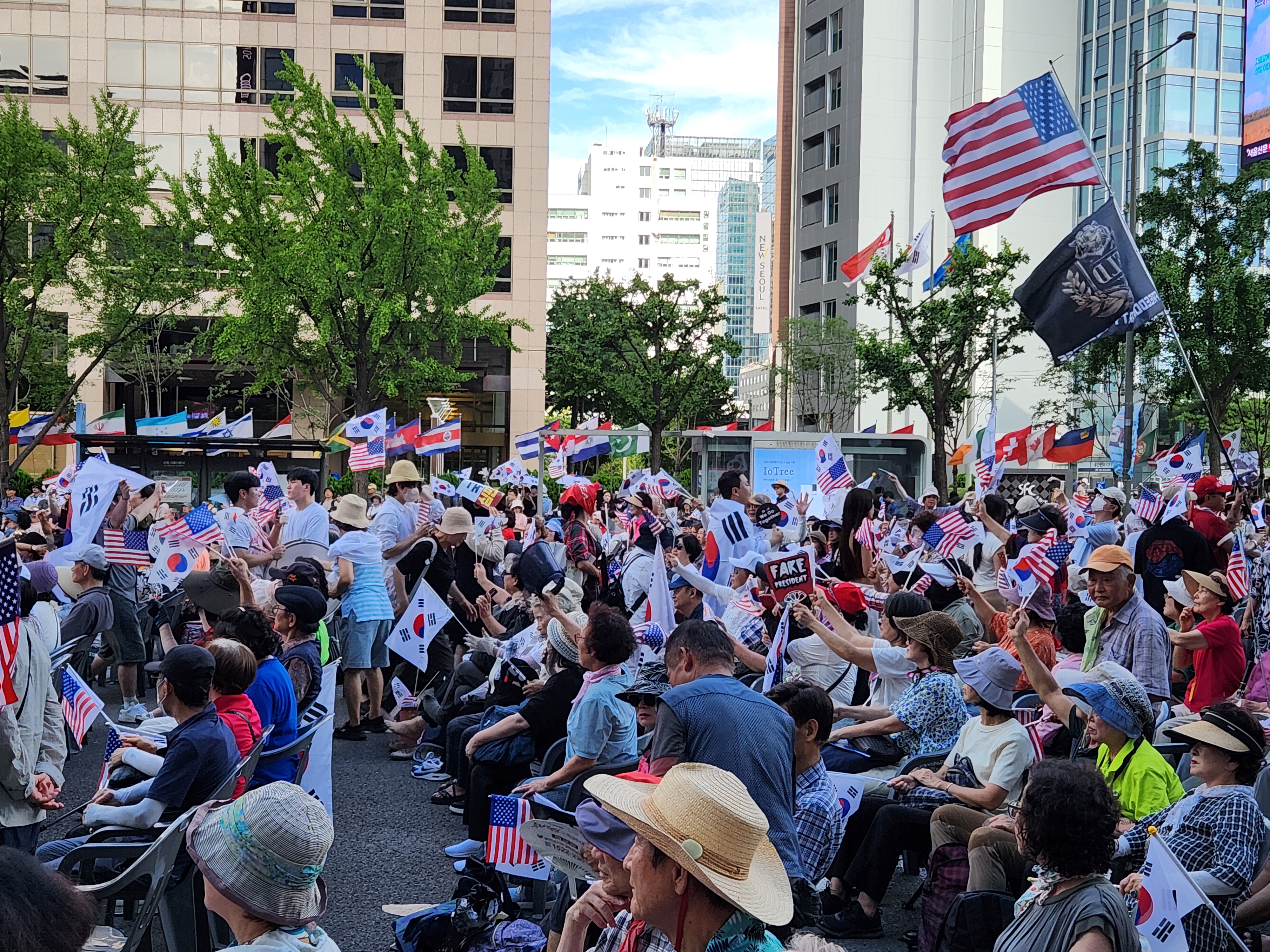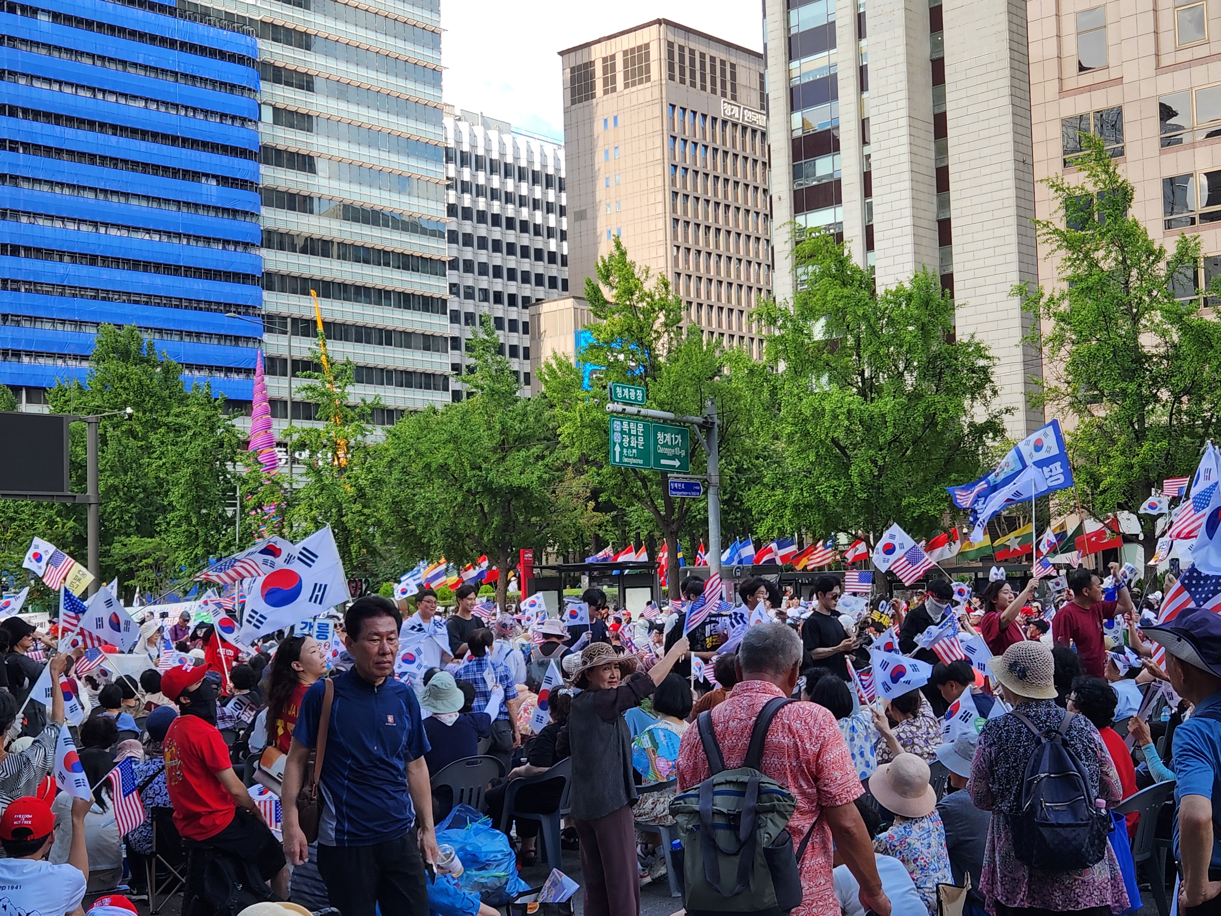 골목골목 나무그늘 빈틈마다 사람들이다. 세종로 넓은 차선 동쪽편은 차량통행이 되다가 군중이 워낙 많아 15시경 전체 차선을 다 열었다. 북쪽으로는 세종대왕상으로부터 남으로 덕수궁까지, 청계광장도 골목, 도로마다 태극기, 성조기 물결로 가득찼다. 100만~200만 될 듯 하다고 사회자가 말한다.