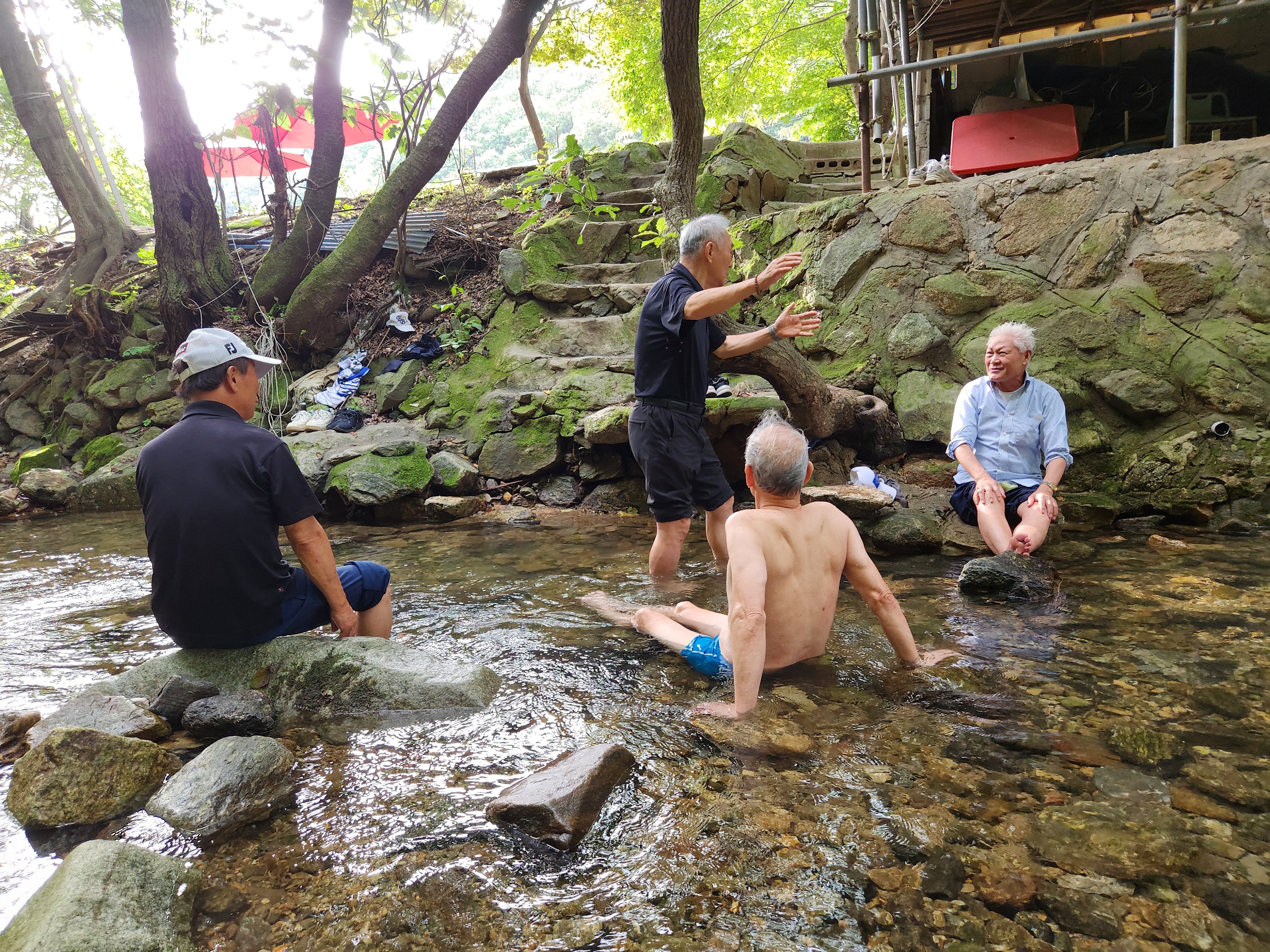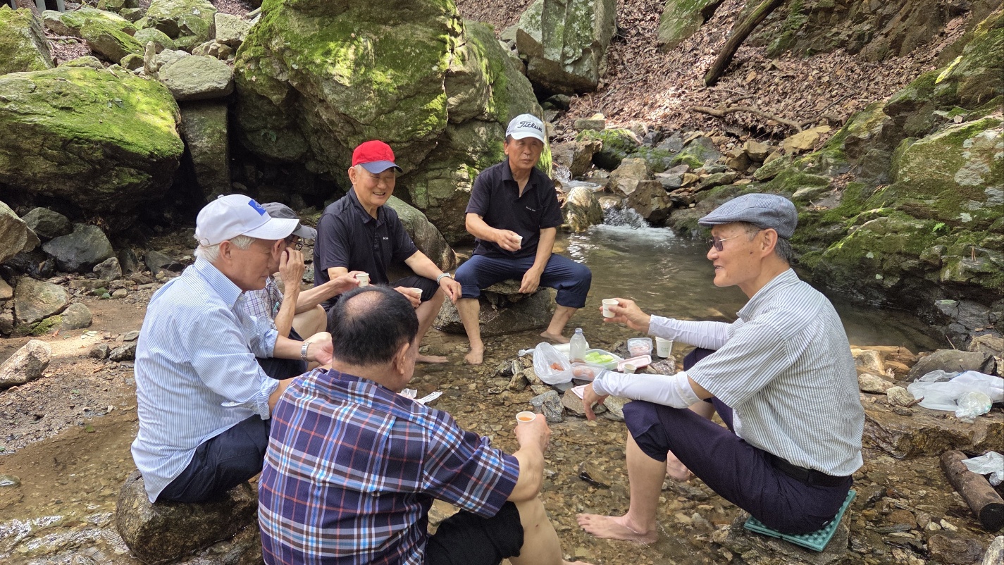 '25.8.20(수) 10:30, 4호선 인덕원역 2출구 지하에서 전씨종친회 웰빙산행 7명이 만나 10번버스로 청계사입구 종점으로 이동한 후 걸어서 10여분, 계곡에서 여름나기