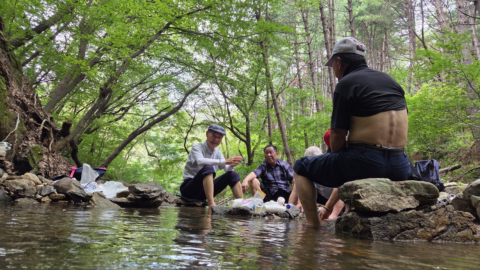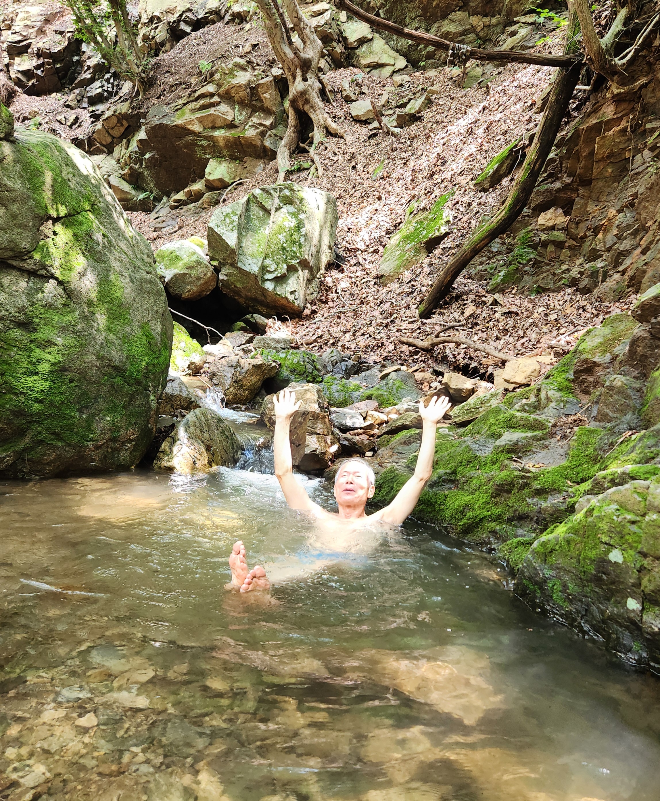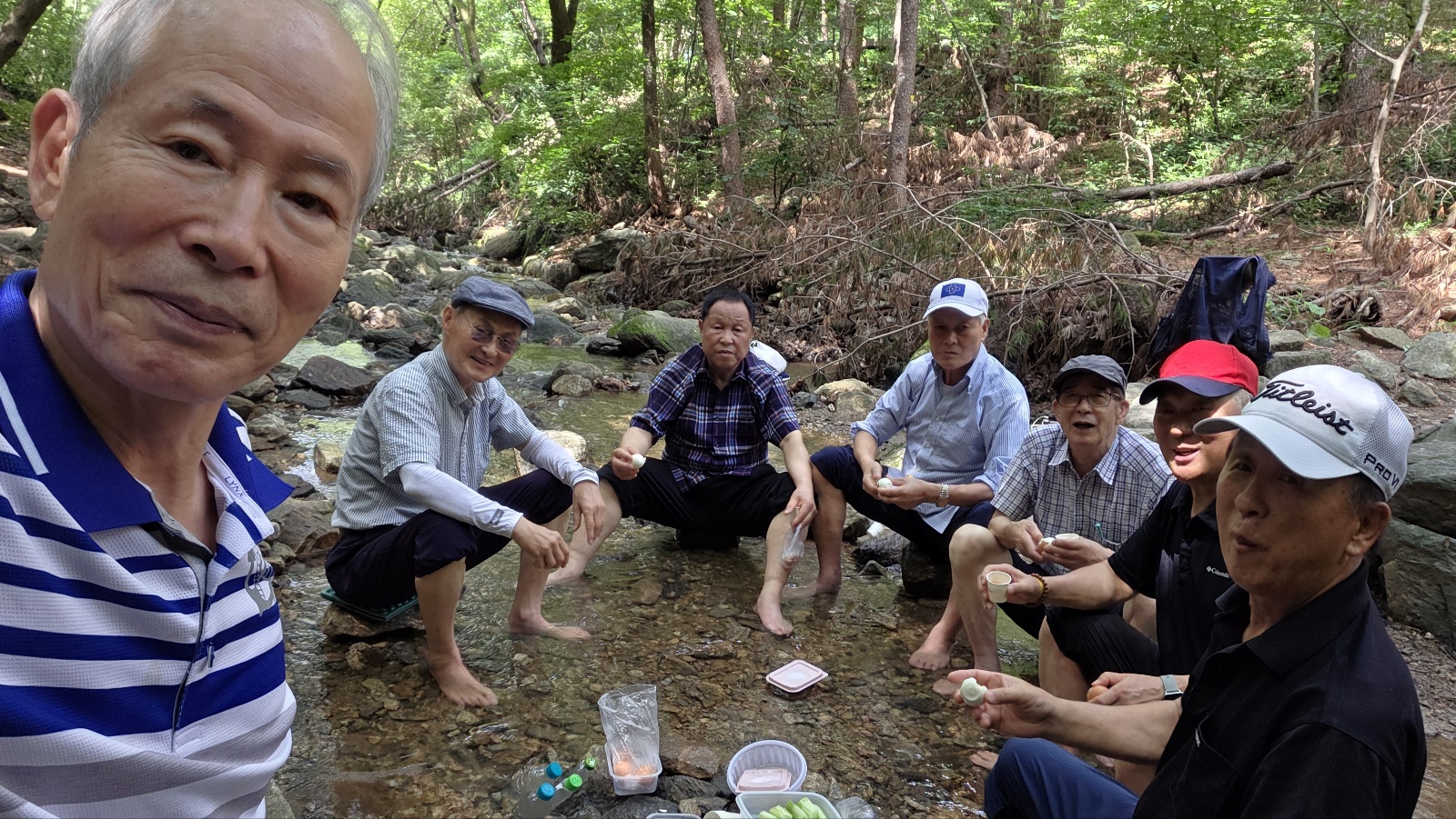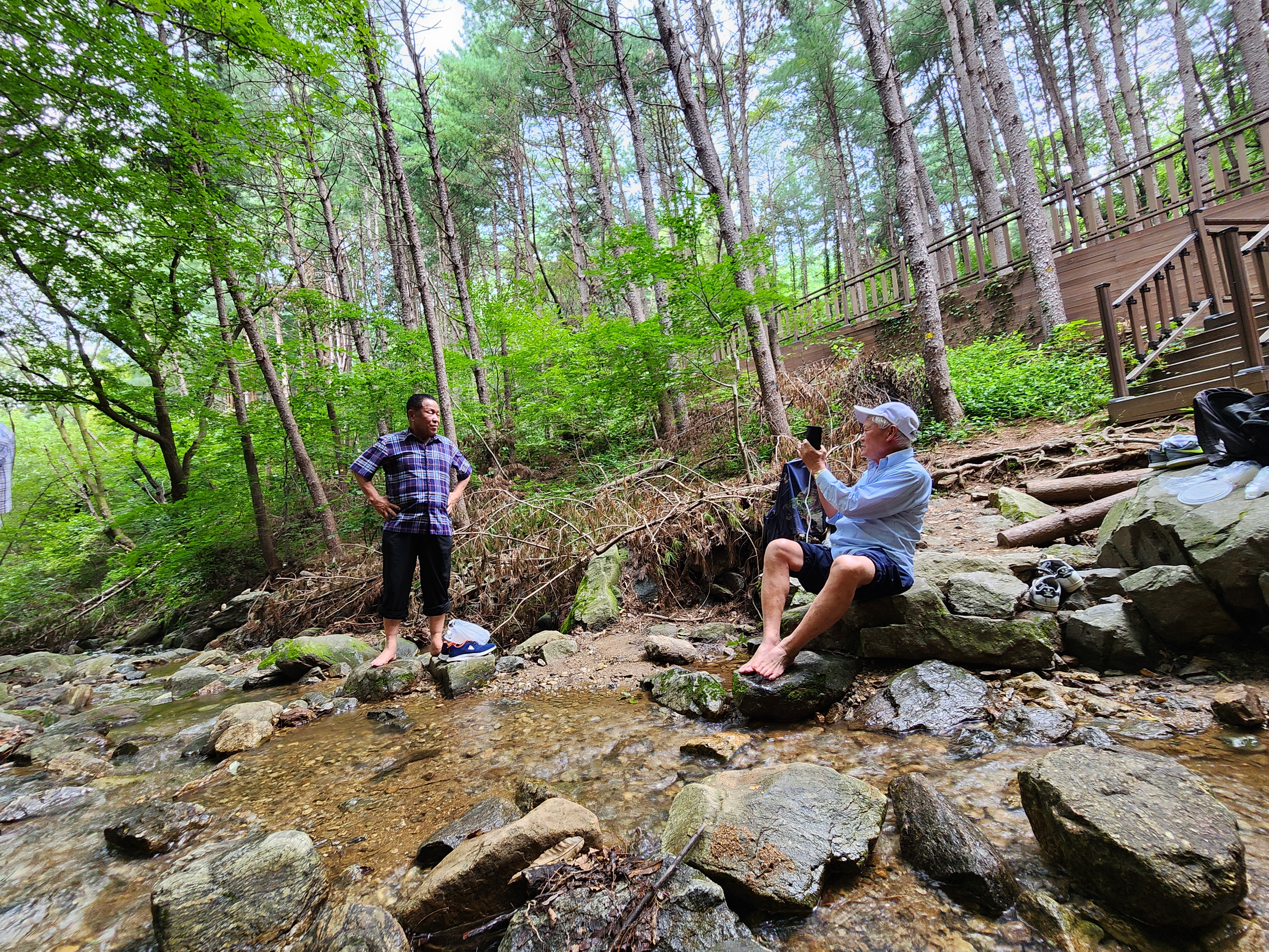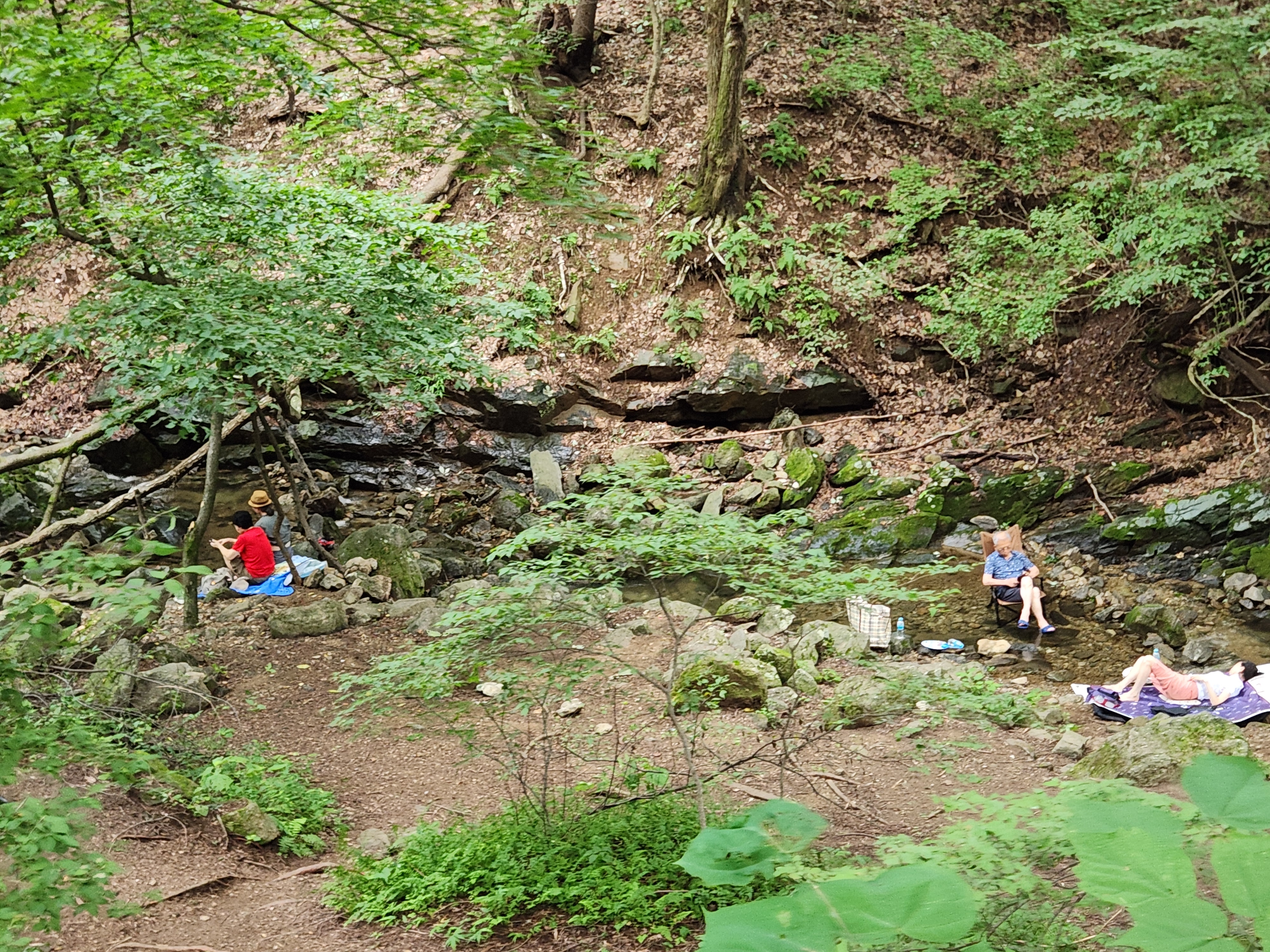 위쪽 계곡에 도착, 냇물에 발담그기