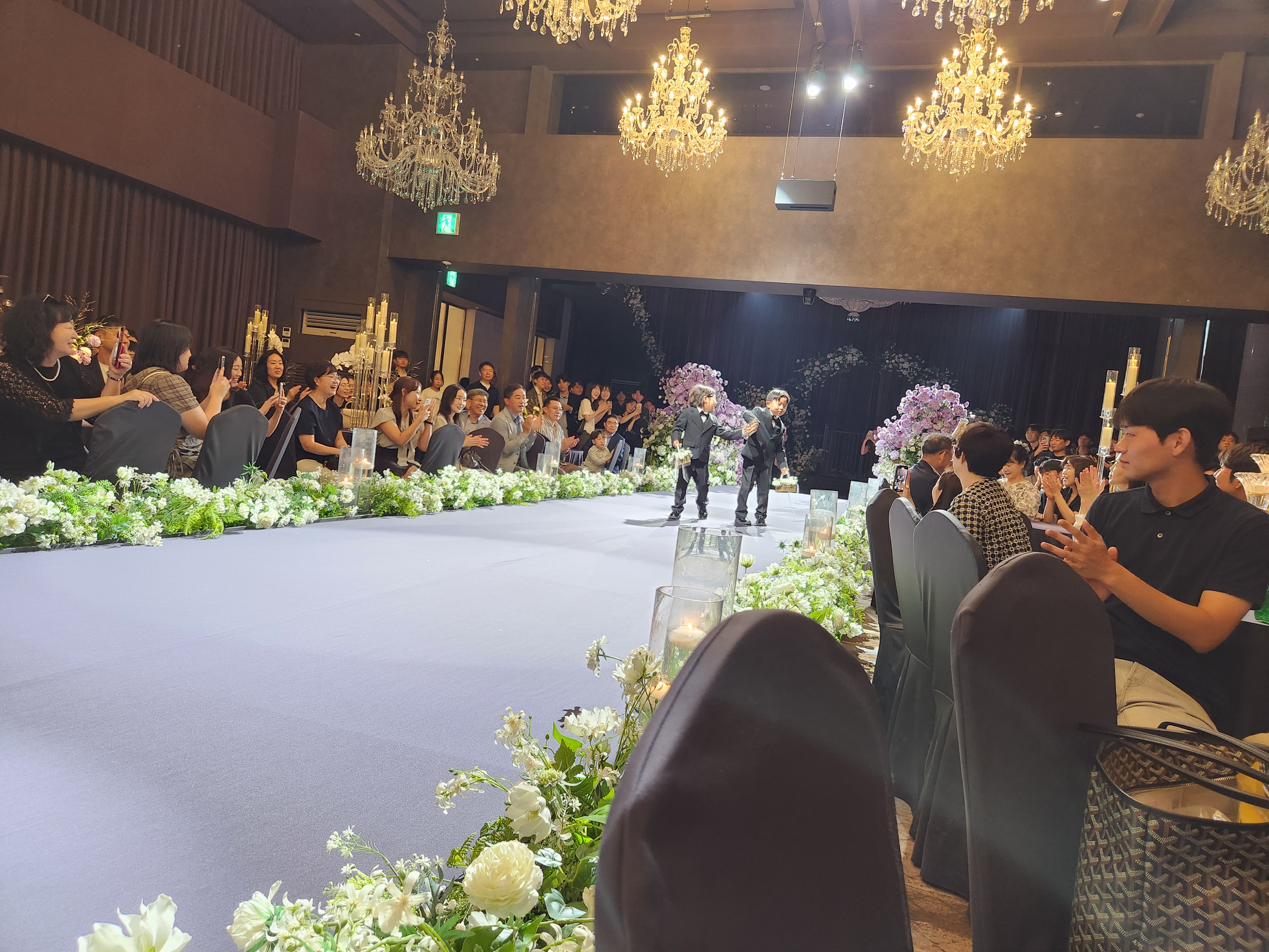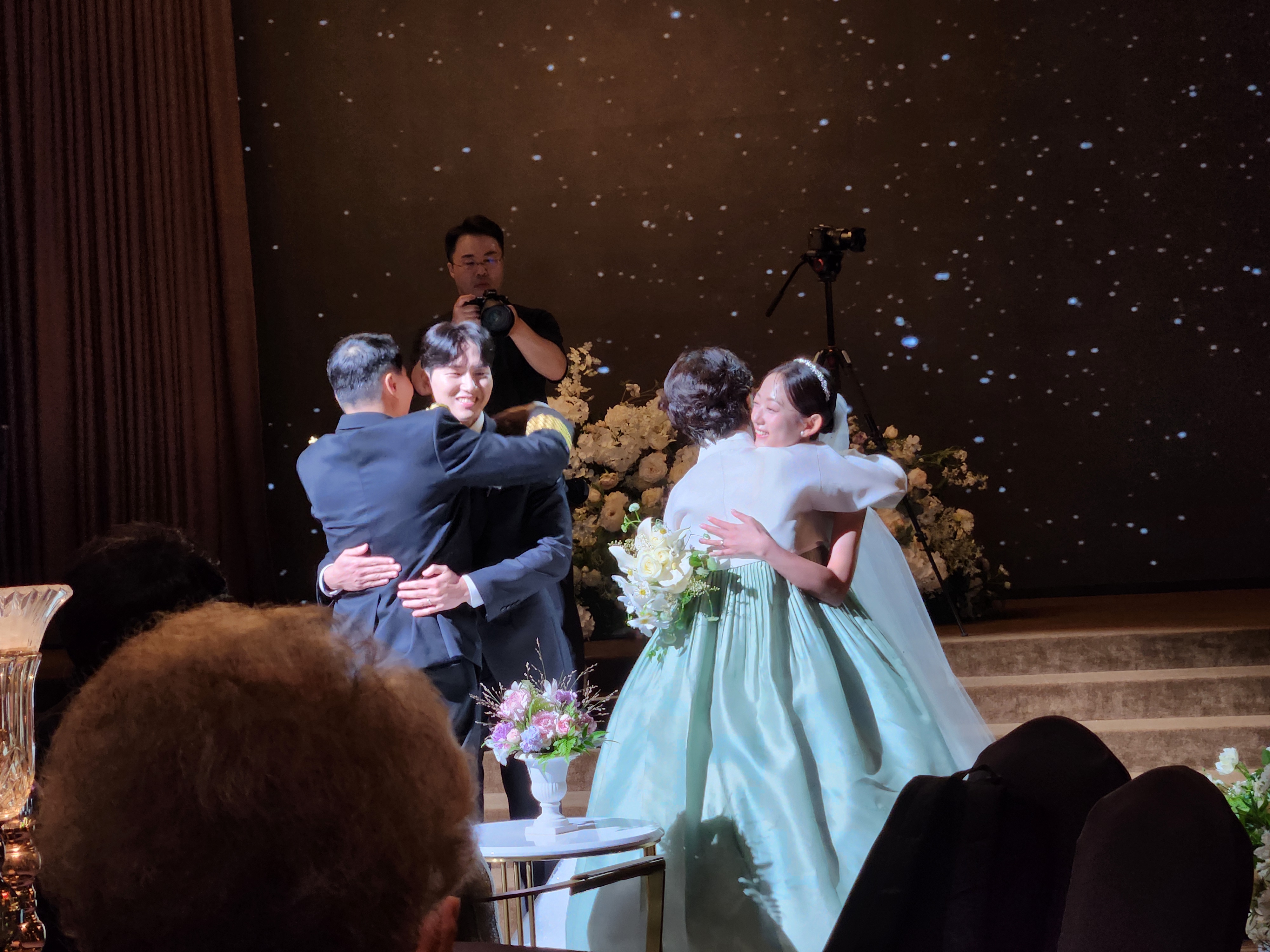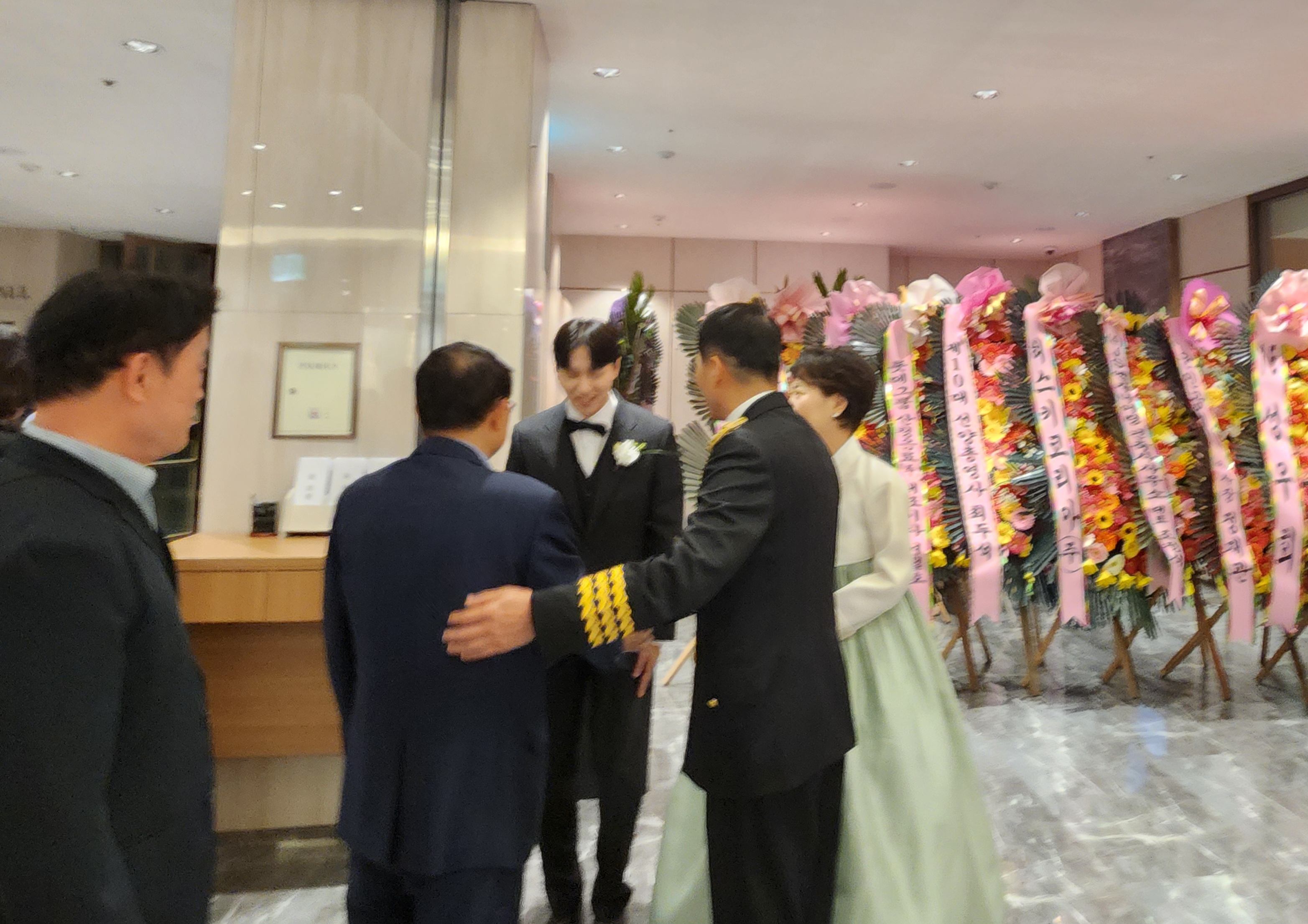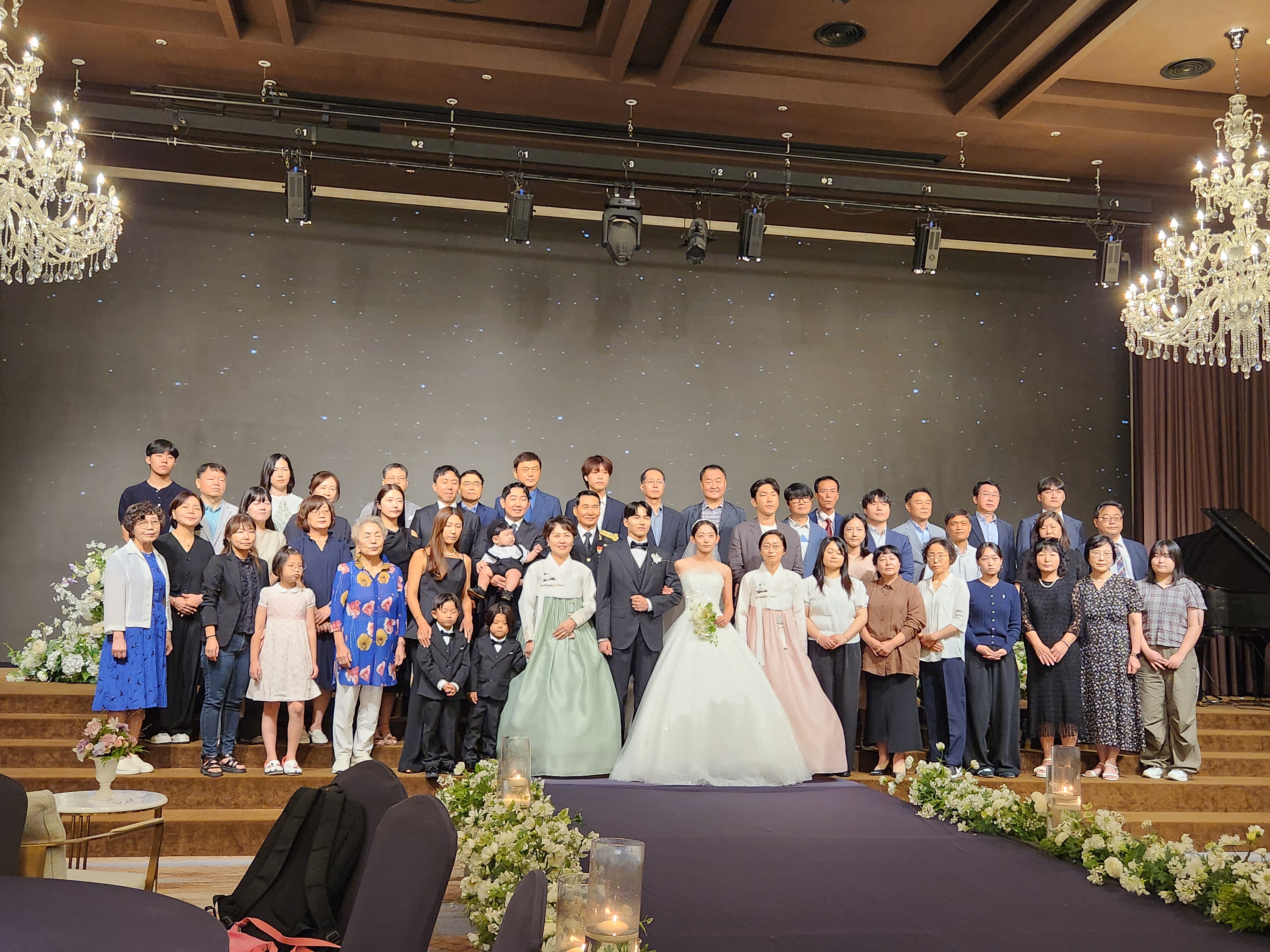 '25.8.31(일) 11시, 로얄파크 컨벤션 3층에서 공병후배 이동훈장군(서명주여사)의 아들 정 협군이 박선 희양을 신부로 맞아 결혼식을 올리는 8월의 마지막날 주말, 일요일 귀한 시간인데도 많은 하객들과 친지, 신랑신부의 싱싱한 친구, 직장동료들이 넓은 홀에 가득하도록 많이 참석하여 축하를 보내주었다.