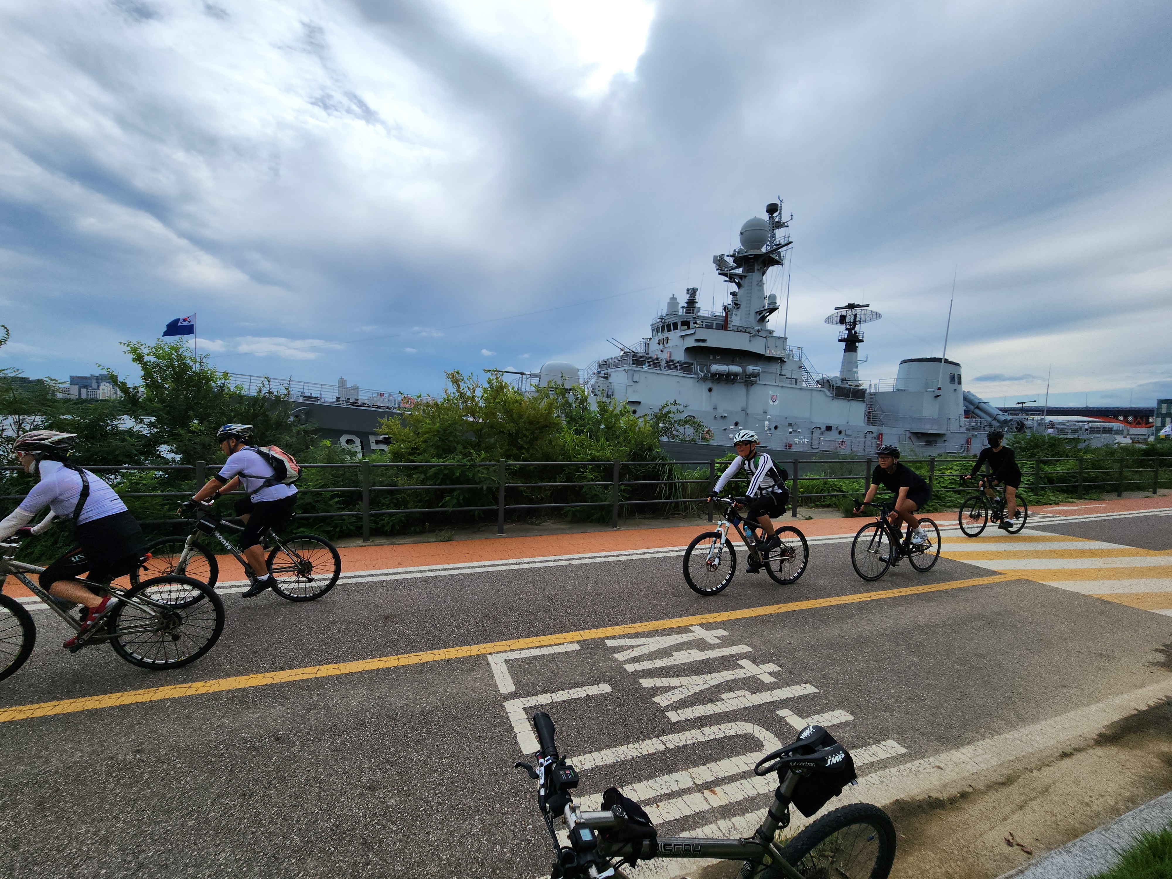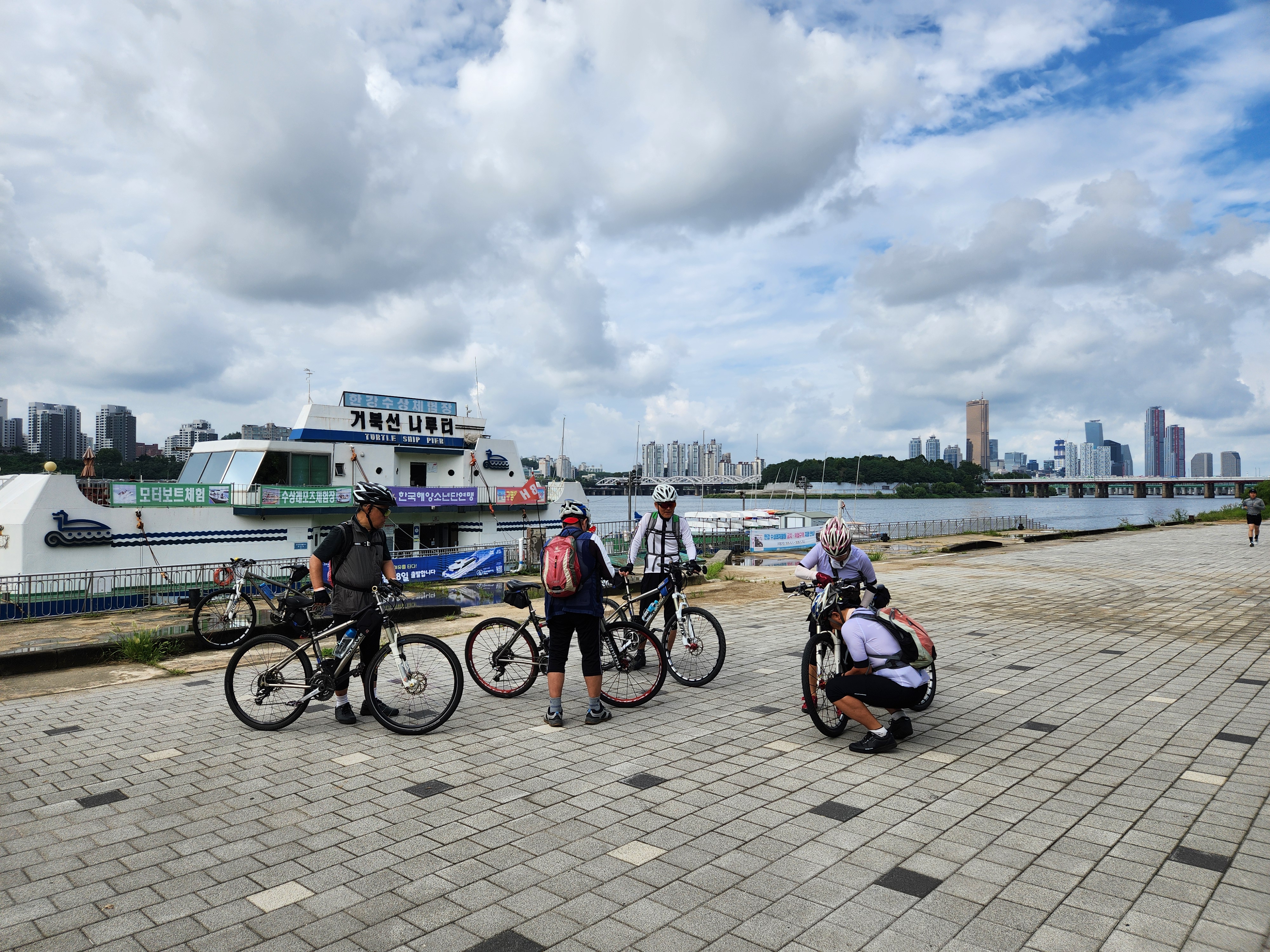 잠수대교를 출발하여 한강대교 못미쳐 거북선나루가 있다. 19년전에 4명이 첫 모임을 시작했던 곳이라 해마다 그 자리에서 기념촬영을 한다. 손창인대장 덕분에 퇴직 후에 늦게 자전거에 입문하는 기회가 되었고 전국 곳곳 좋은 곳으로 유람을 많이 다녔다. 자전거를 기차에 싣고 부산으로 가서 배를 타고 대마도 원정까지 다녀왔다. 함께 활동하다가 먼저 떠난 친구들이 아쉽게도 벌써 대여섯명이나 된다.