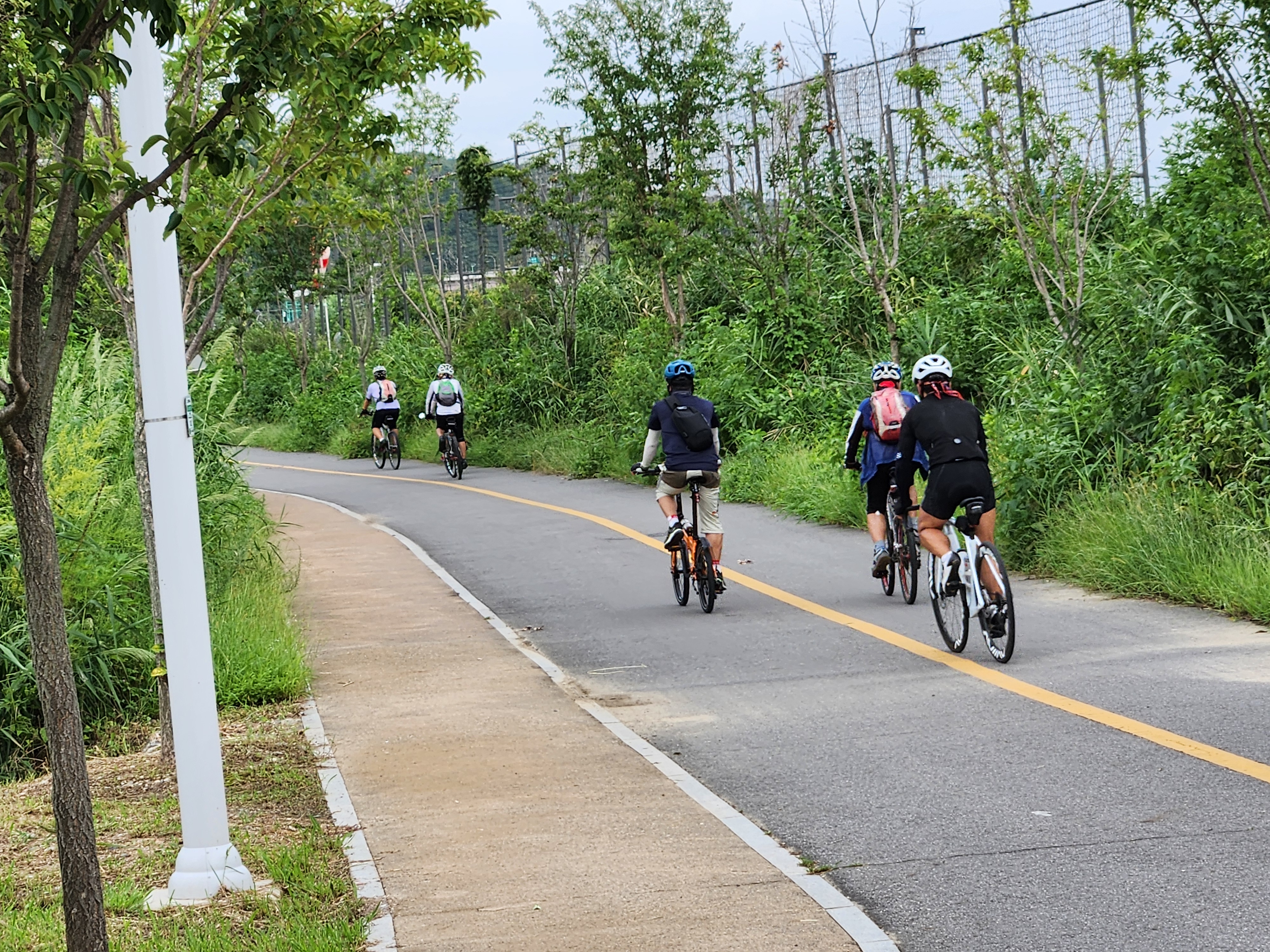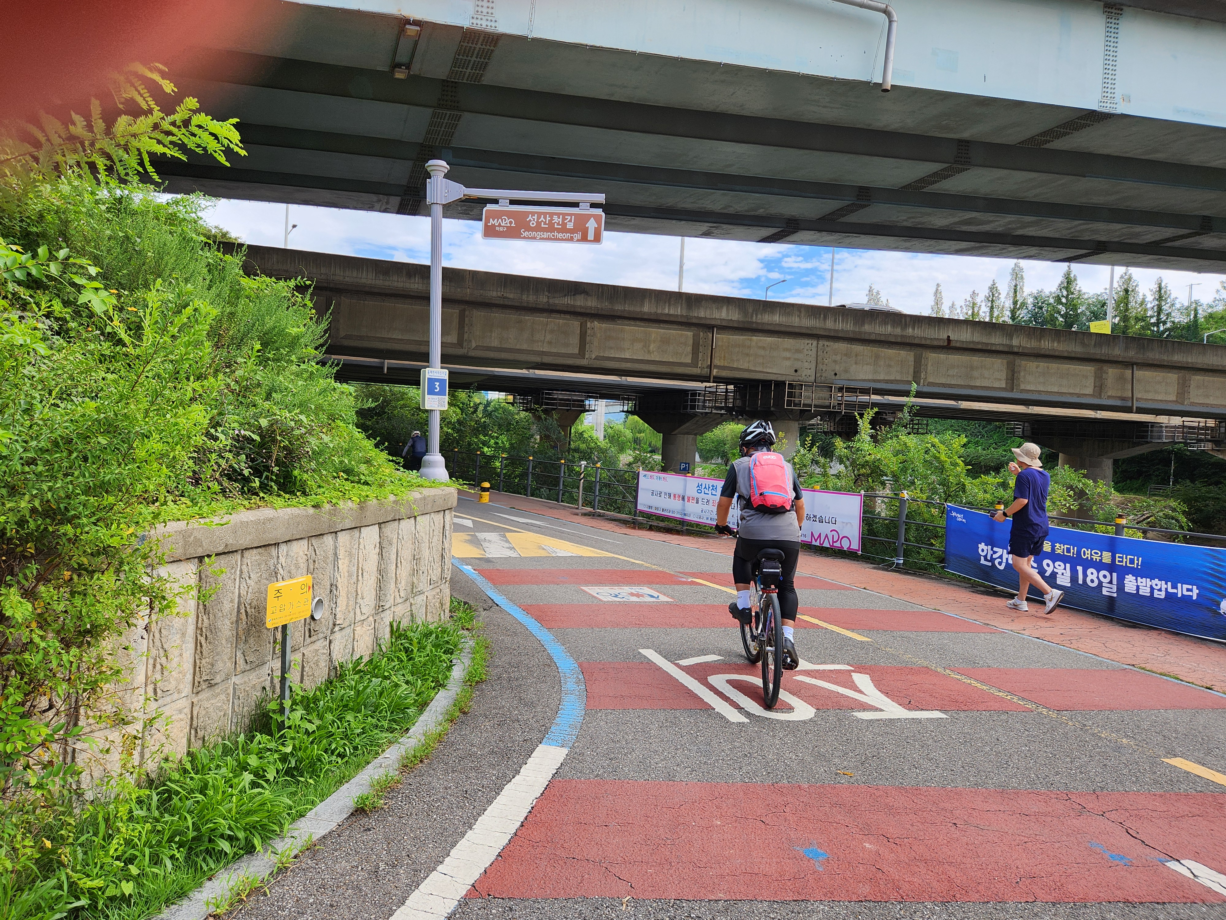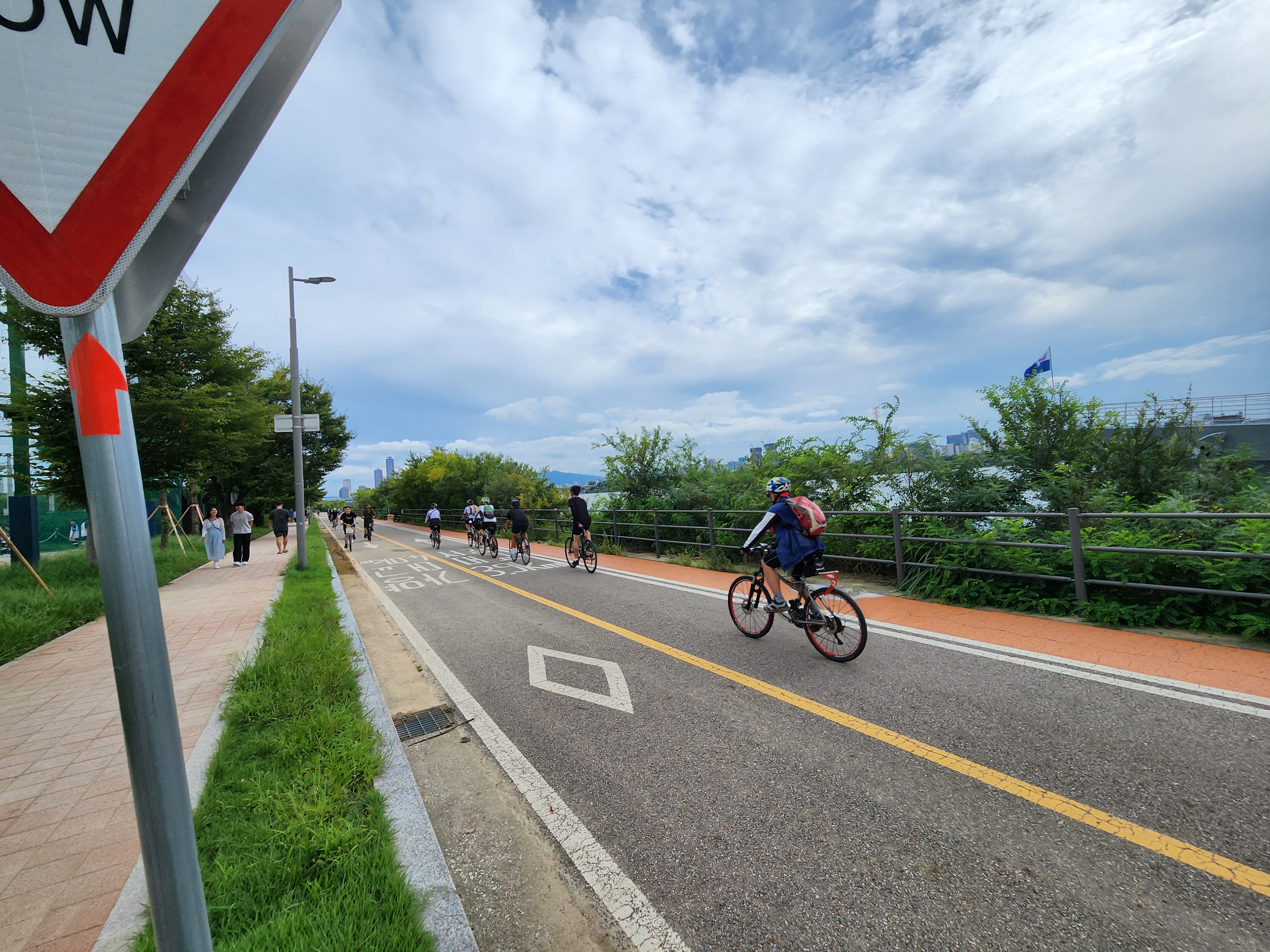 잠수교남단에서 09:20에 만나 한강과 남산을 배경으로 현수막을 걸고 기념촬영 후에 북단으로 이동, 한강 하류를 따라 라이딩을 시작했다. 한강은 서울의 보배이고 대한민국의 자랑꺼리다. 이렇게 넓고 아름다우며 깨끗한 물이 흐르는 강이 있는 대도시가 세계 어디에도 없다. 잠수교에서부터 한강 북측 자전거도로를 따라 행주산성까지 이어지는 둔치에는 곳곳마다 특색있게 다양한 공원이 조성되어 있다. 키큰 미루나무가 길게 이어진 맨발흙길이 시골길같은 운치를 더해주고 초가을에 피는 수크렁이 자전거길 양쪽으로 줄지어 있다. 젊은이들의 로드자전거가 우리 일행을 추월하여 쌩쌩 달린다. 다음달의 춘천마라톤을 한달여 앞두고 달리기 연습하는 동호인들도 많고 가족, 친구 나들이객들로 북적인다. 외국인들도 유난히 많이 보이는 풍경이 이색적이다.