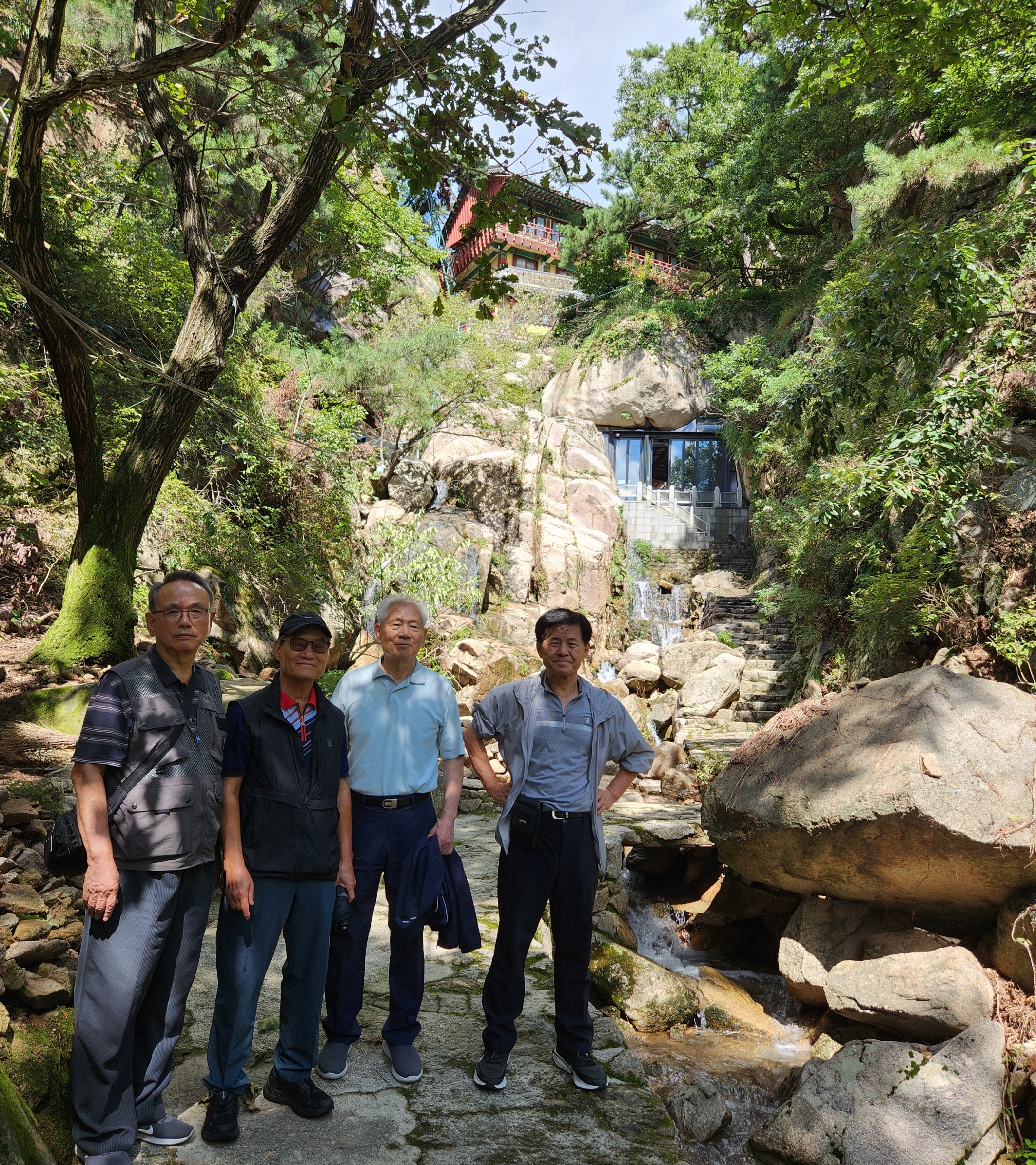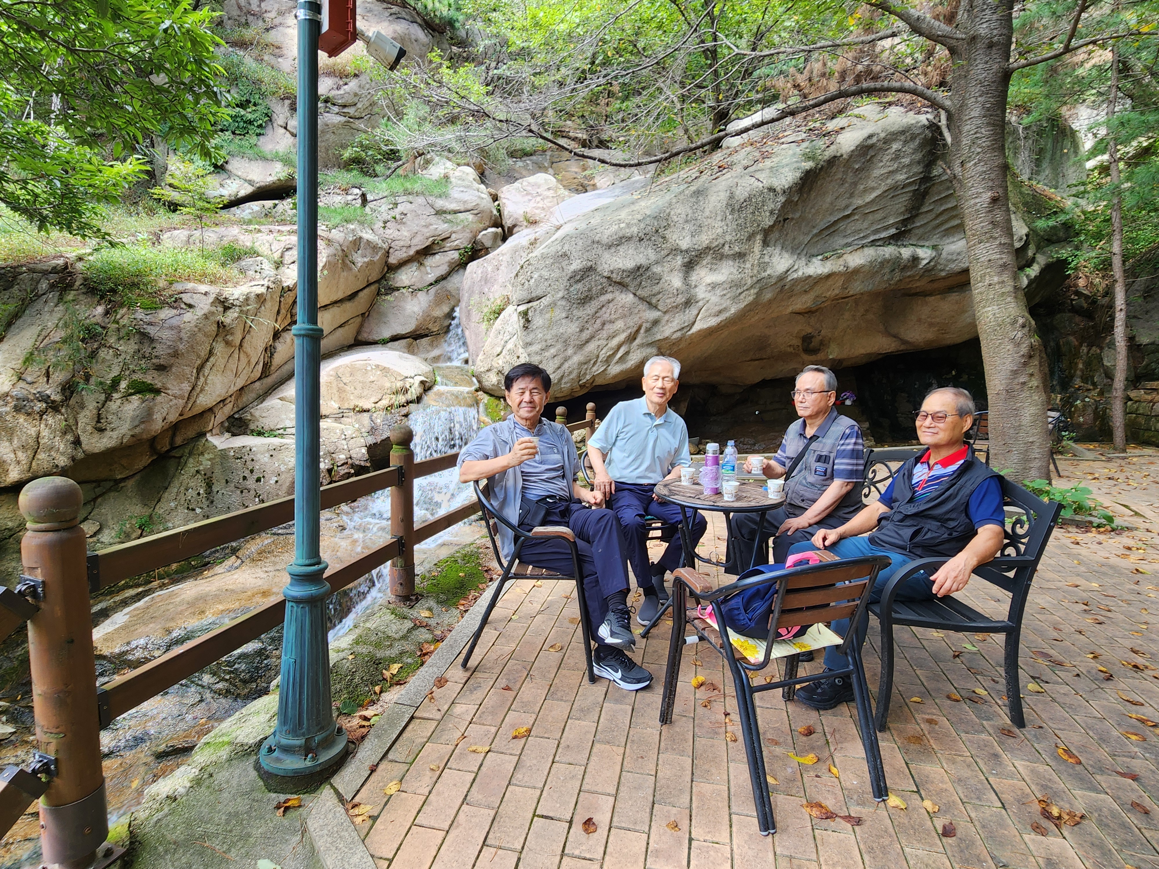 걸어서 30여분 목정굴을 지나 금선사 대웅보전을 거쳐 무지개다리를 건너고 폭포수 옆 숲아래 공터 벤치 테이블에 둘러앉아 커피를 마시며 차담을 나누고,