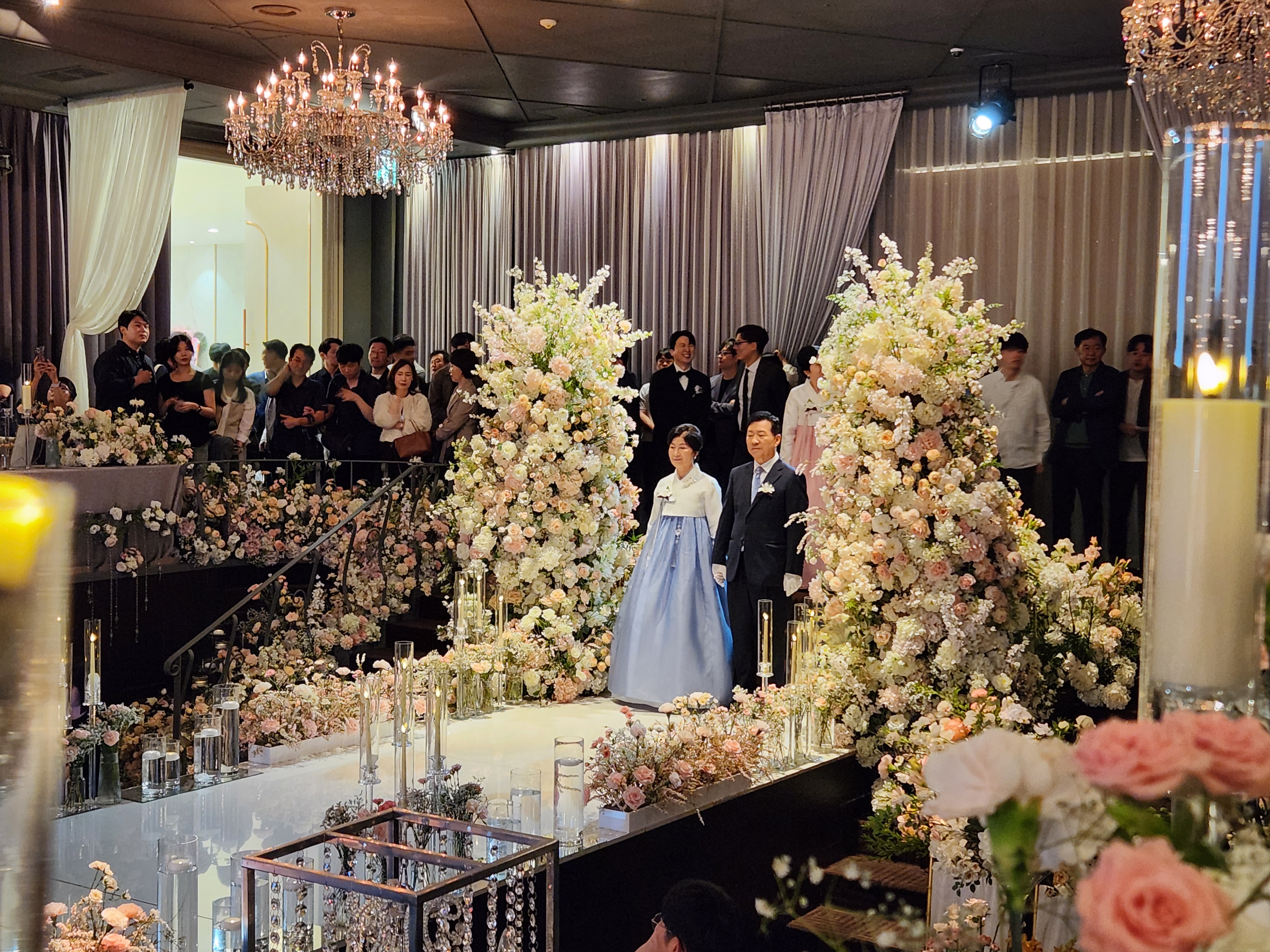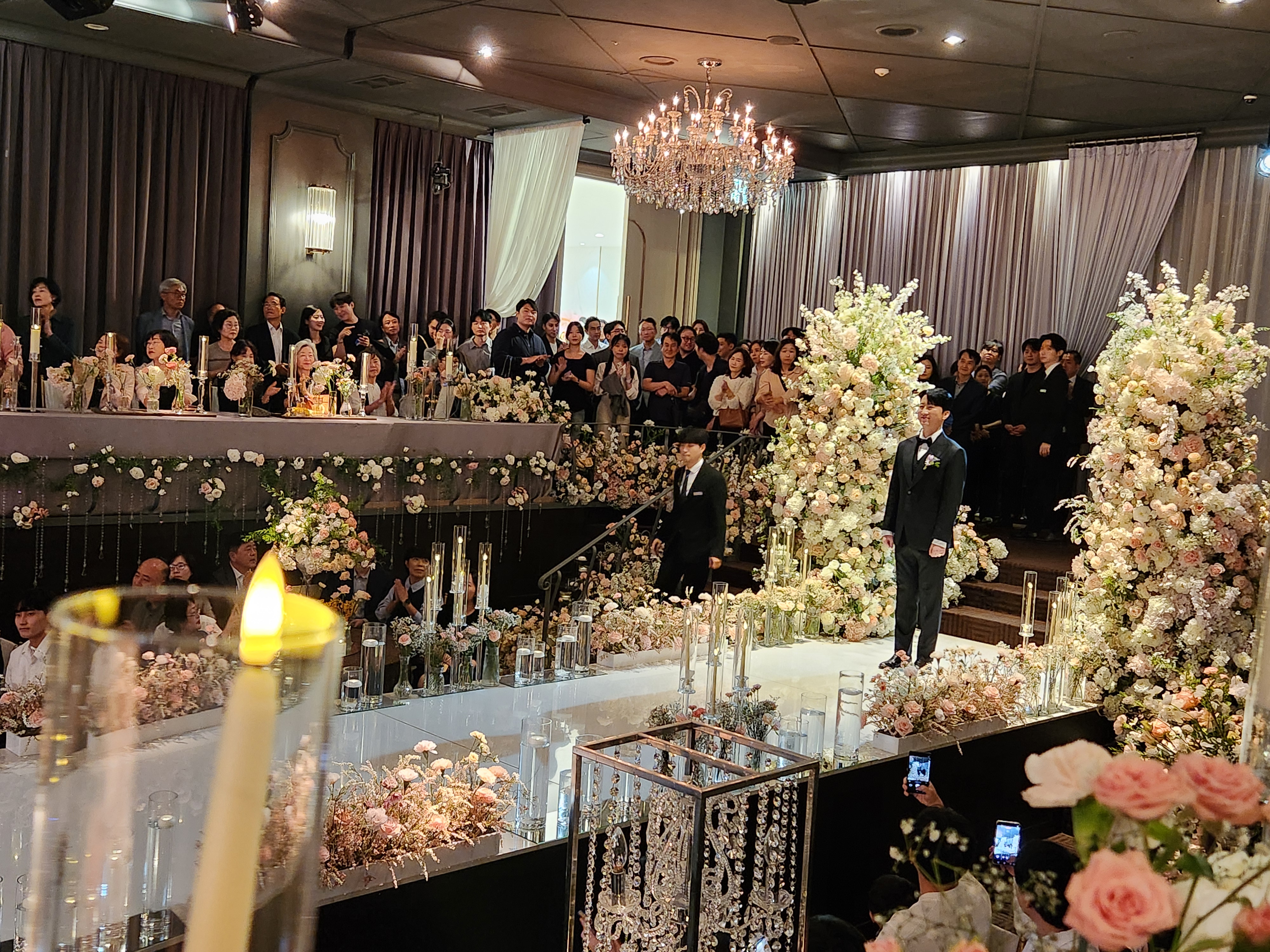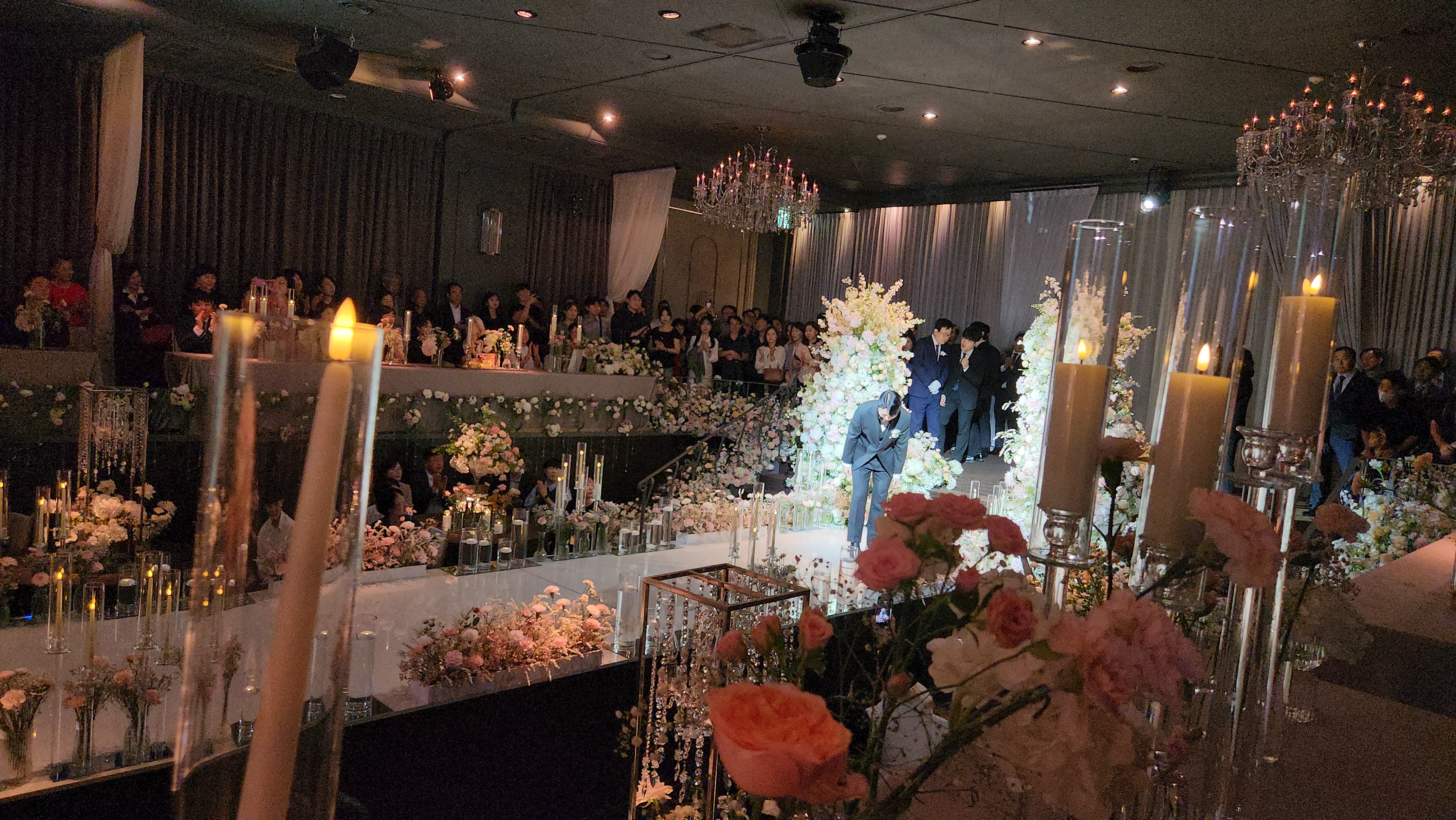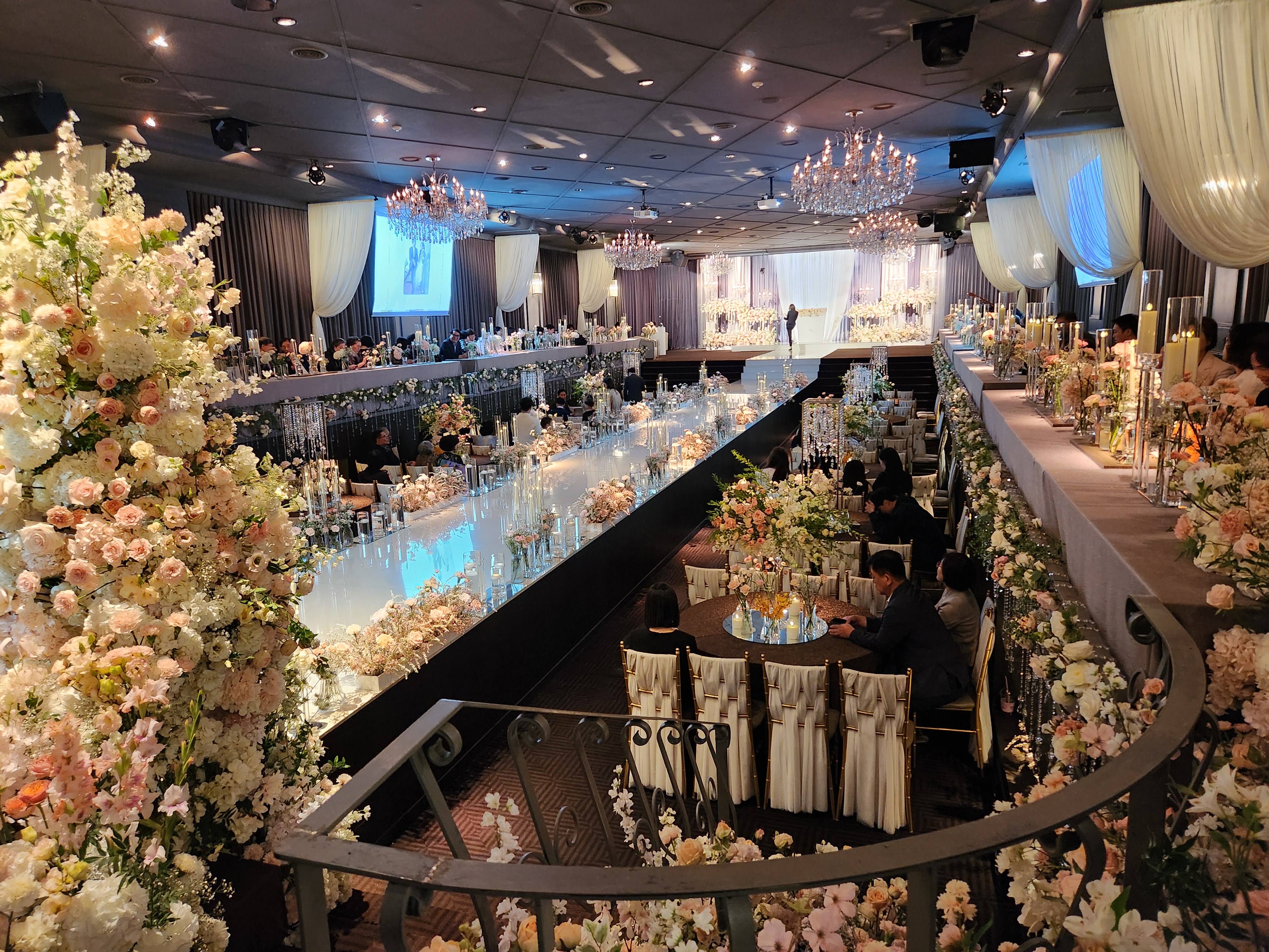 결혼식장이 특이하다. 오페라 관람석같은 2층 구조로 되어 있고 꽃장식으로 무척 화려하다. 이런 입체적인 예식홀은 처음이다.