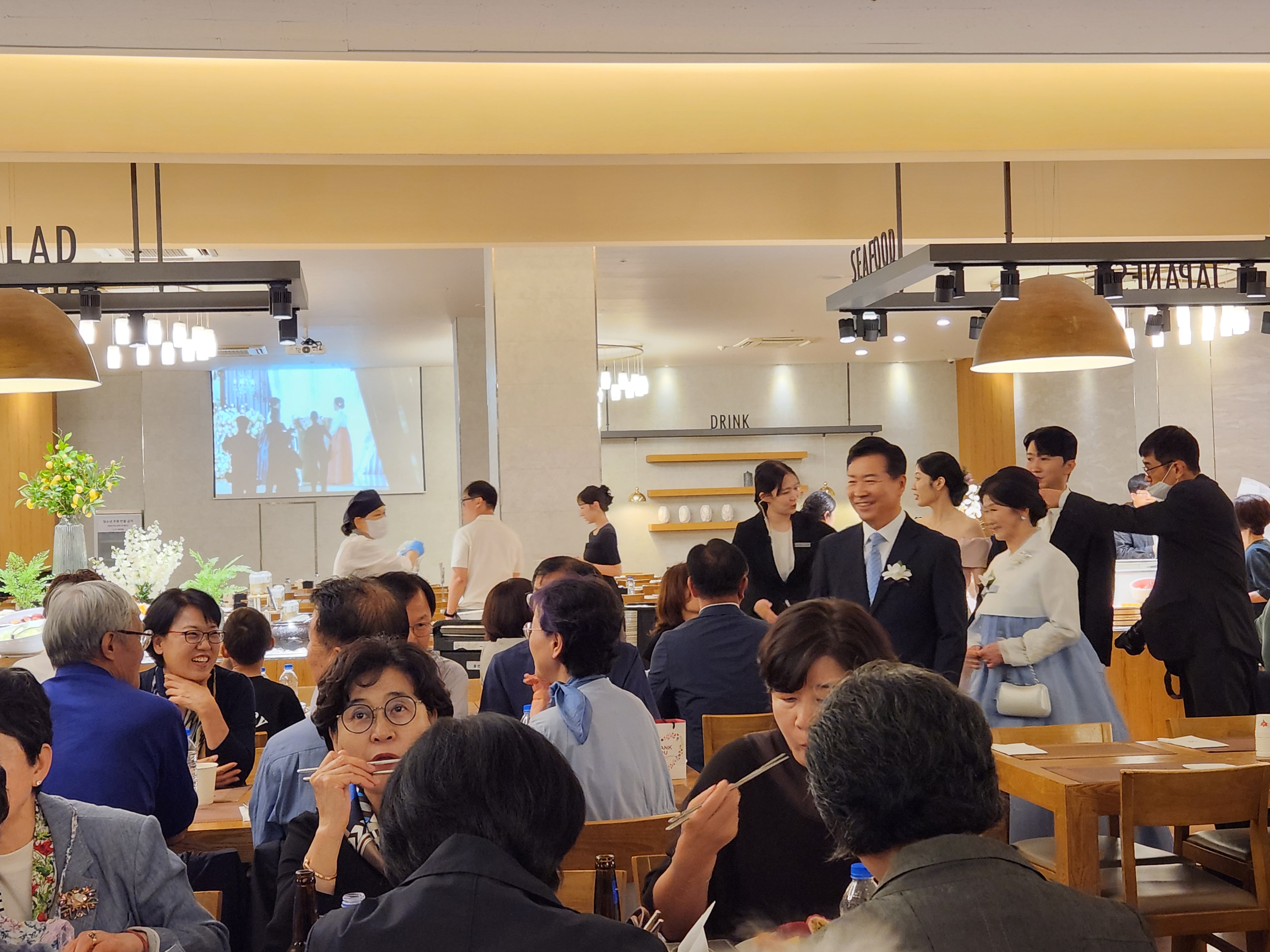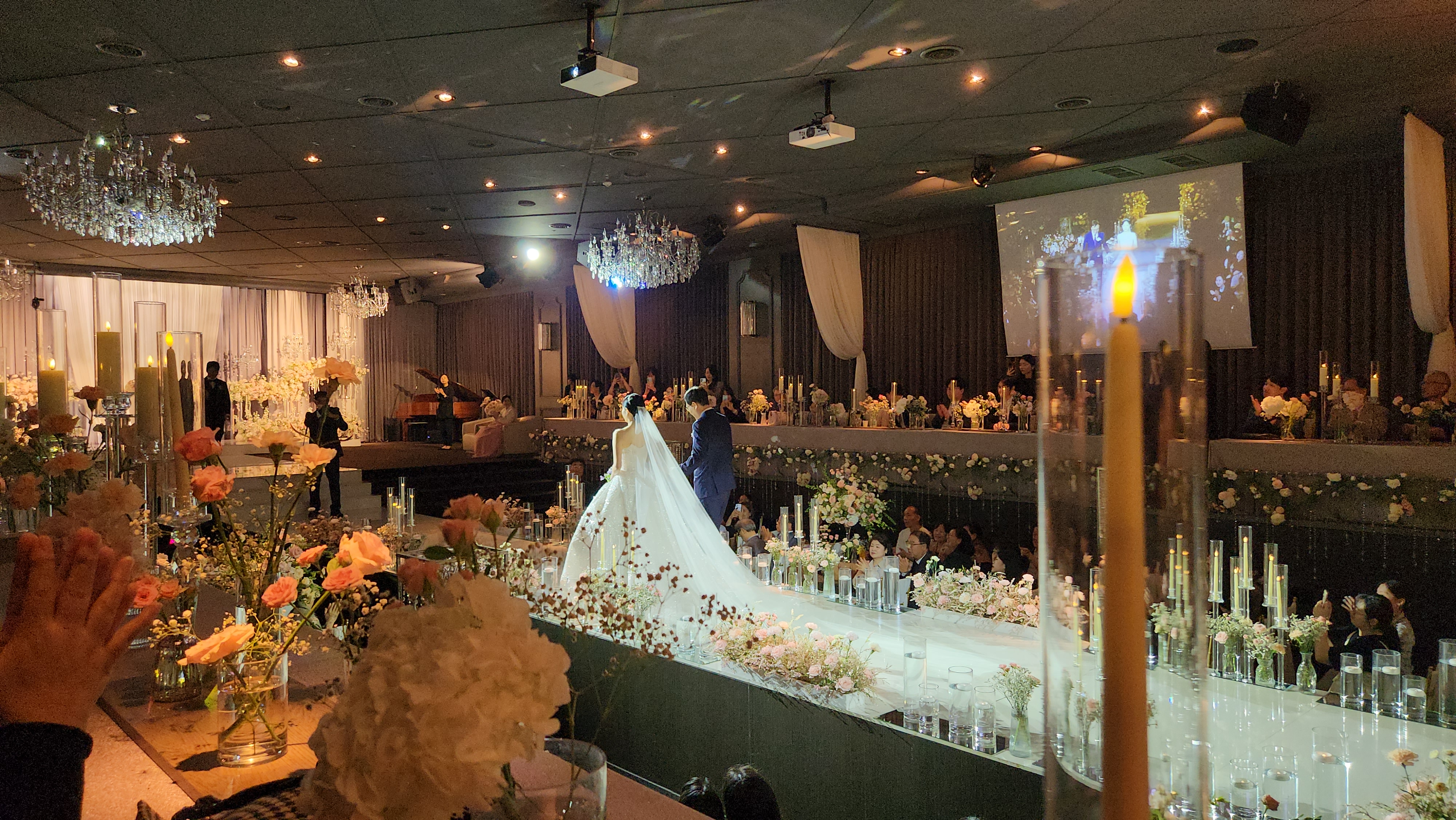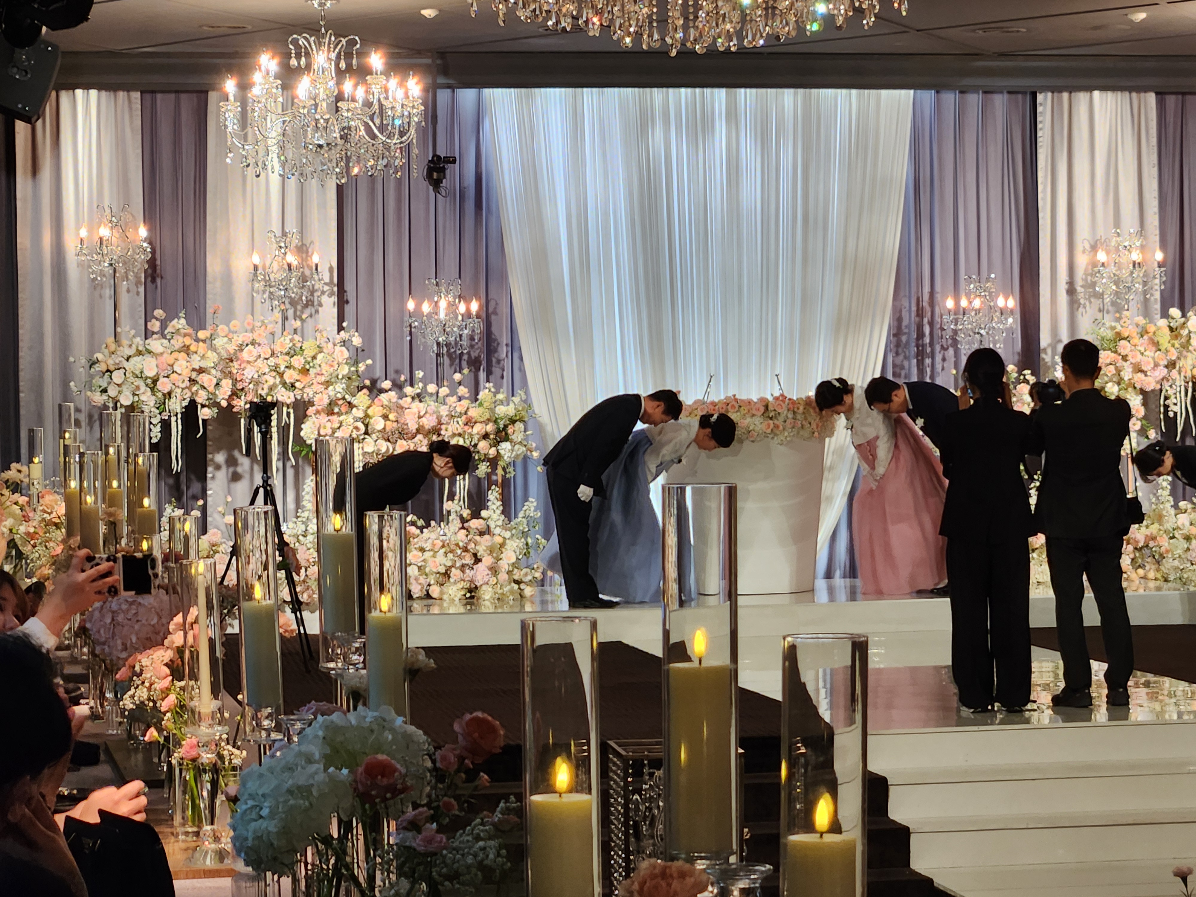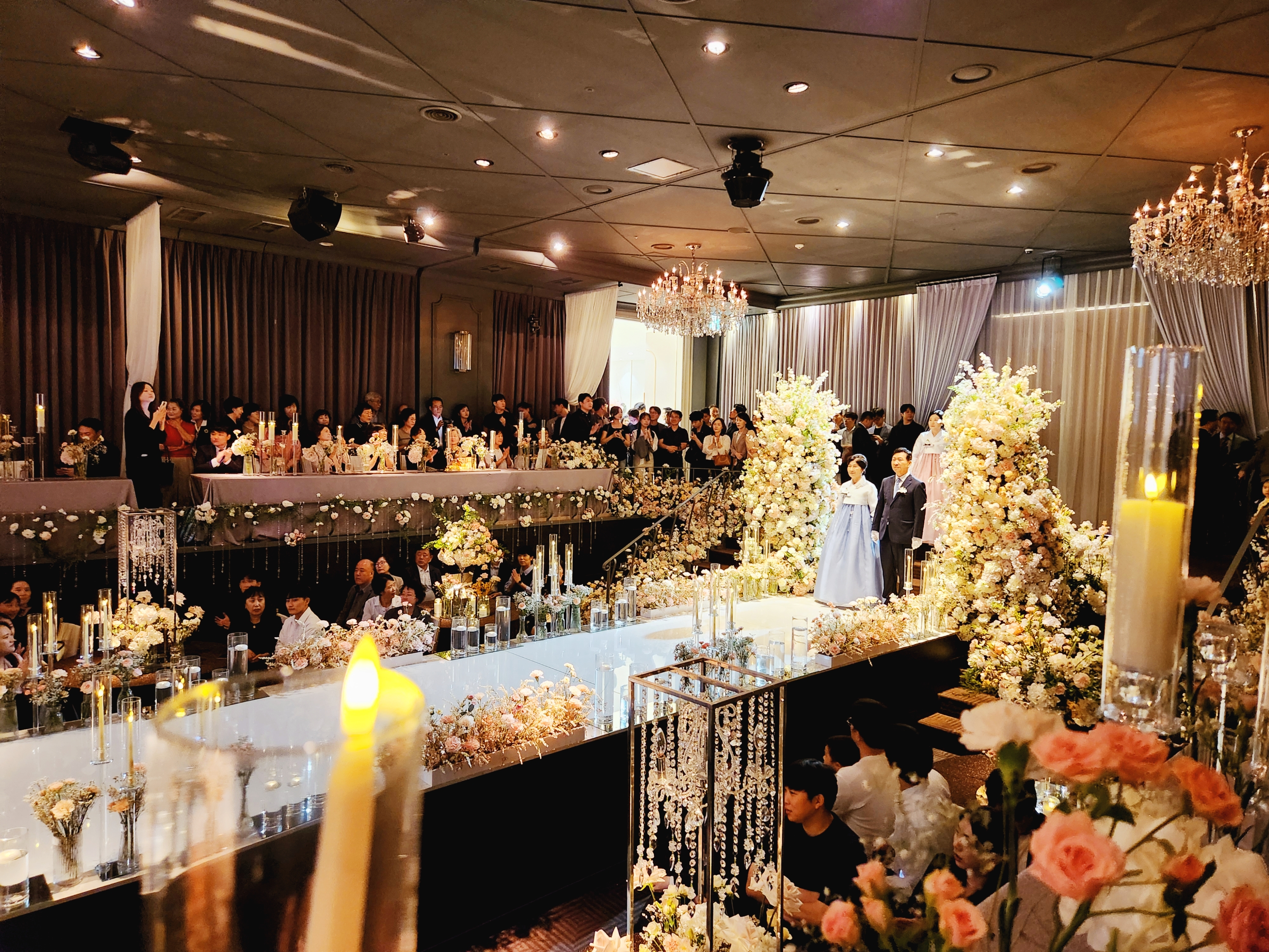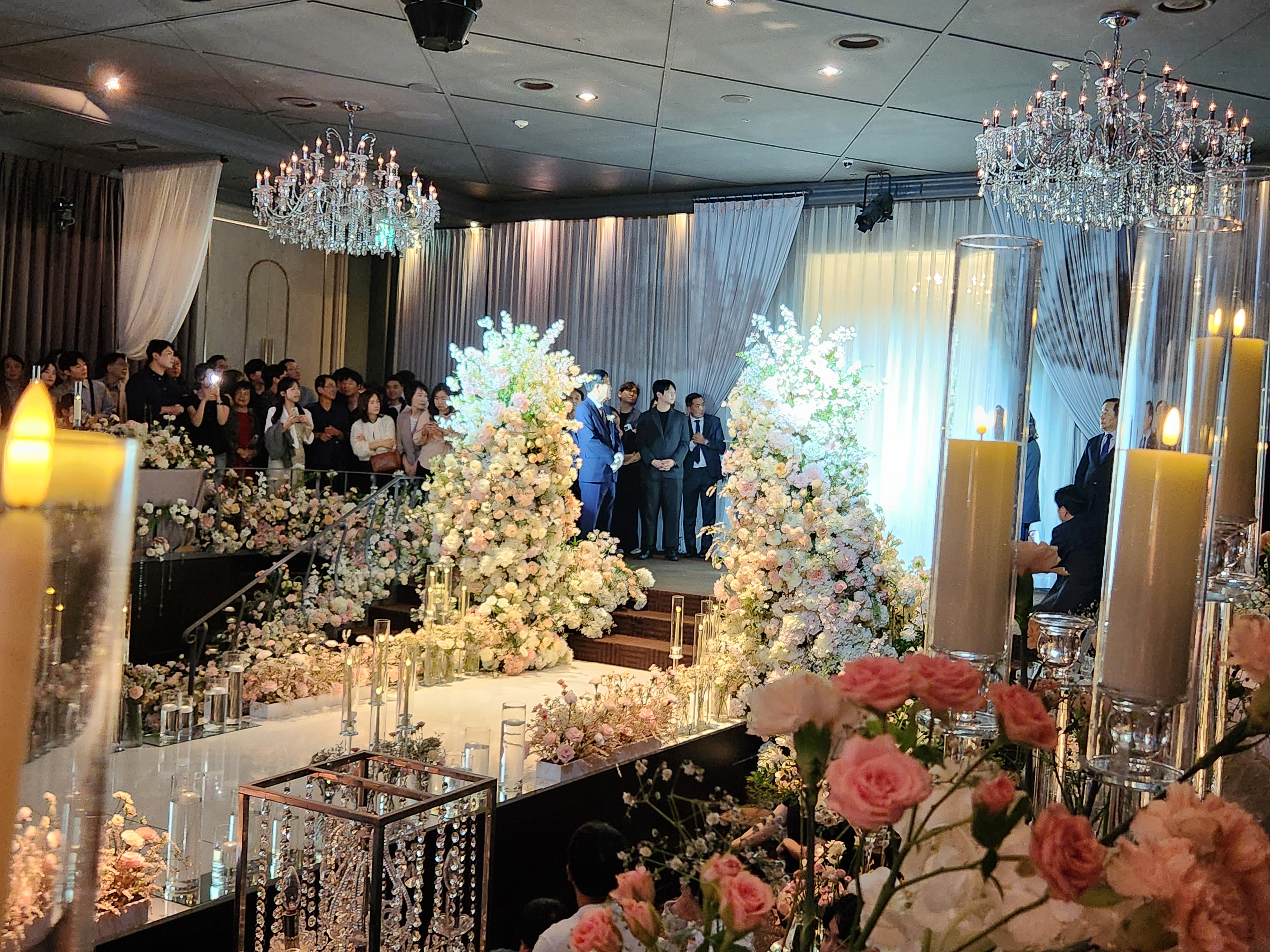 결혼식장이 특이하다. 오페라 관람석같은 2층 구조로 되어 있고 꽃장식으로 무척 화려하다. 이런 입체적인 예식홀은 처음이다.