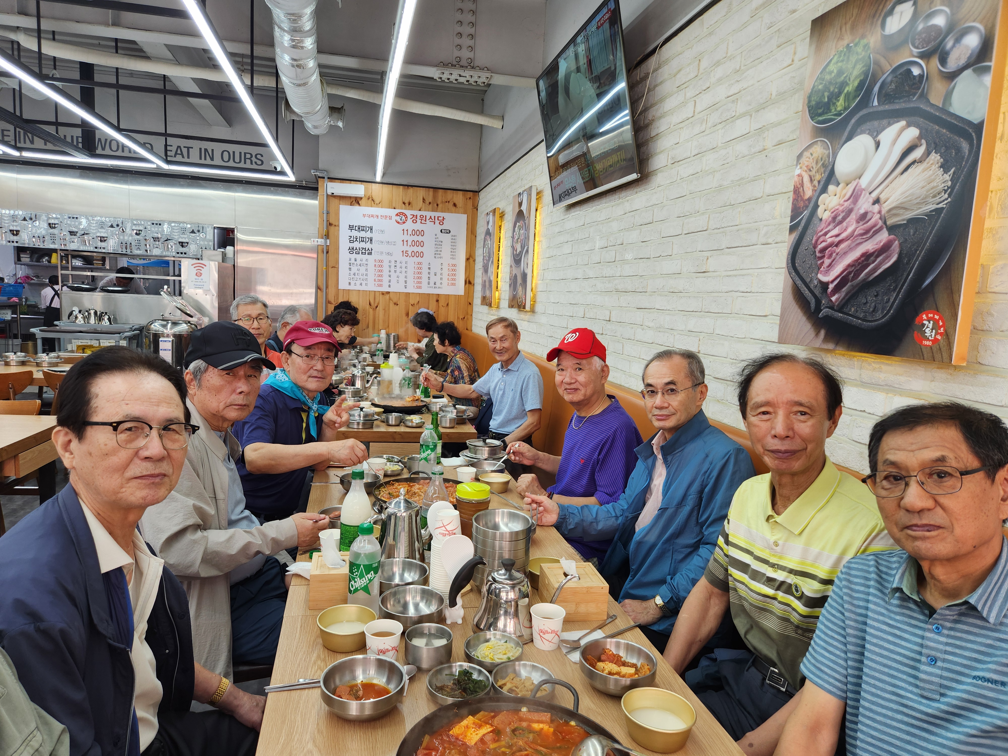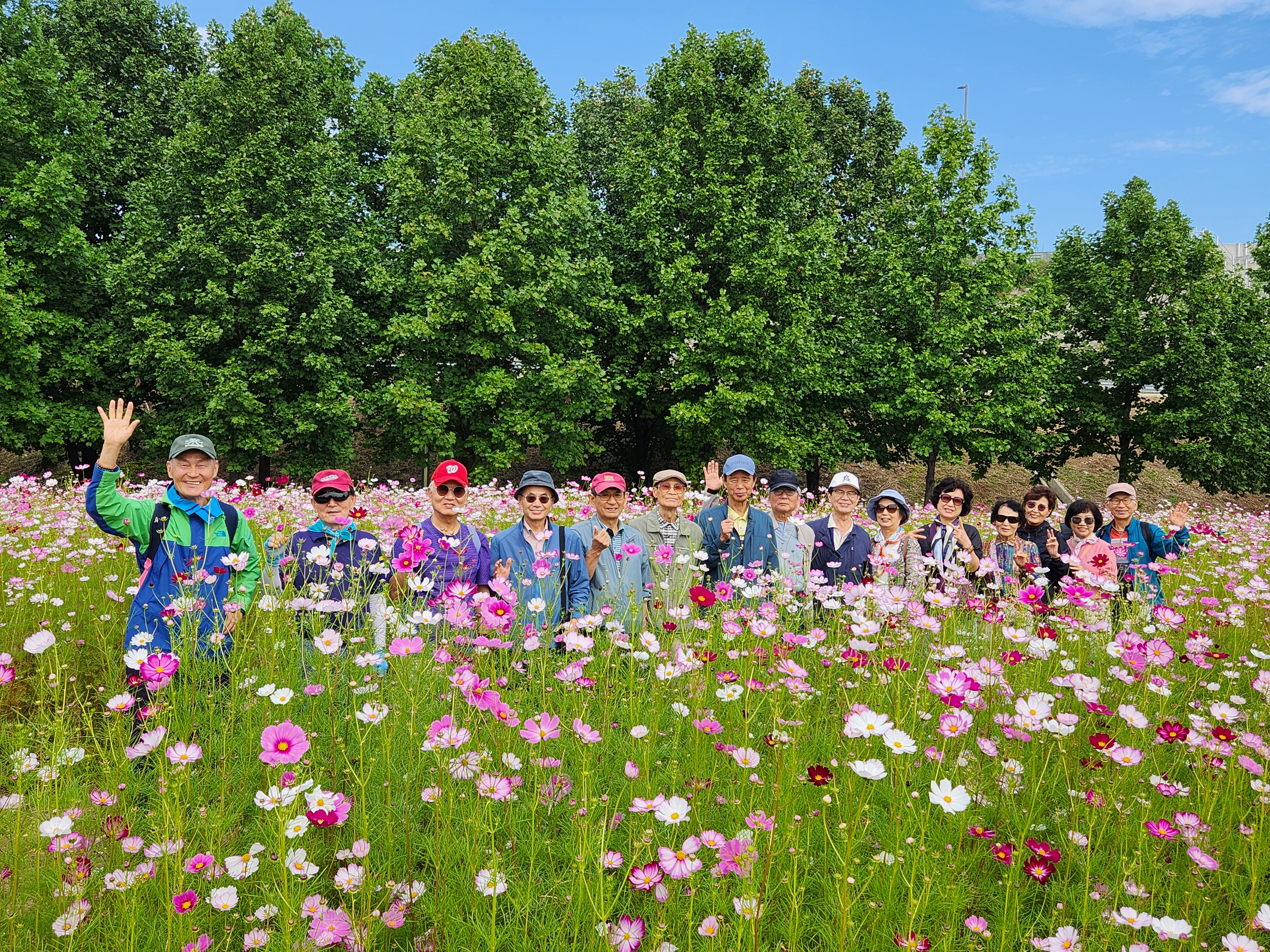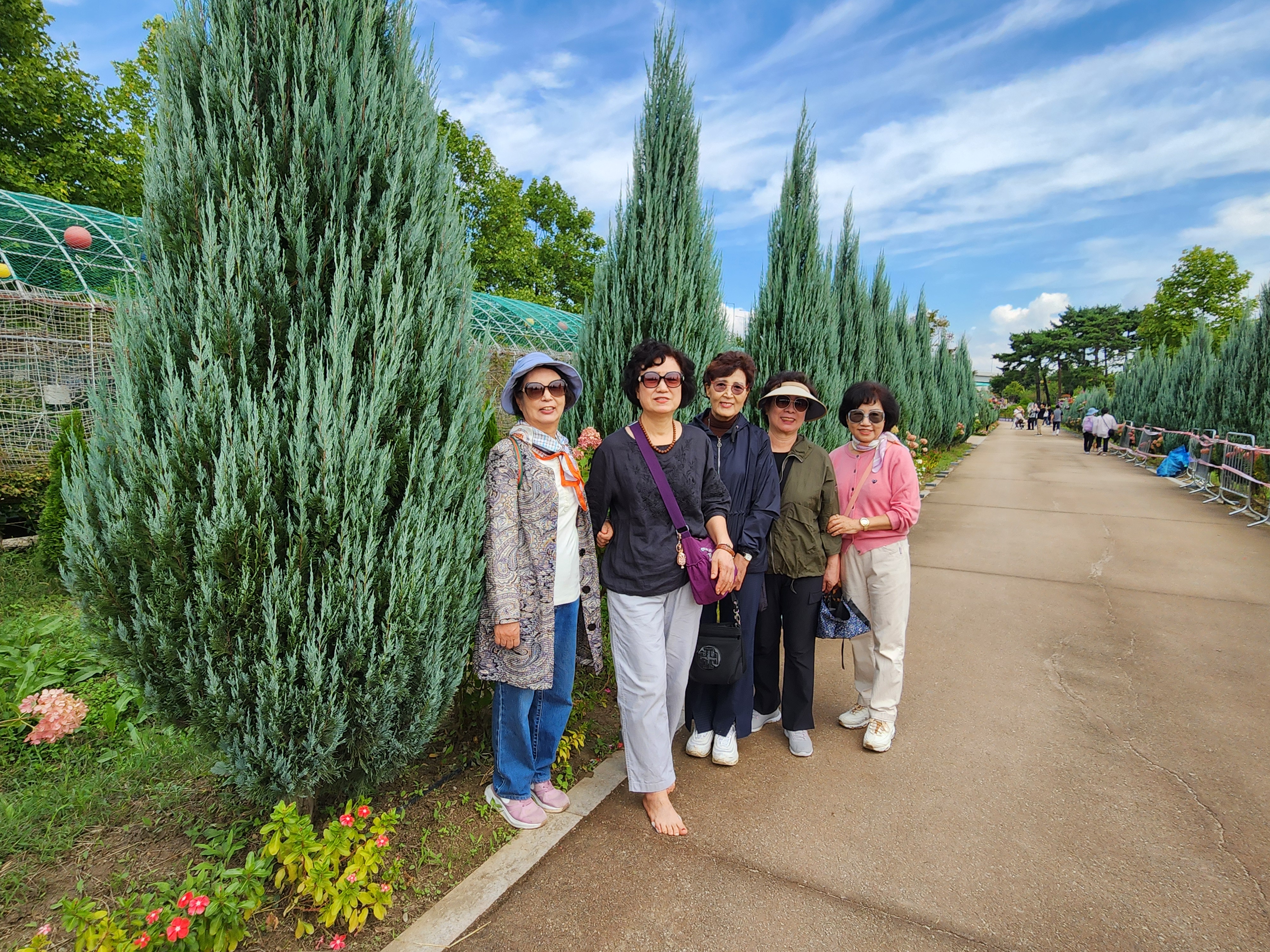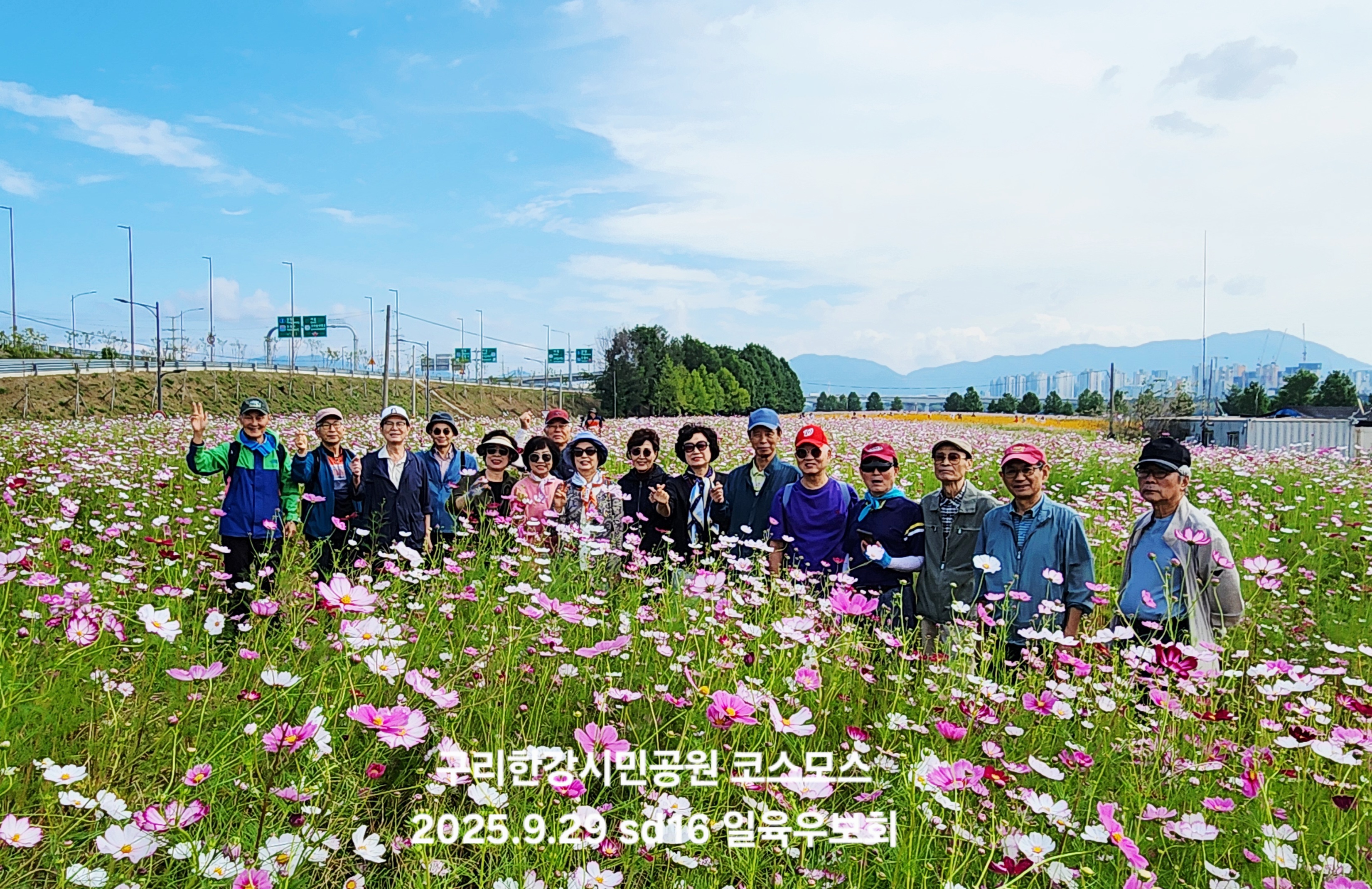 '25.9.29(월) 10:30, 잠실역 7출구 버스정류장에서 고교 친구와 가족들 일육우보회 15명이 만나 1670버스로 토평IC정류장 하차하여 구리한강시민공원 코스모스 대단지 돌아보고 장자호수공원으로 이동하여 산책 후에 부근의 맛집에서 점심식사