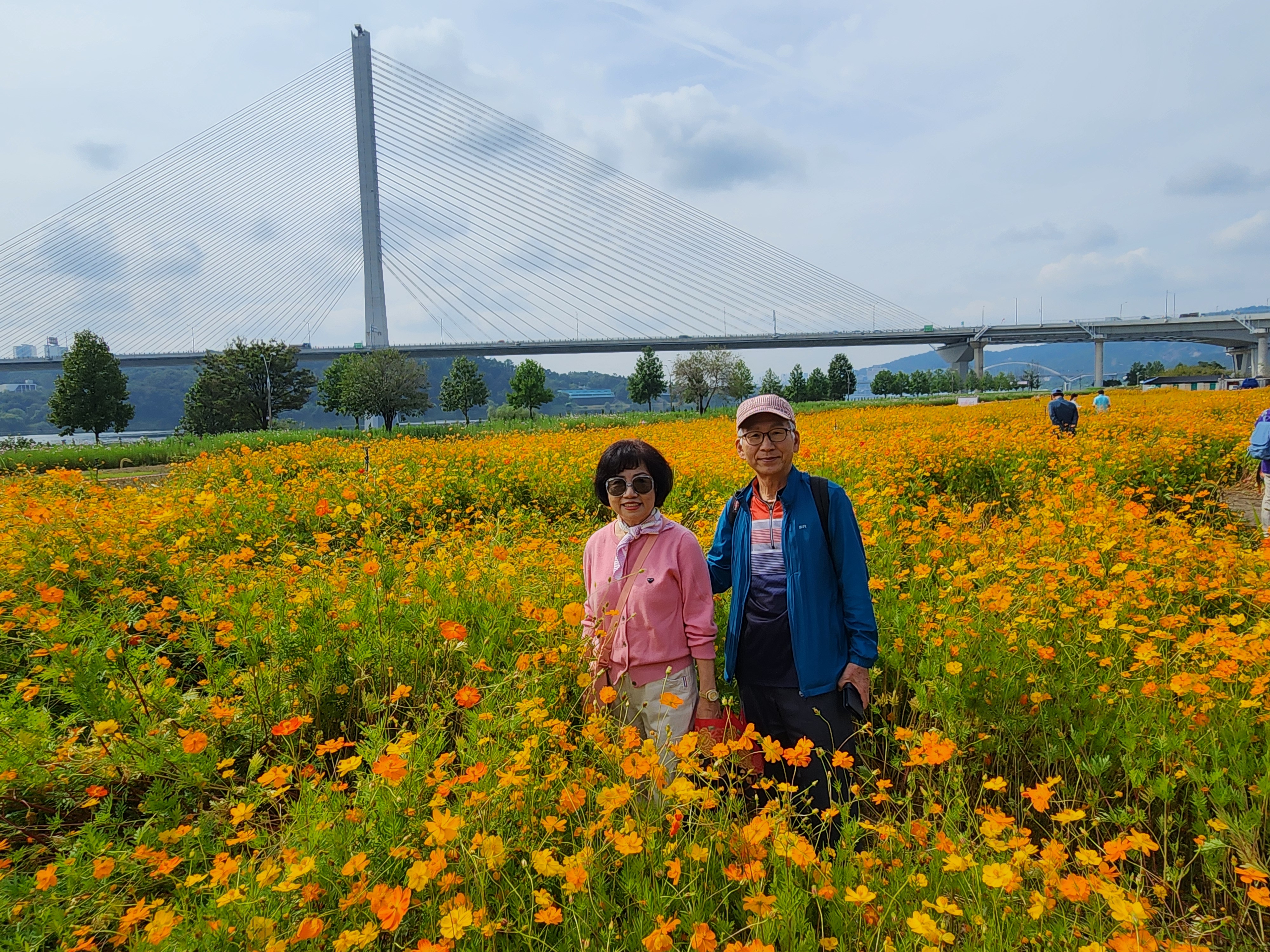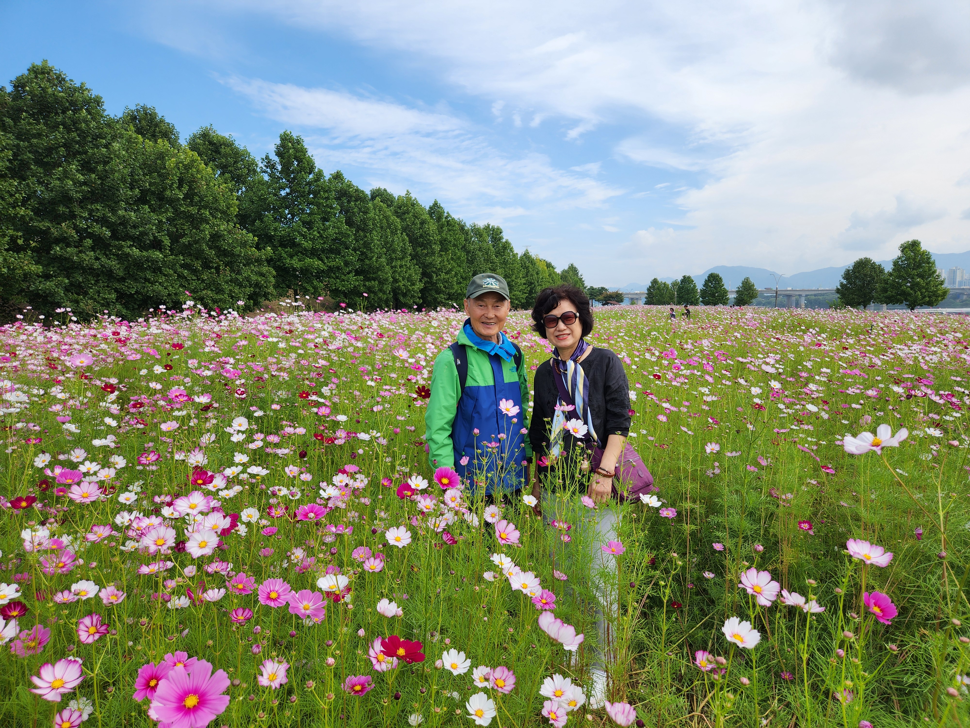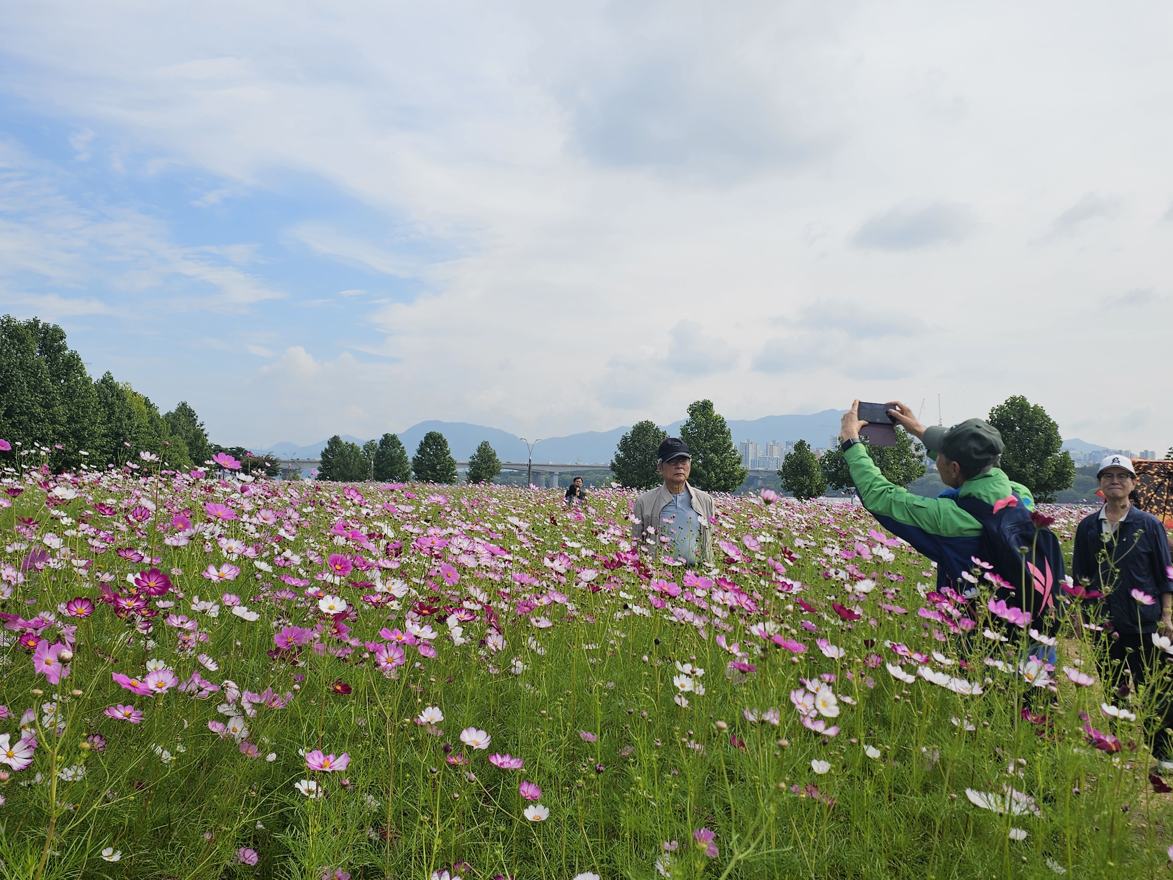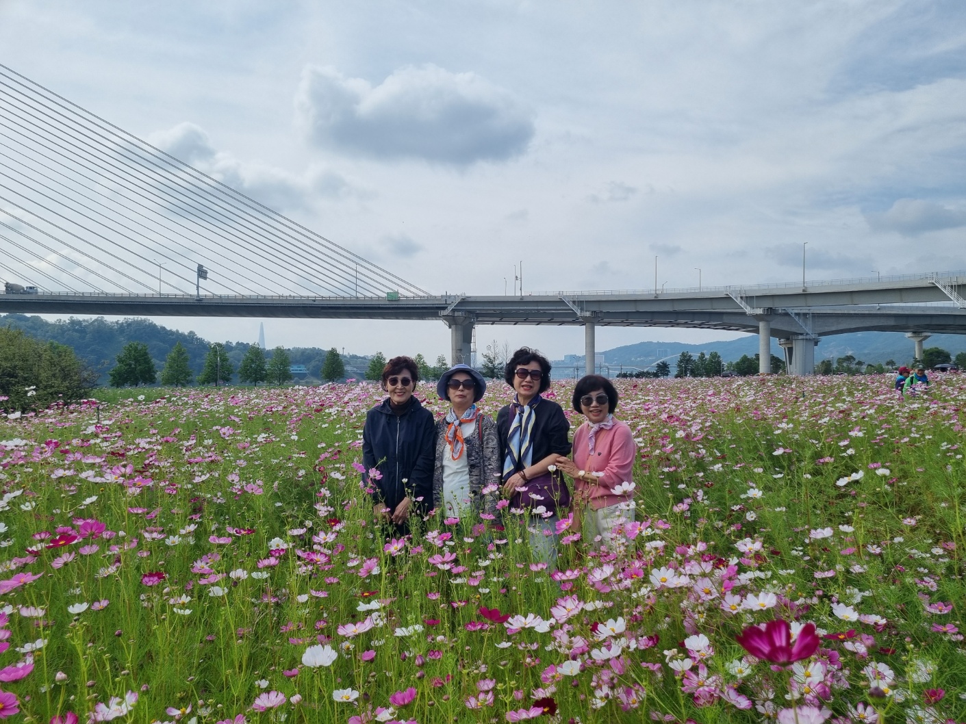 '25.9.29(월) 10:30, 잠실역 7출구 버스정류장에서 고교 친구와 가족들 일육우보회 15명이 만나 1670버스로 토평IC정류장 하차하여 구리한강시민공원 코스모스 대단지 돌아보고 장자호수공원으로 이동하여 산책 후에 부근의 맛집에서 점심식사