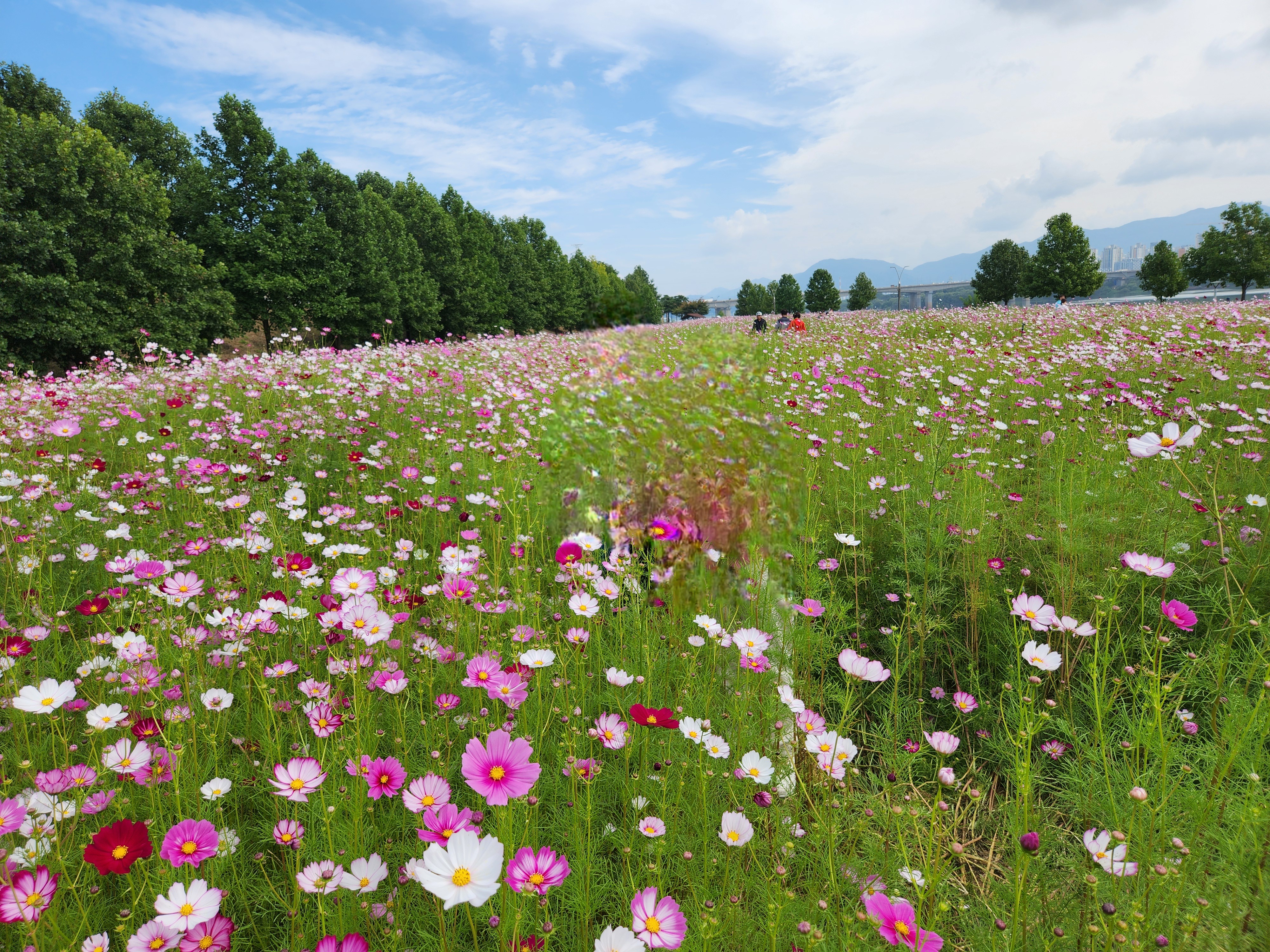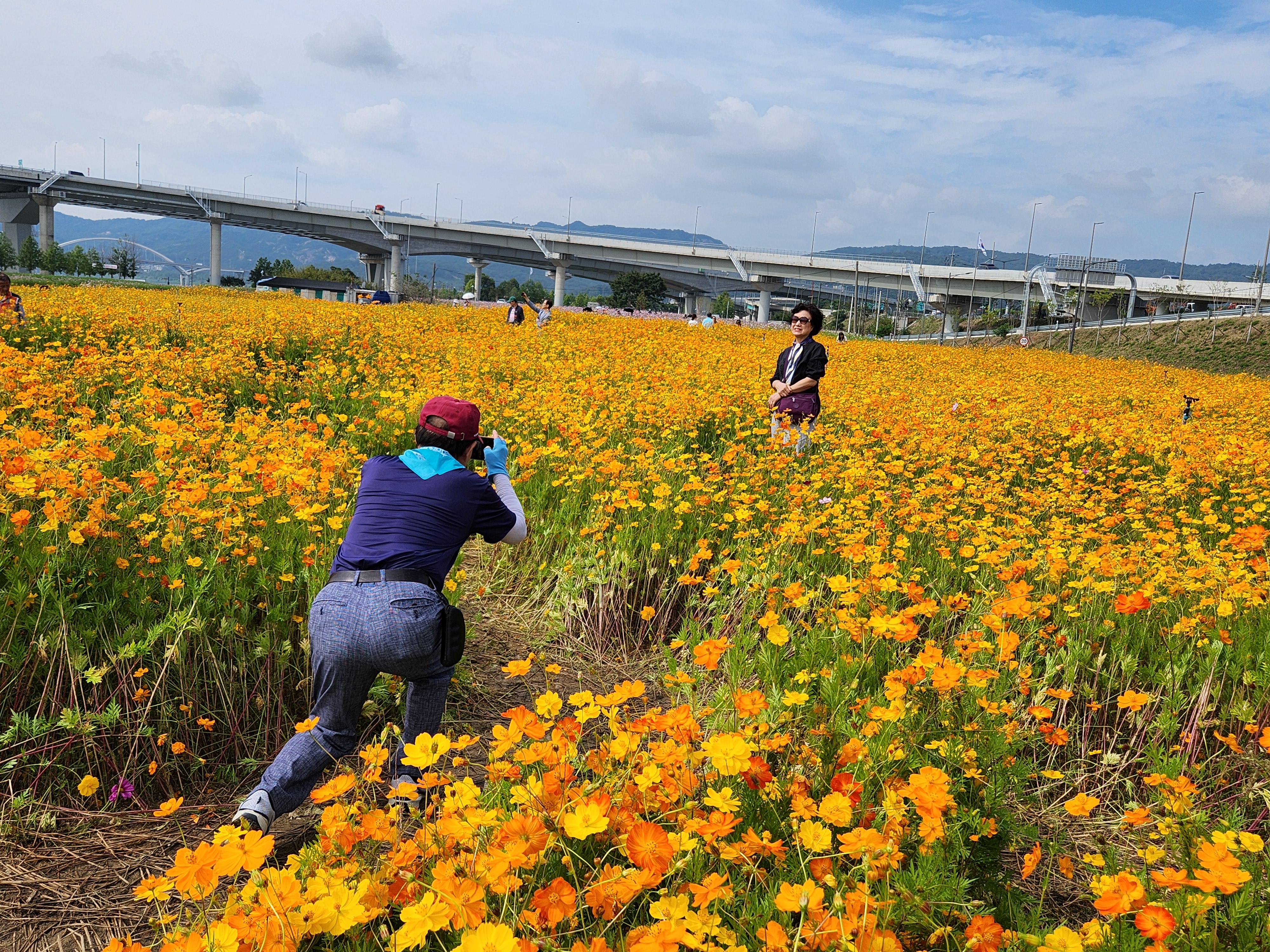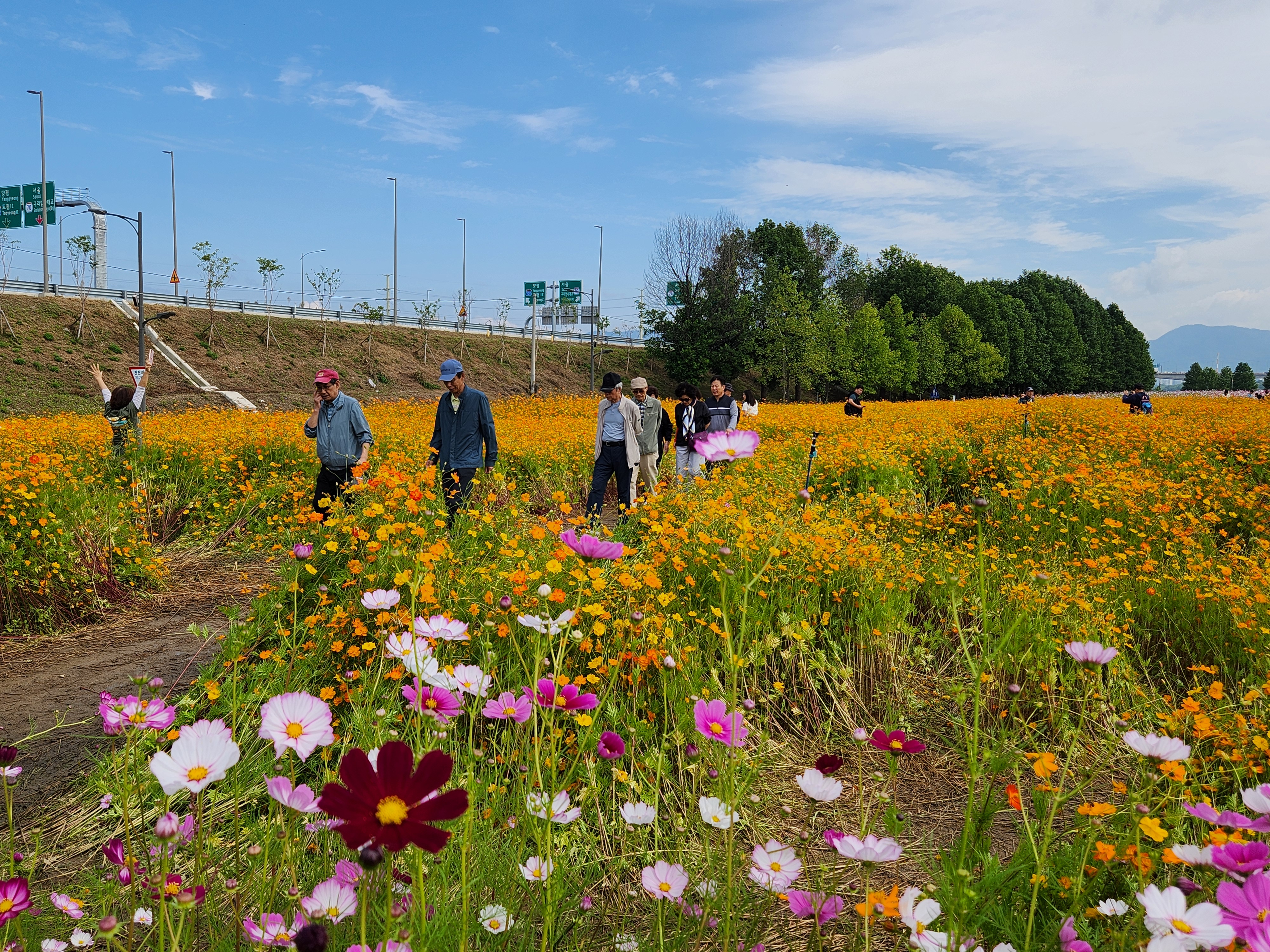 코스모스공원의 동쪽 끝 대단지로부터 꽃길사이로 1km정도 계속 구불구불 길이 이어진다. 중간지대에 노오란 황하코스모스가 눈부시게 만발해 있고 뒷배경으로 포천세종고속도로의 교량탑이 받쳐주고 있다. 어느쪽으로도 다 포토죤이 된다.