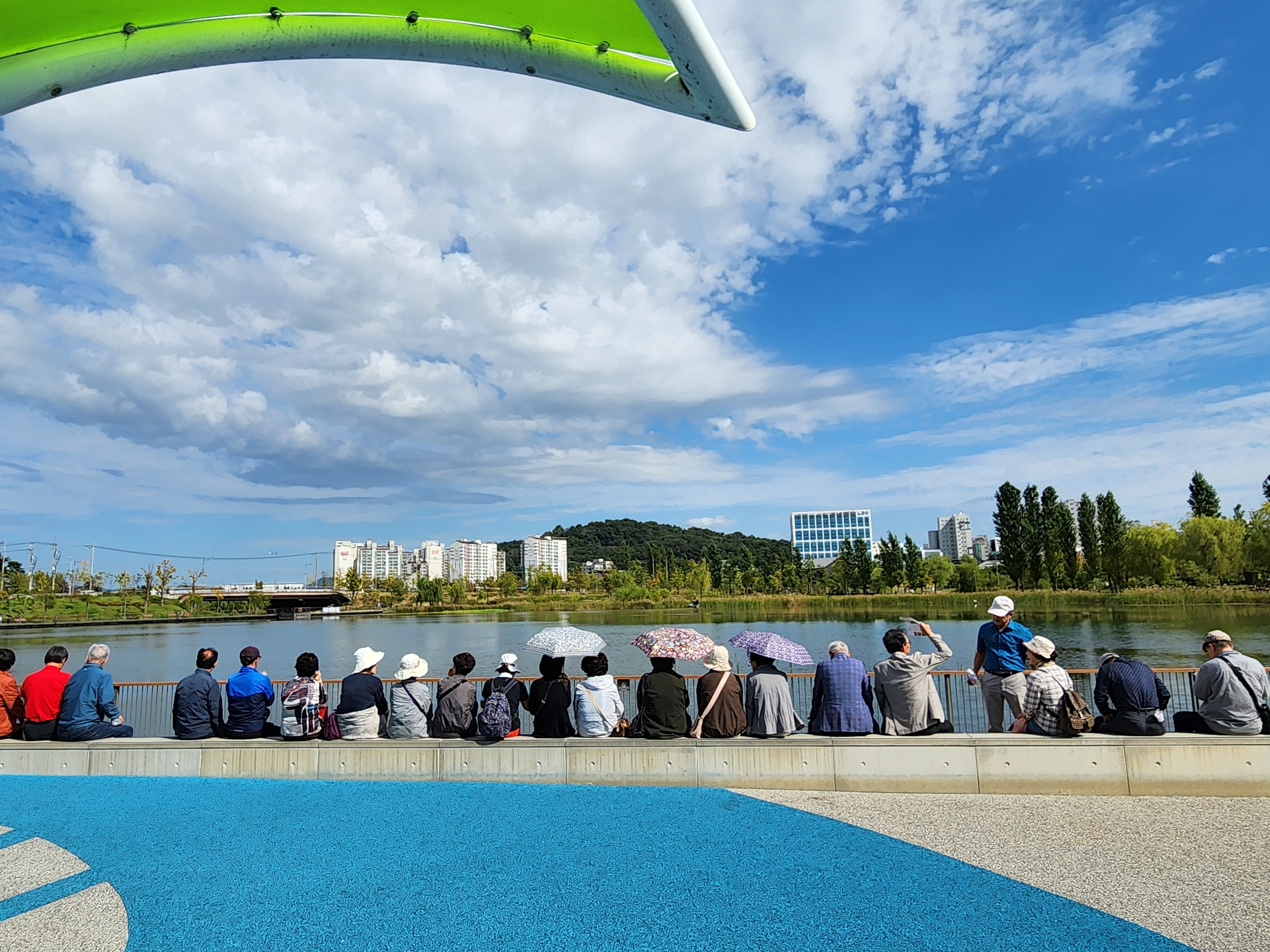 호수 오른편을 따라 그늘막 조형물이 있는곳에 앉아