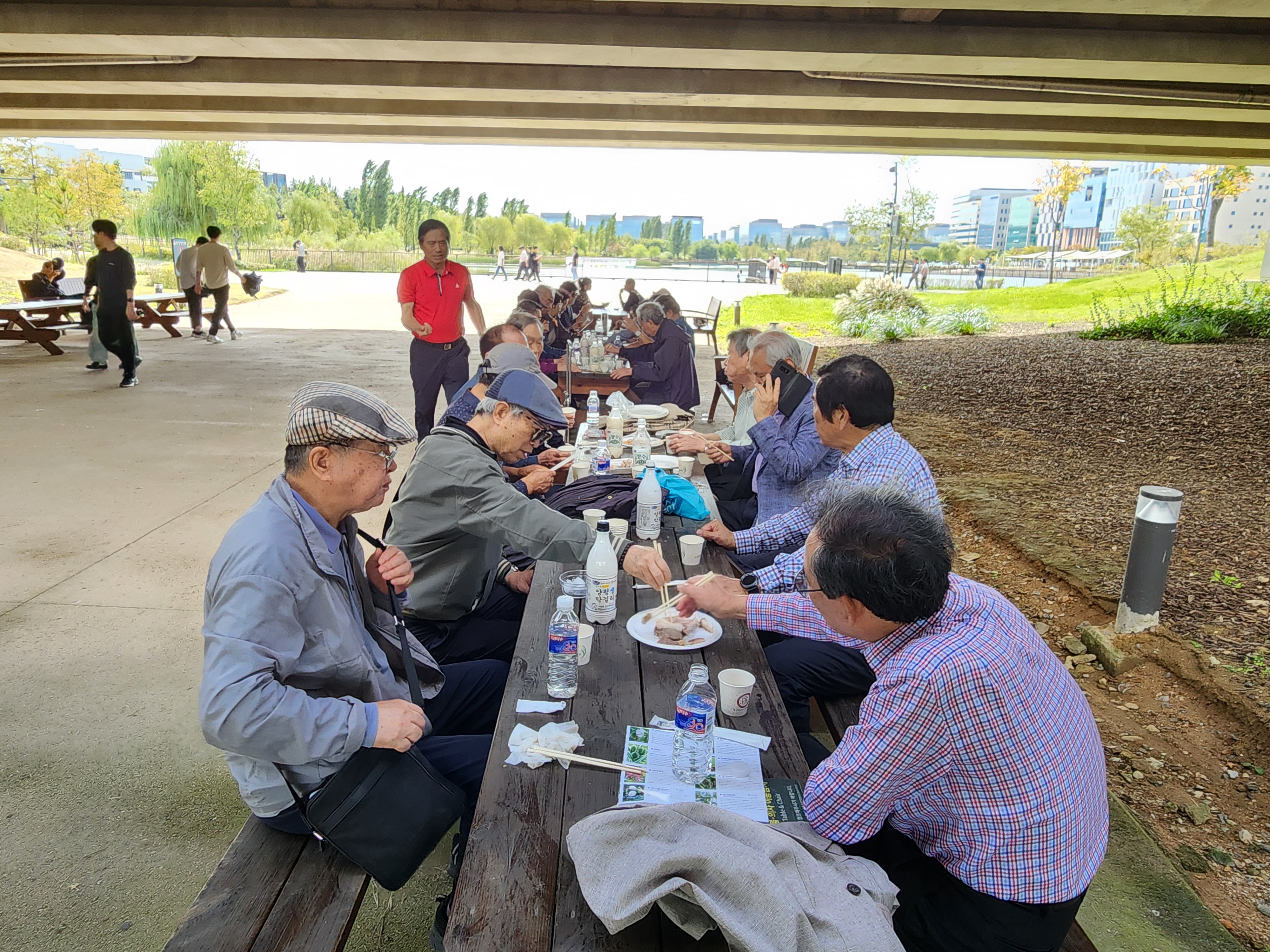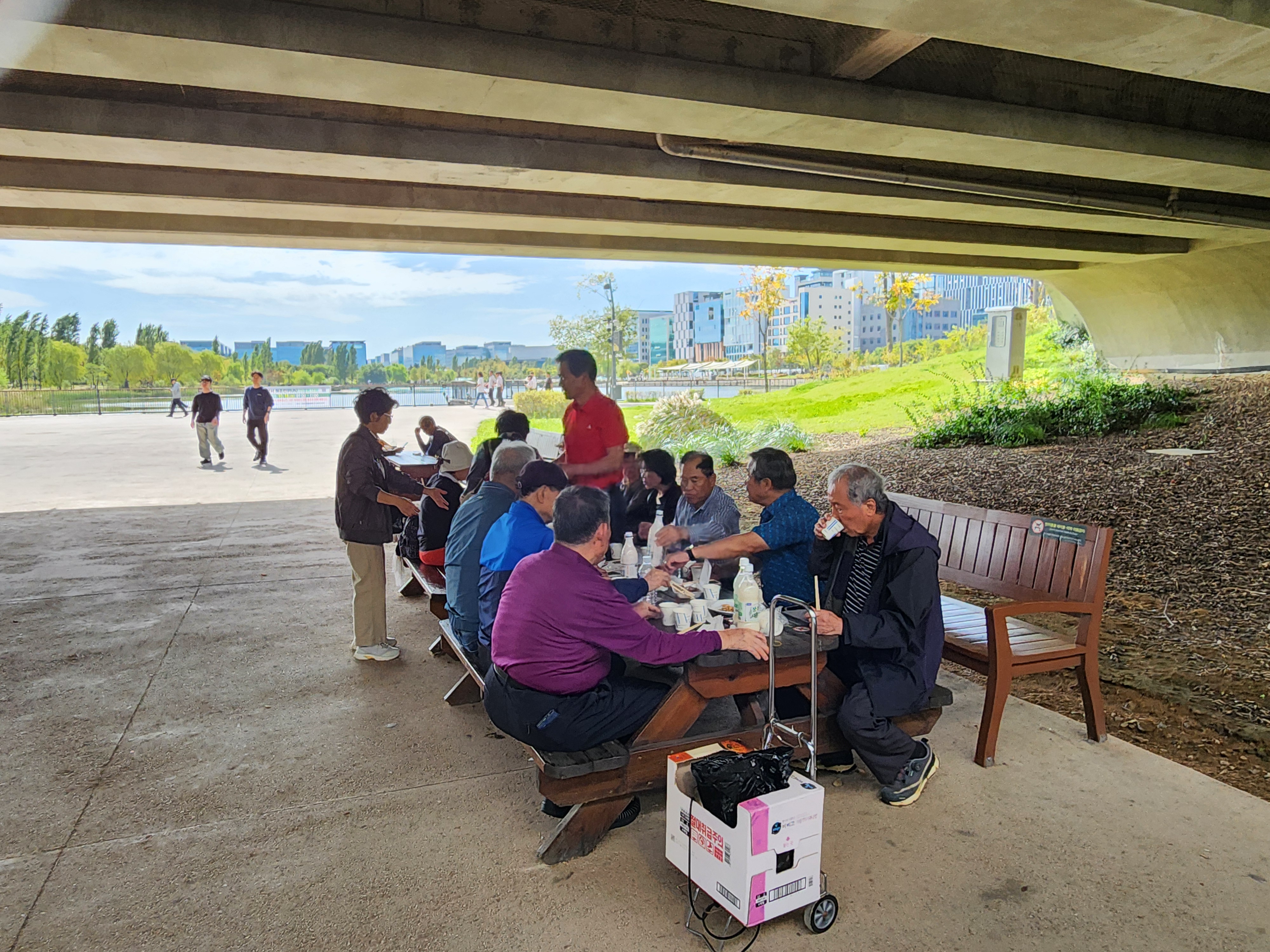 반대편 남쪽 절반으로 또 특징적인 4개주제의 정원들이 있는데 그쪽 답사는 생략하고 출구 폭포공원쪽으로 나갔다. 호수오른쪽 흙길 미루나무 가로수를 따라 양천로 다리아래로 가서 피크닉탁자에 둘러앉아 커피와 간식타임을 한참 즐긴다.