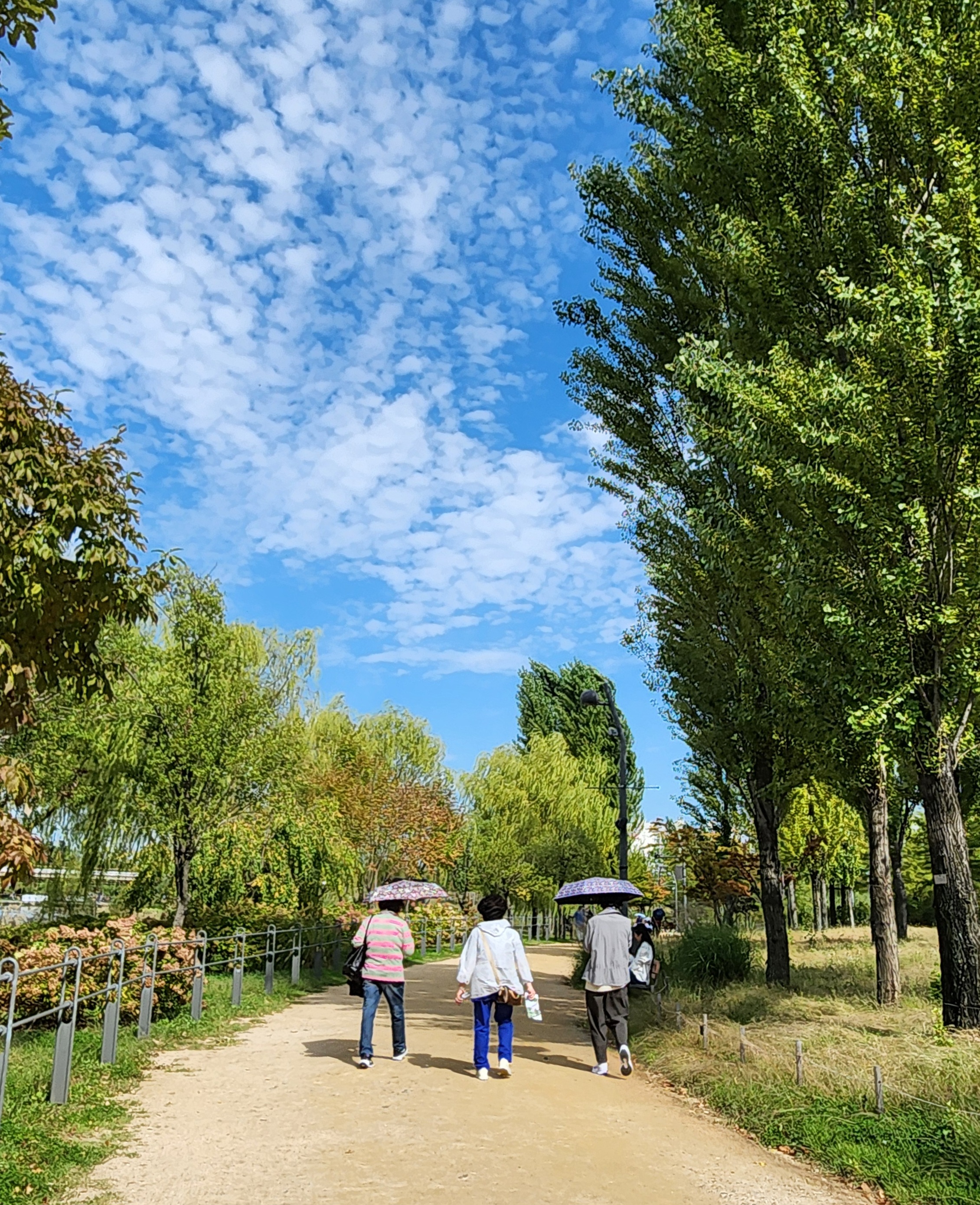 등 뒤로 느껴지는 따스한 가을 햇살, 하얀 구름이 그림처럼 흘러가는 이 순간,