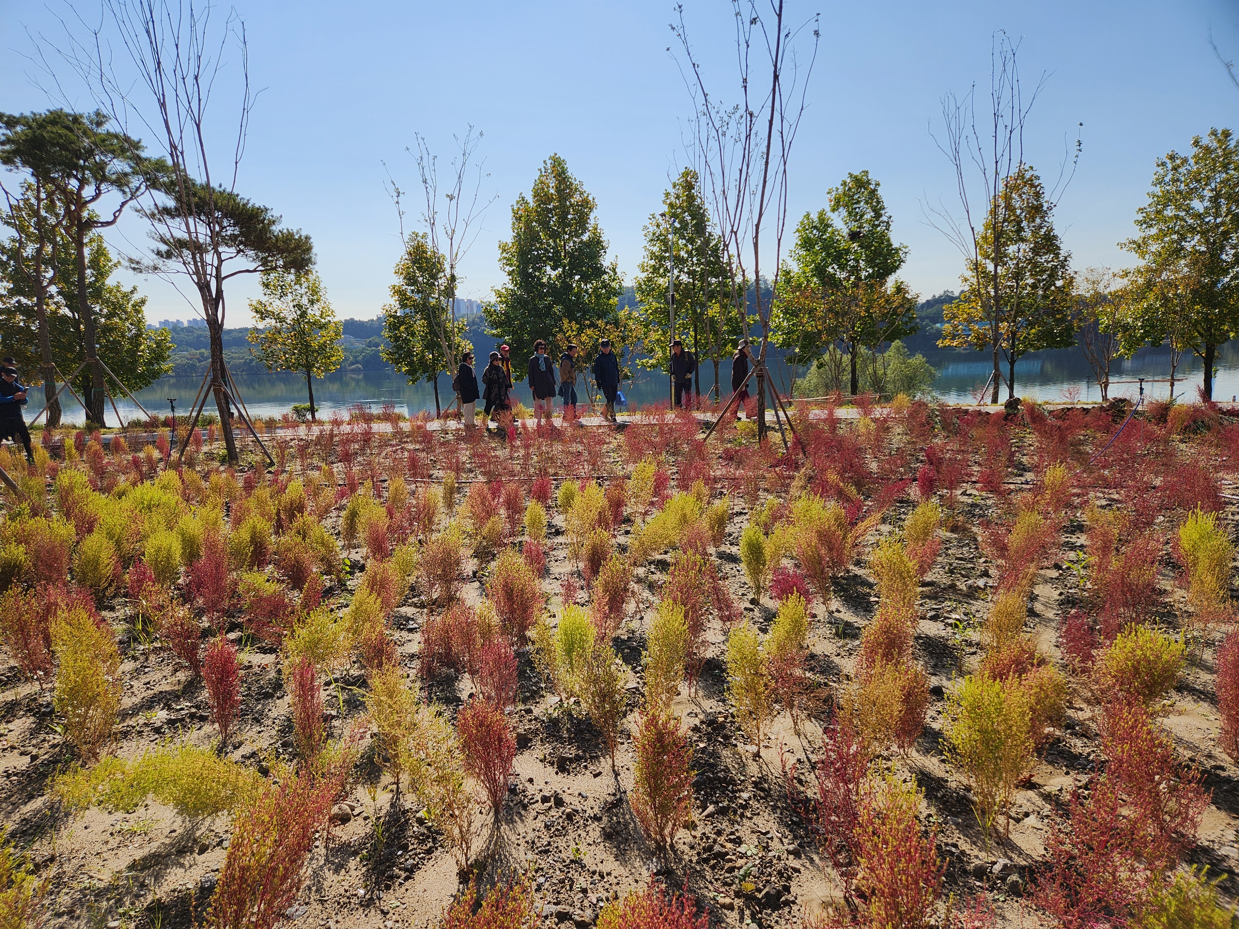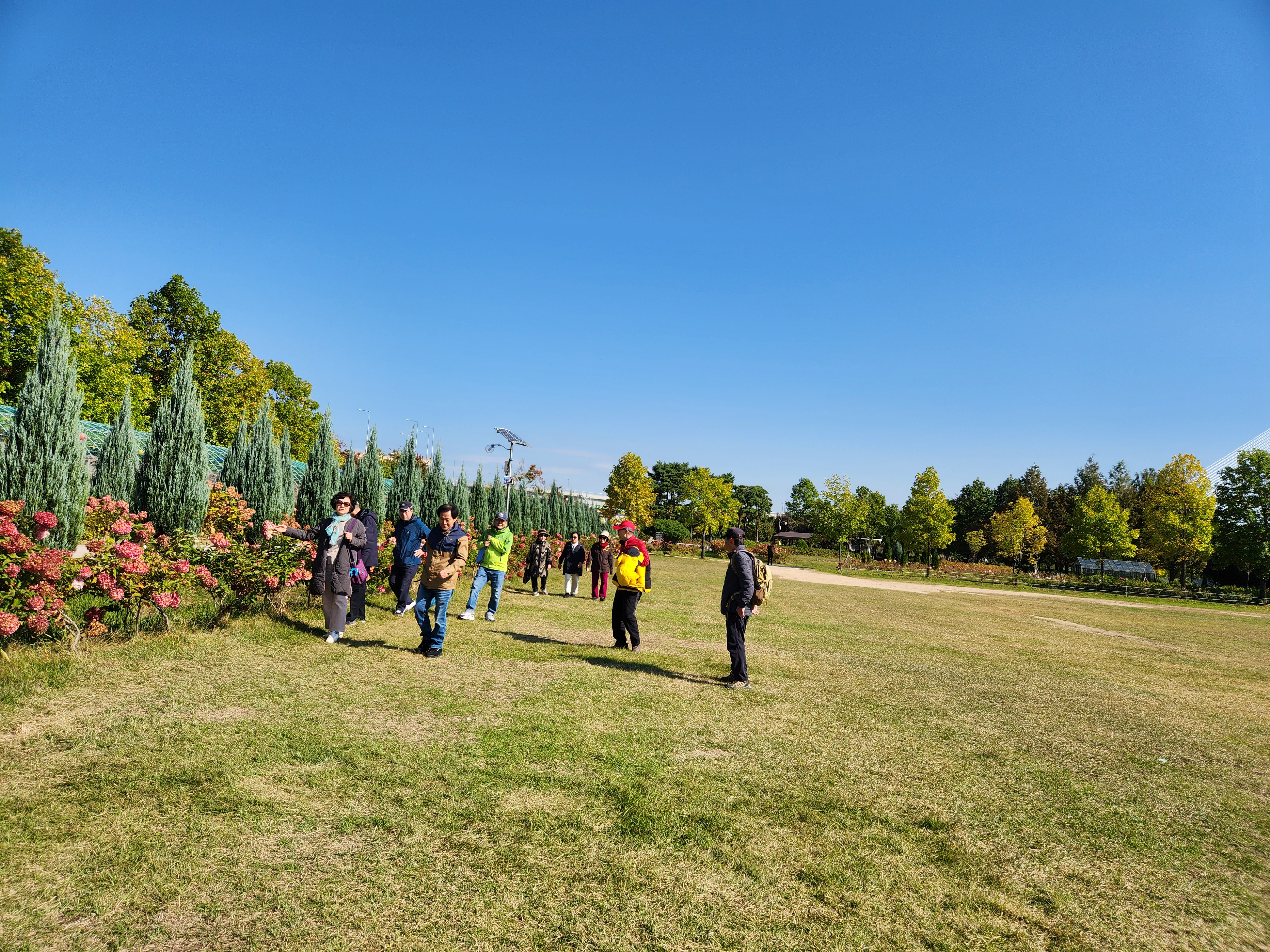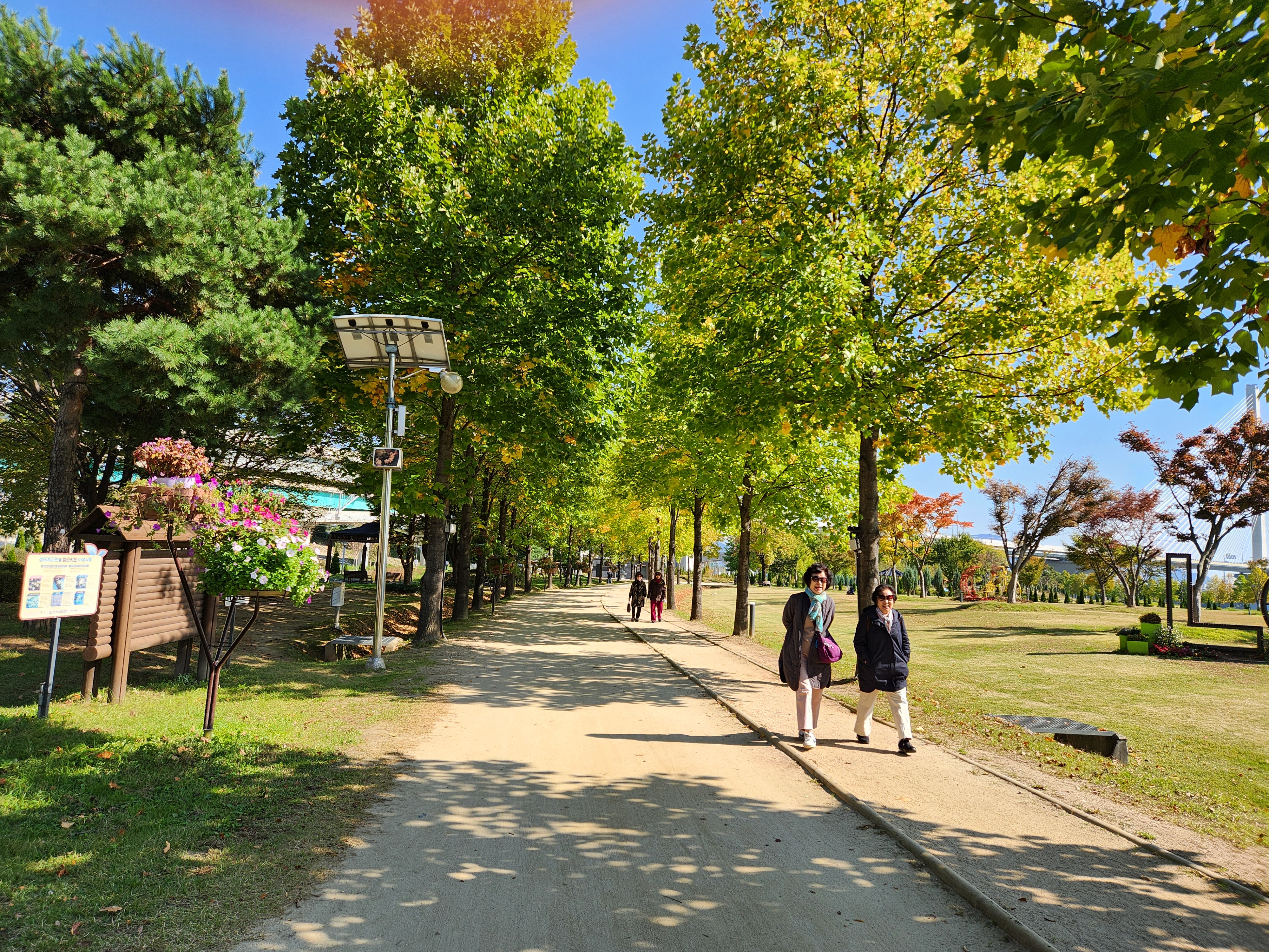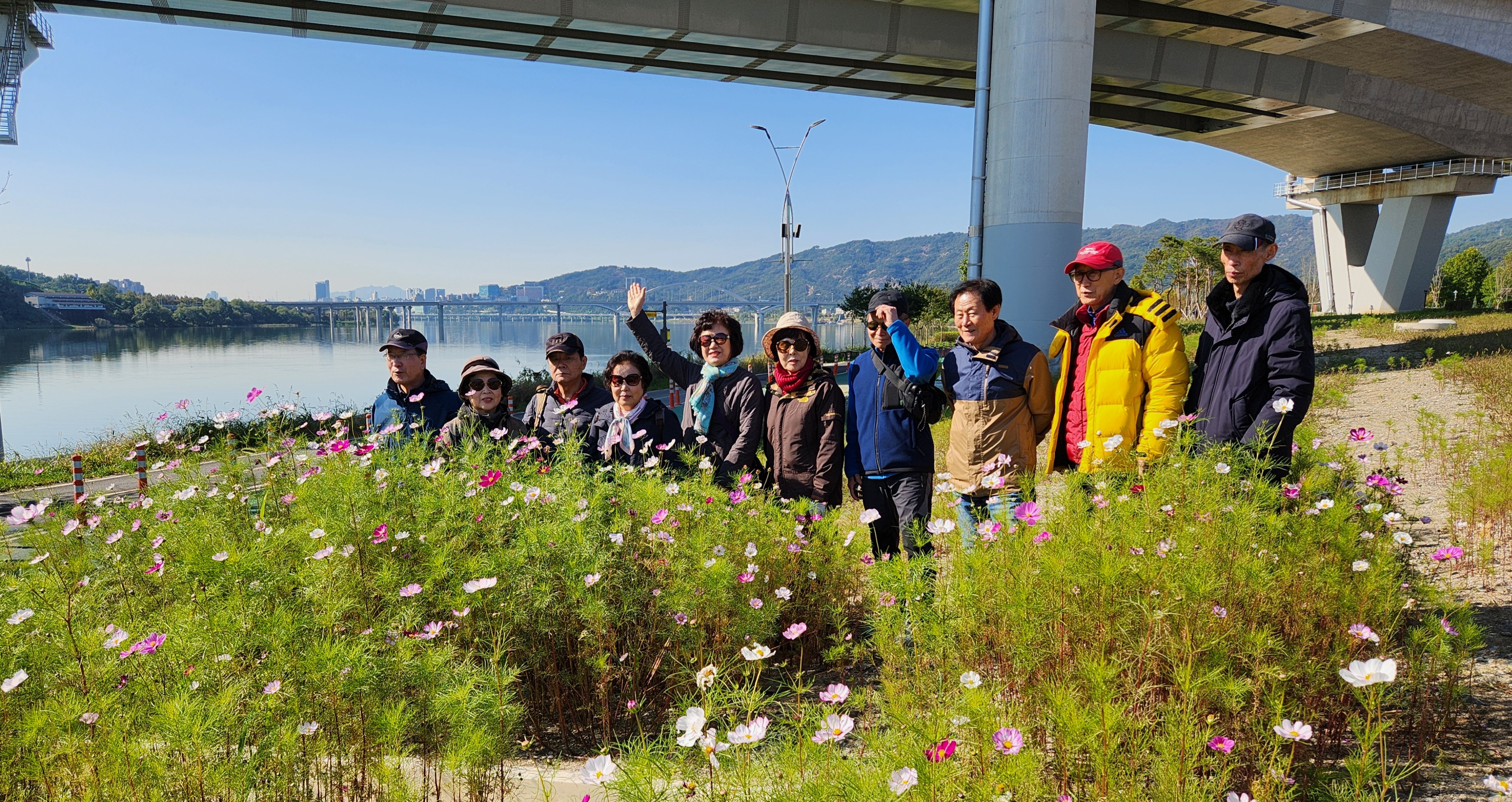 꽃이야 있건없건 친구와 가족들이 함께 경관 좋은 한강변을 거니는 자체만 해도 좋다. 특이한 백합나무 가로수가 운치있게 도열하듯 서있고 미처 다 잘라내지 못한 코스모스가 굽은 나무가 선산을 지키듯 구석구석에 남아 있어 기념촬영을 하게 해준다.