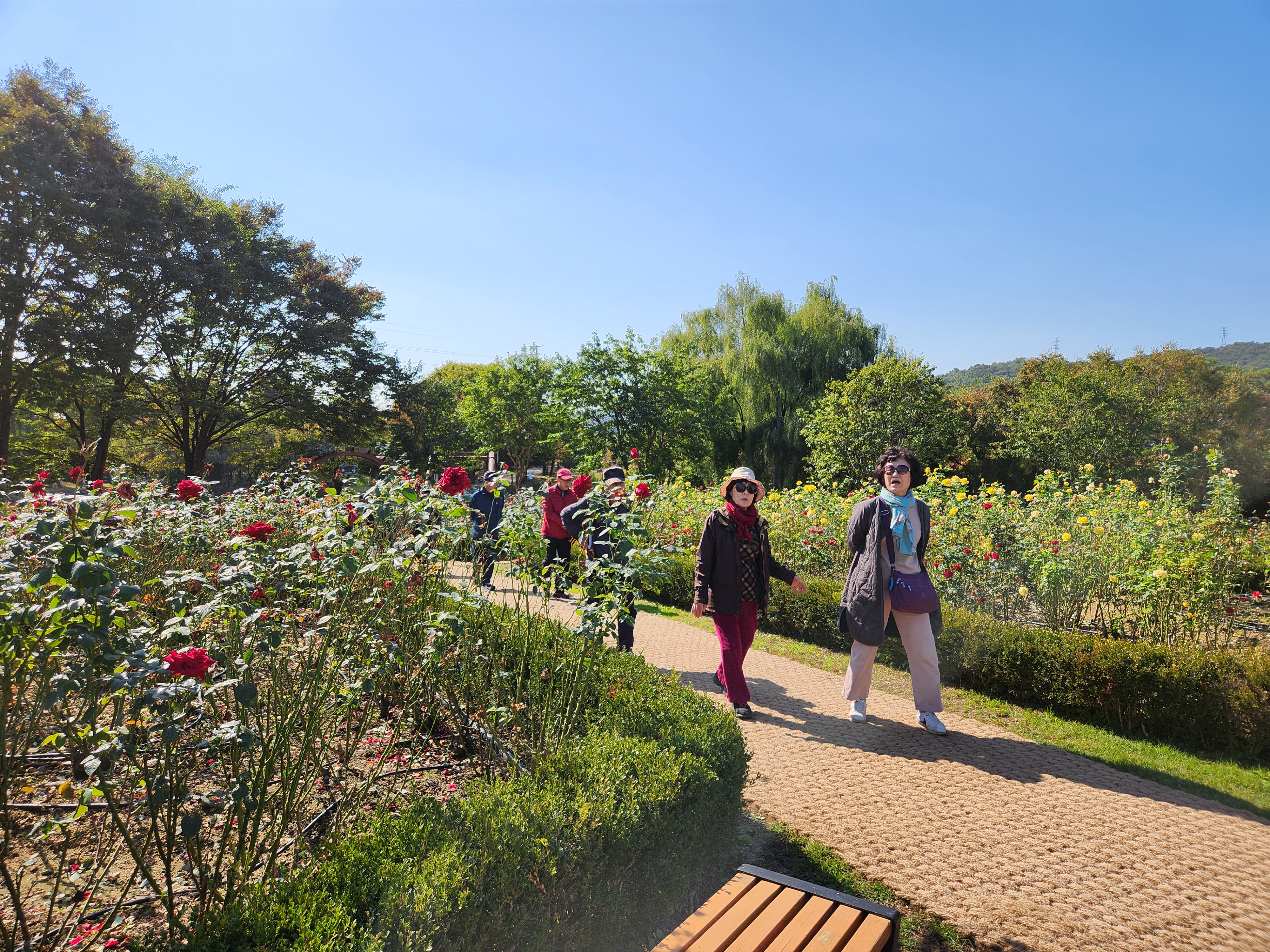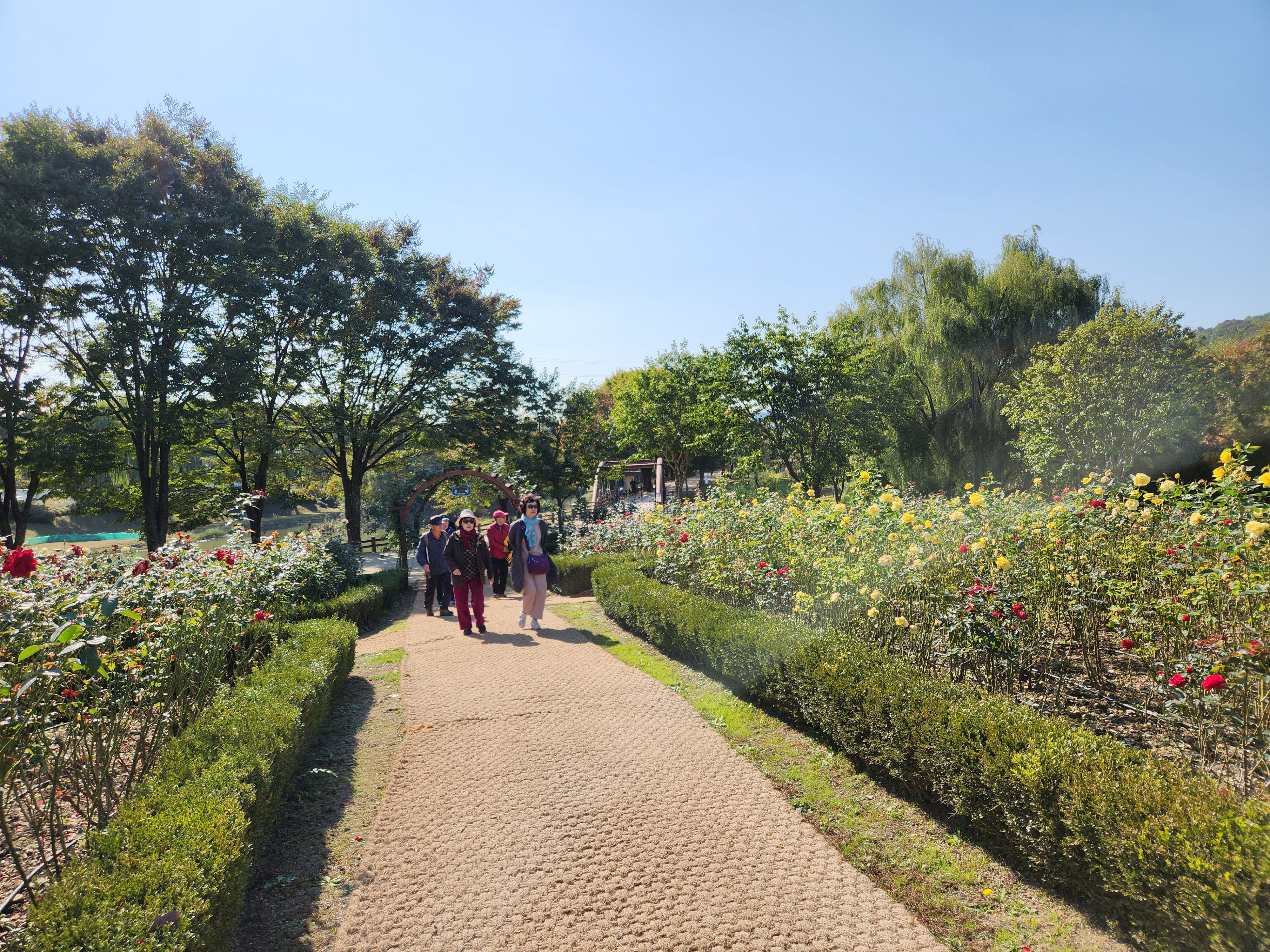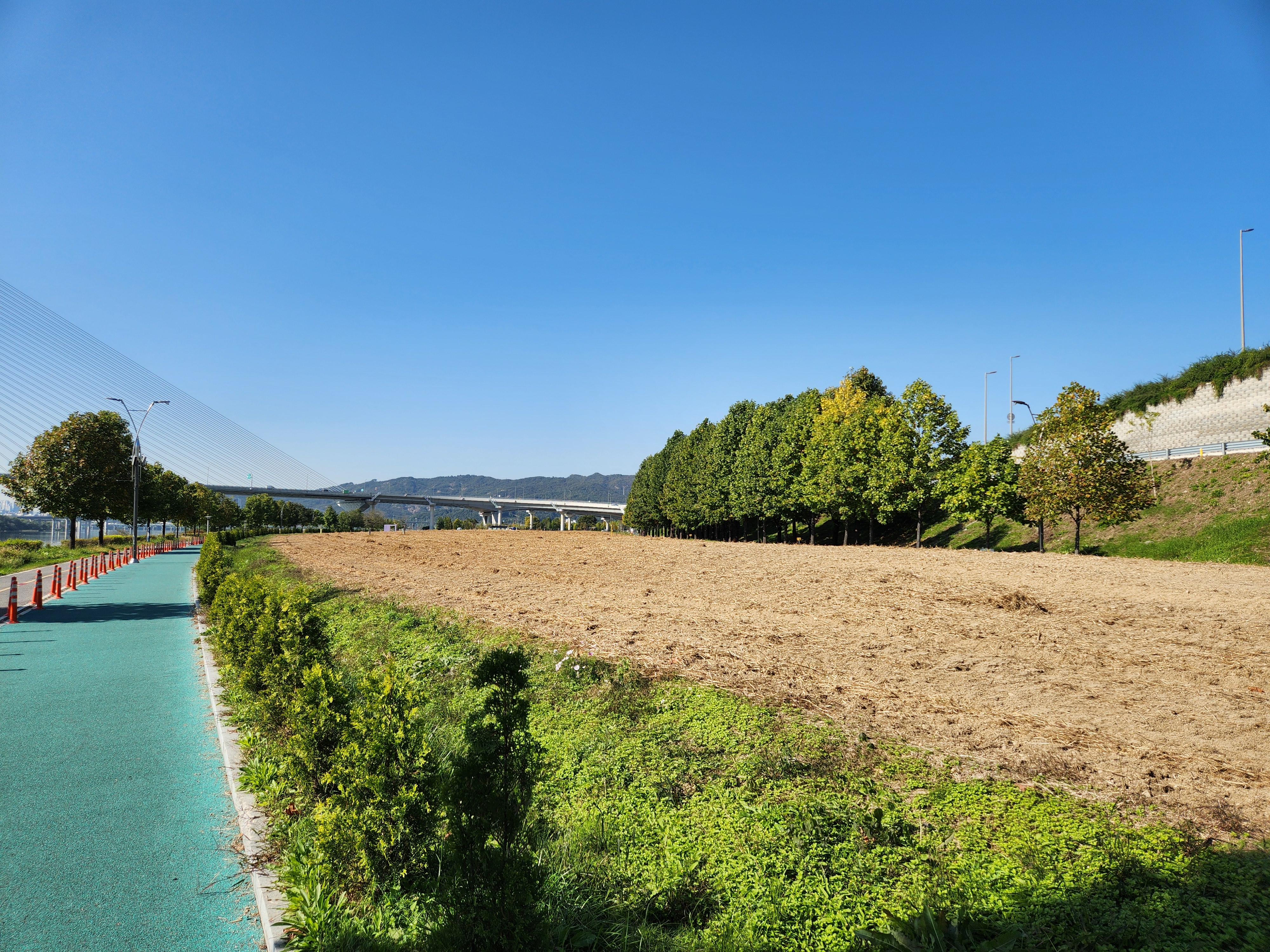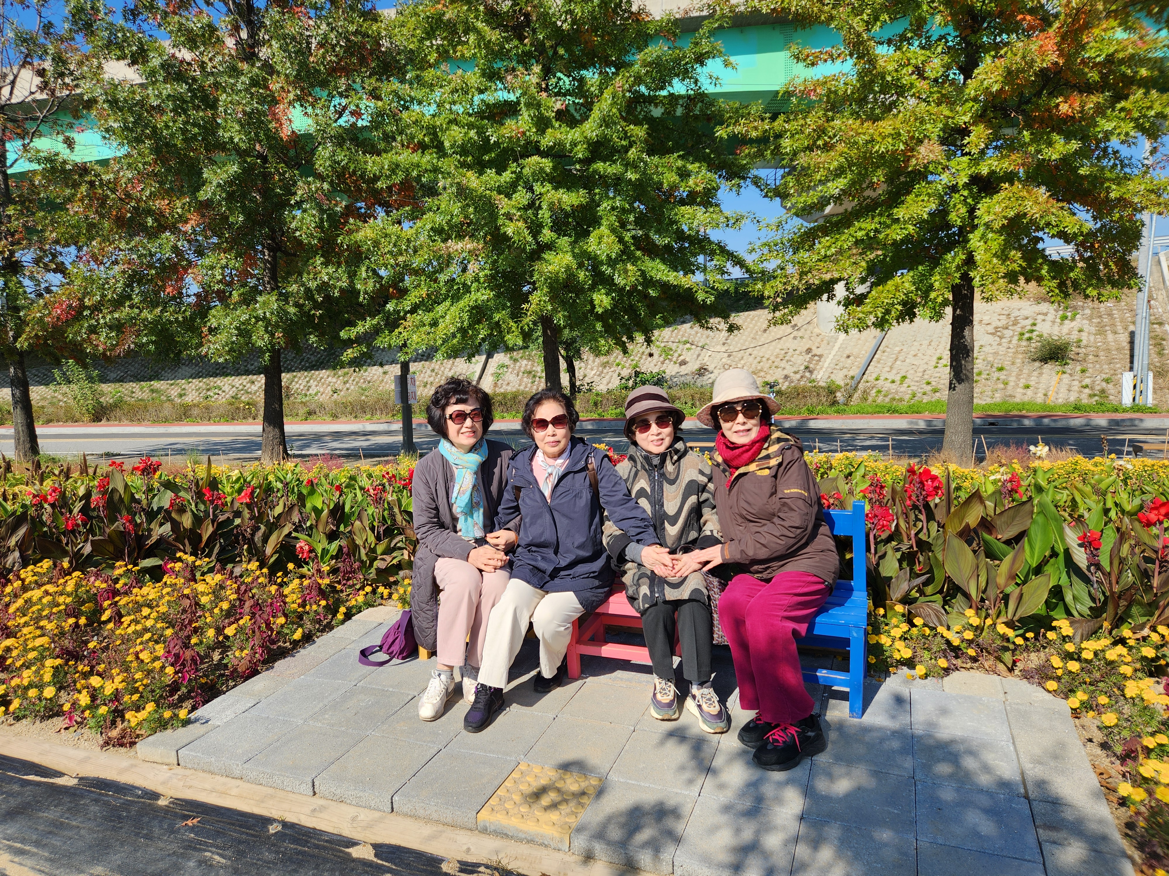 꽃이야 있건없건 친구와 가족들이 함께 경관 좋은 한강변을 거니는 자체만 해도 좋다. 특이한 백합나무 가로수가 운치있게 도열하듯 서있고 미처 다 잘라내지 못한 코스모스가 굽은 나무가 선산을 지키듯 구석구석에 남아 있어 기념촬영을 하게 해준다.