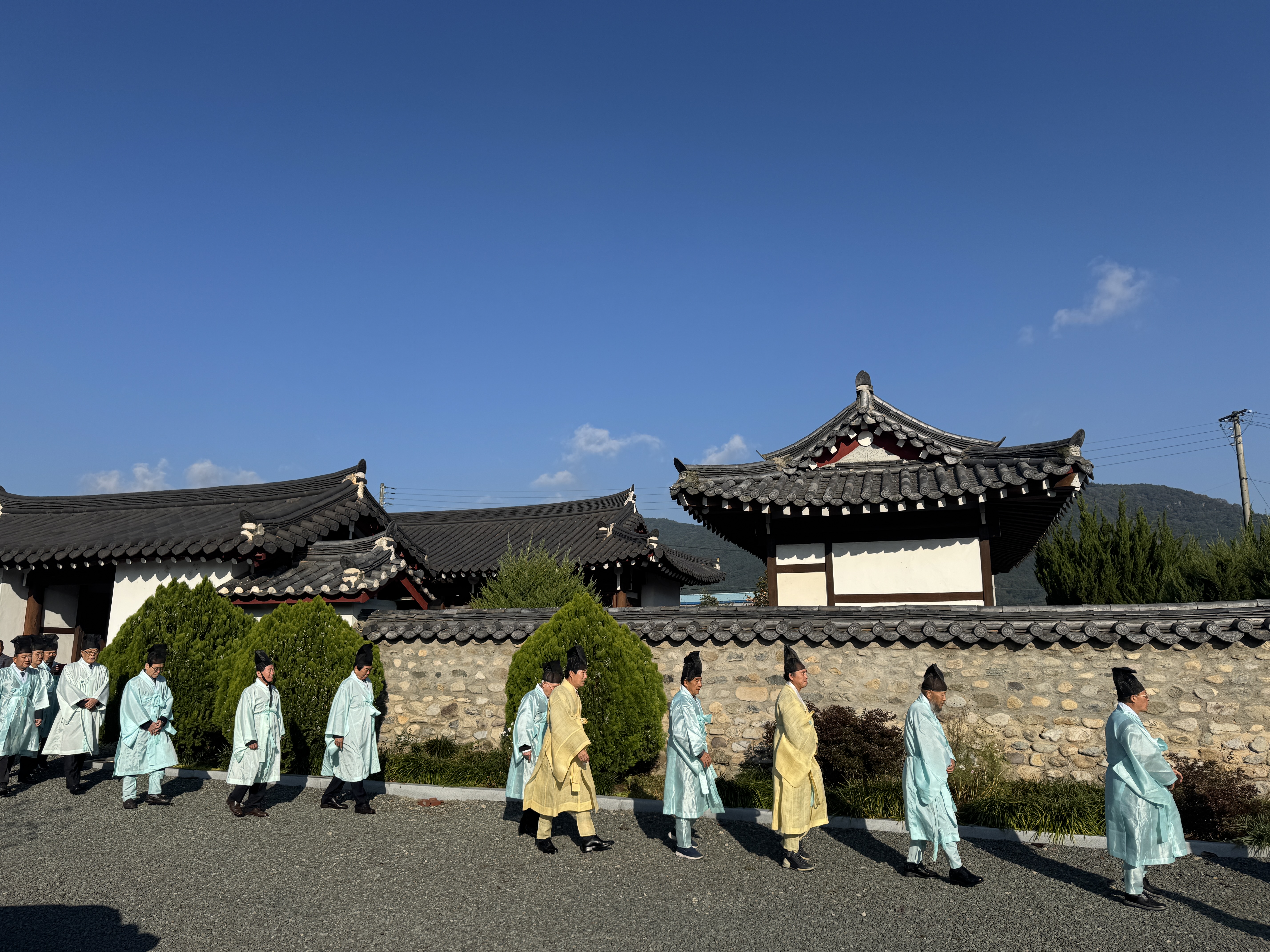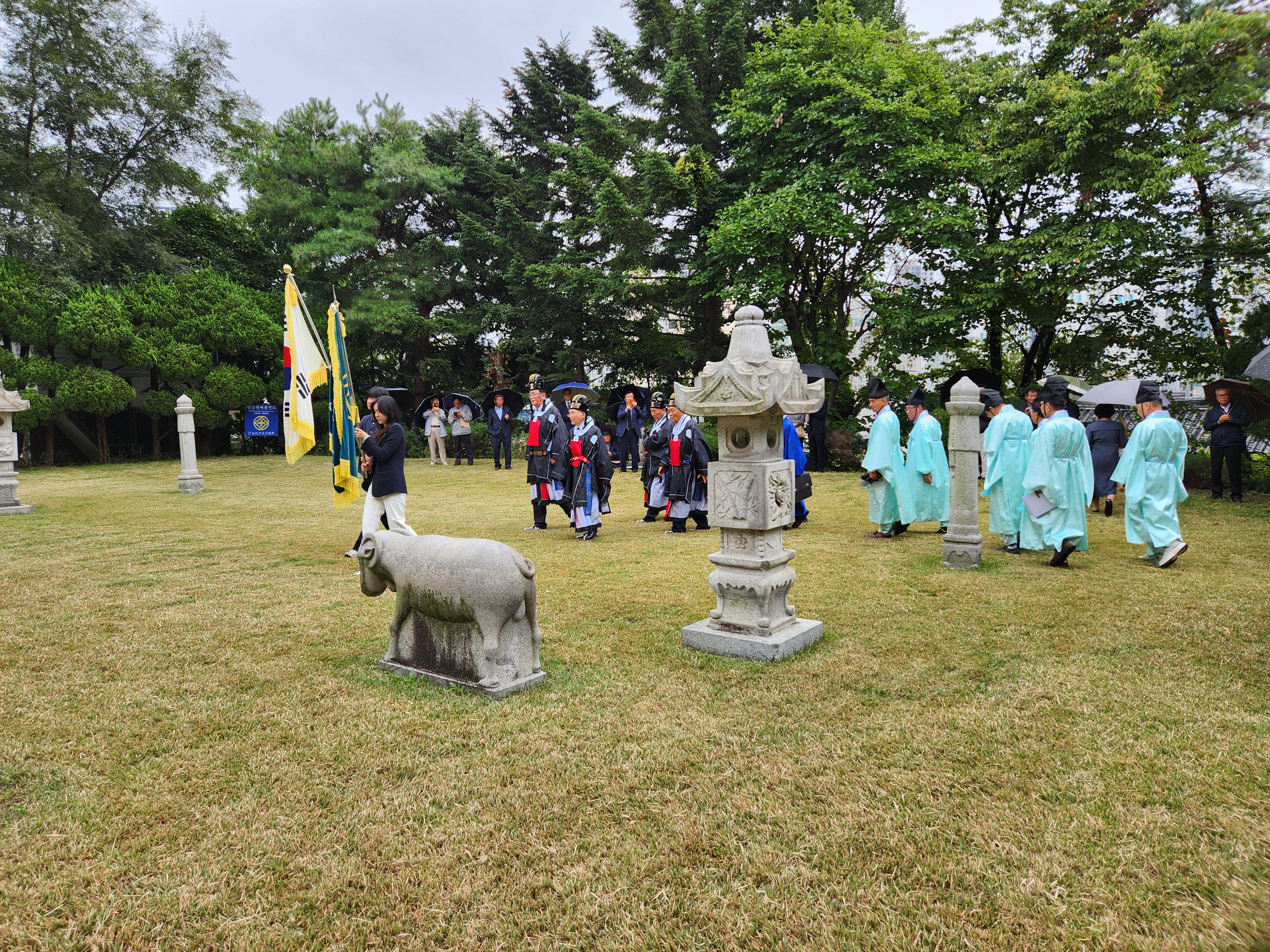 태극기와 宗旗를 앞세우고 헌관과 제집사가 재실에서 단소로 이동