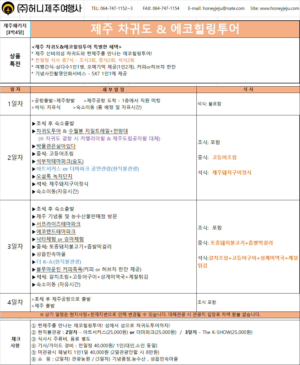 여행일정은 아래와 같은데 날씨에 따라 섬으로 못갈 수도 있고 앞뒤 순서는 바뀐다. 허니제주에서 이 스케쥴로 진행하는 버스가 적게는 5대, 많게는 10대 정도 움직이니 서로 중첩되지 않게 진행한다.