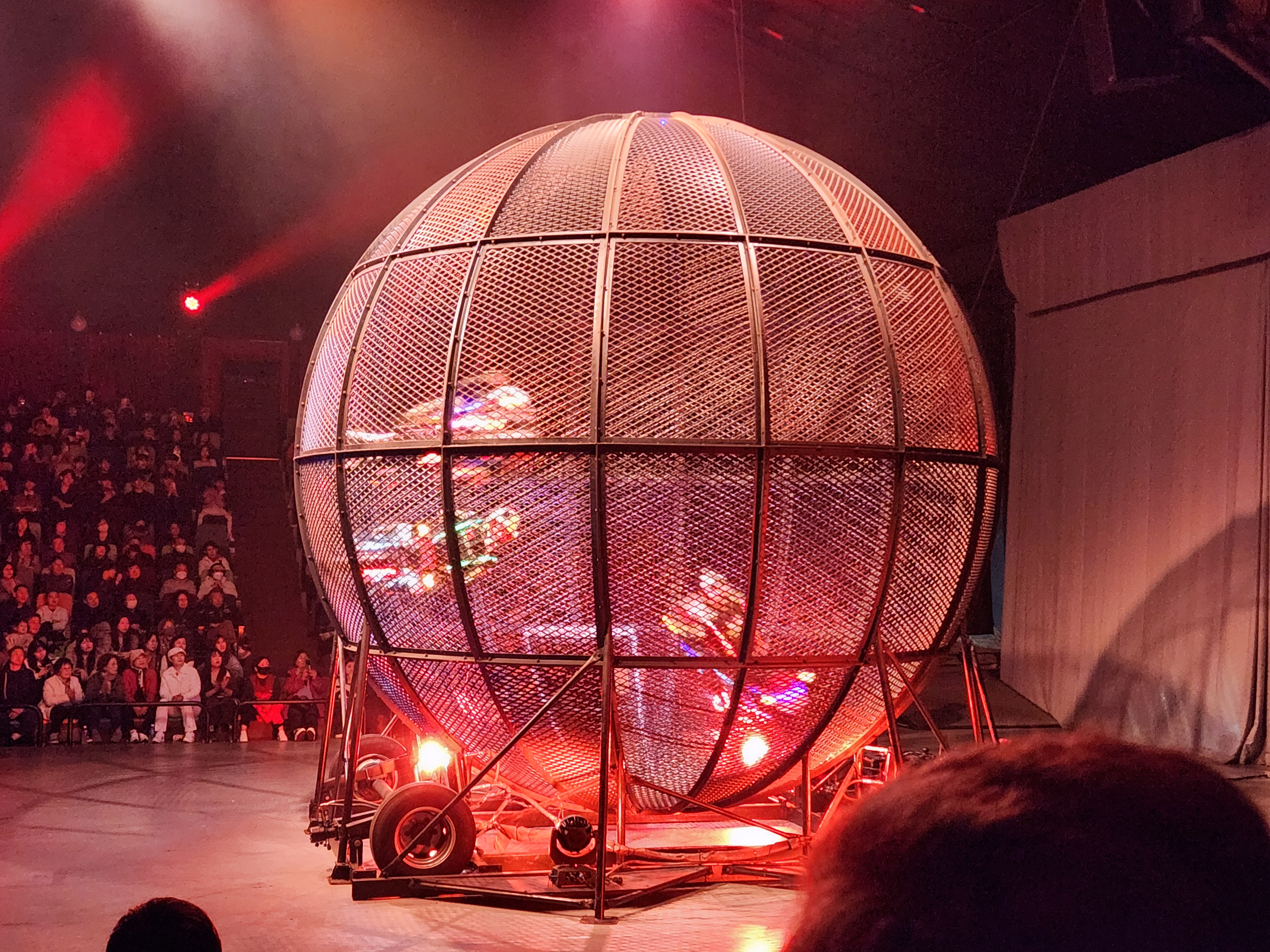 오토바이 4대가 서로 부딪치지 않고 가로세로 돌고 있다.