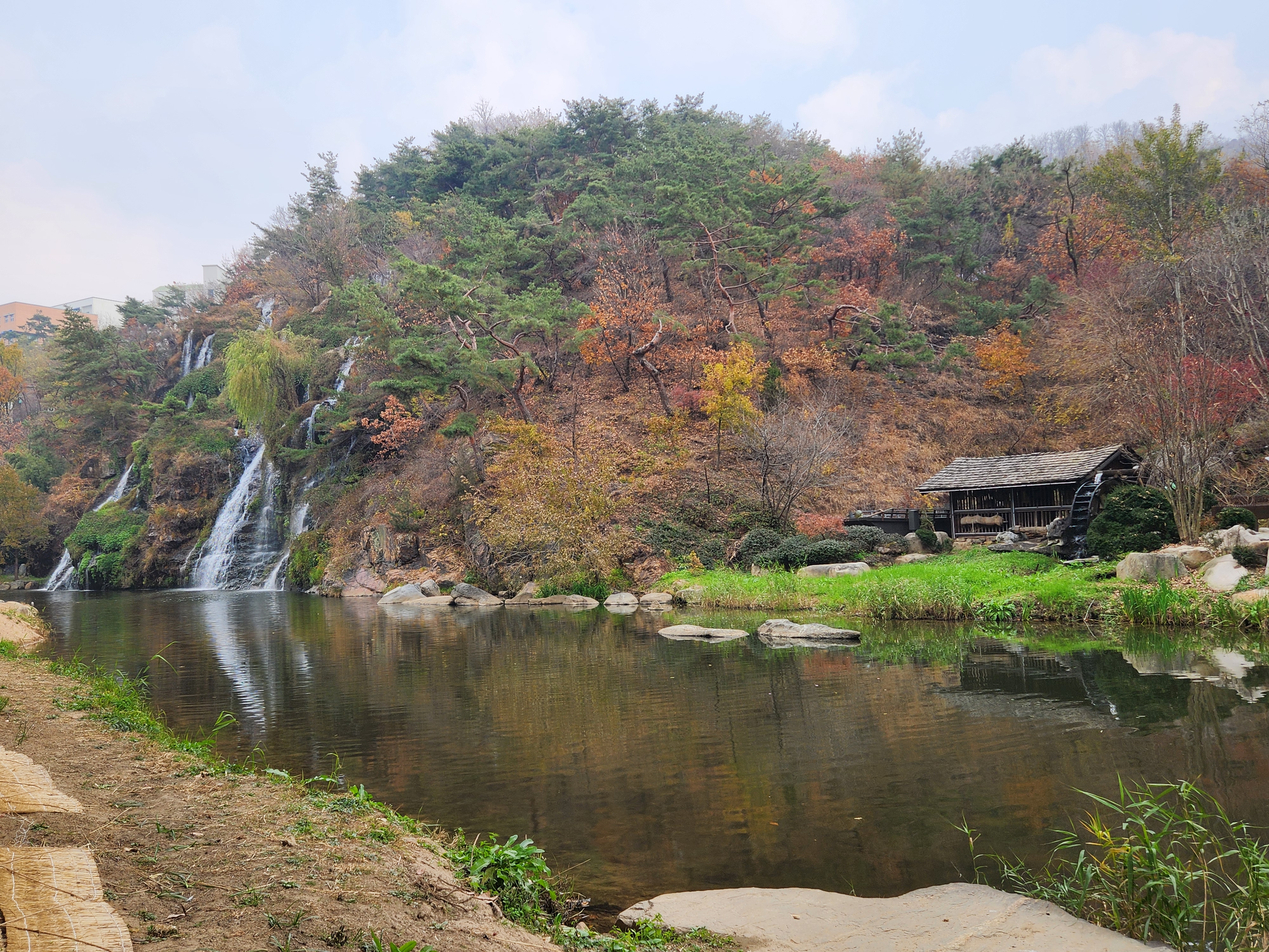 여기는 전혀 상상하지 못한 정경이 나타나는 곳이다. 이런 절경이 가까이에 있다니 놀랍다. 자연폭포는 강우와 계곡물에 따라 물이 많기도 적기도 하지만 여기 인공폭포는 언제나 일정한 물이 사시사철 흘러내린다. 겨울에는 아마 얼음기둥이 형성되는 장관이 될성 싶다. 누가 이런 착안은 해서 시행했는지 참 대견하다. 폭포 맞은편의 내부순환로 고가다리 아래를 카페와 전망대로 조성하고 특히 1층 벽면은 거울을 설치하여 앞으로 뒤로 폭포의 전경이 비치도록 해 두었다. 외국인 관광객이 반수는 되는 듯하다. 모두 입을 다물지 못할 정도로 좋아한다.