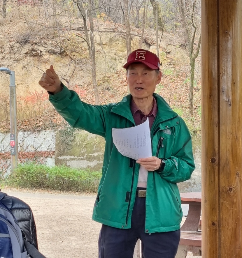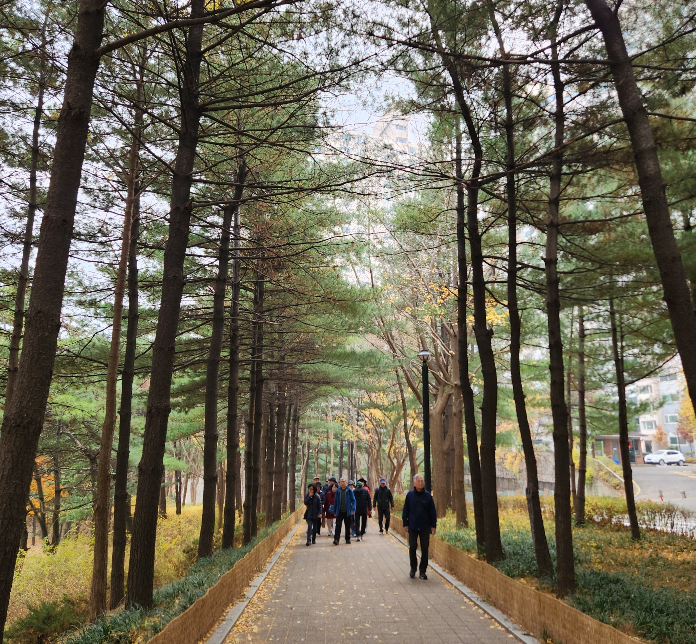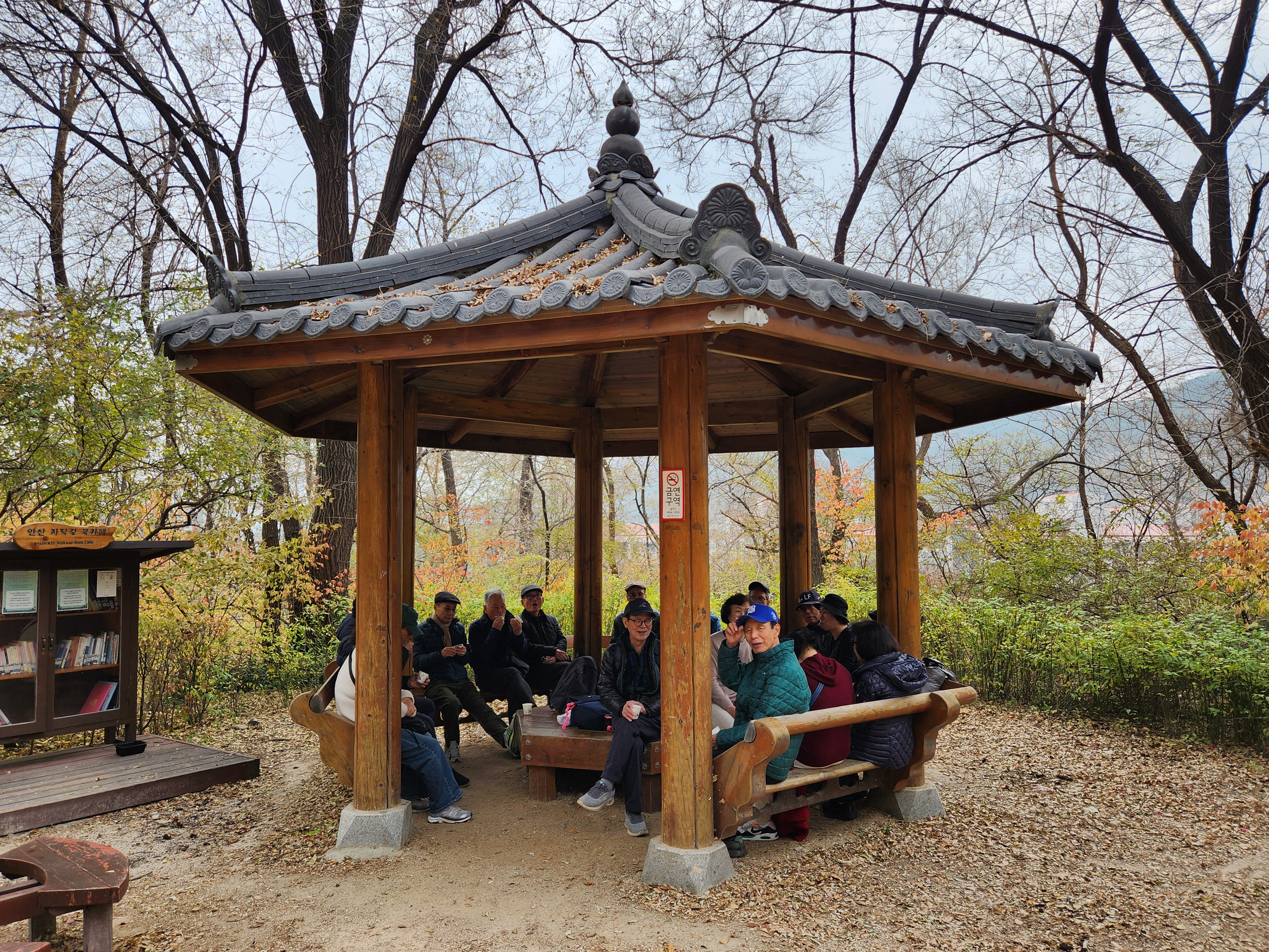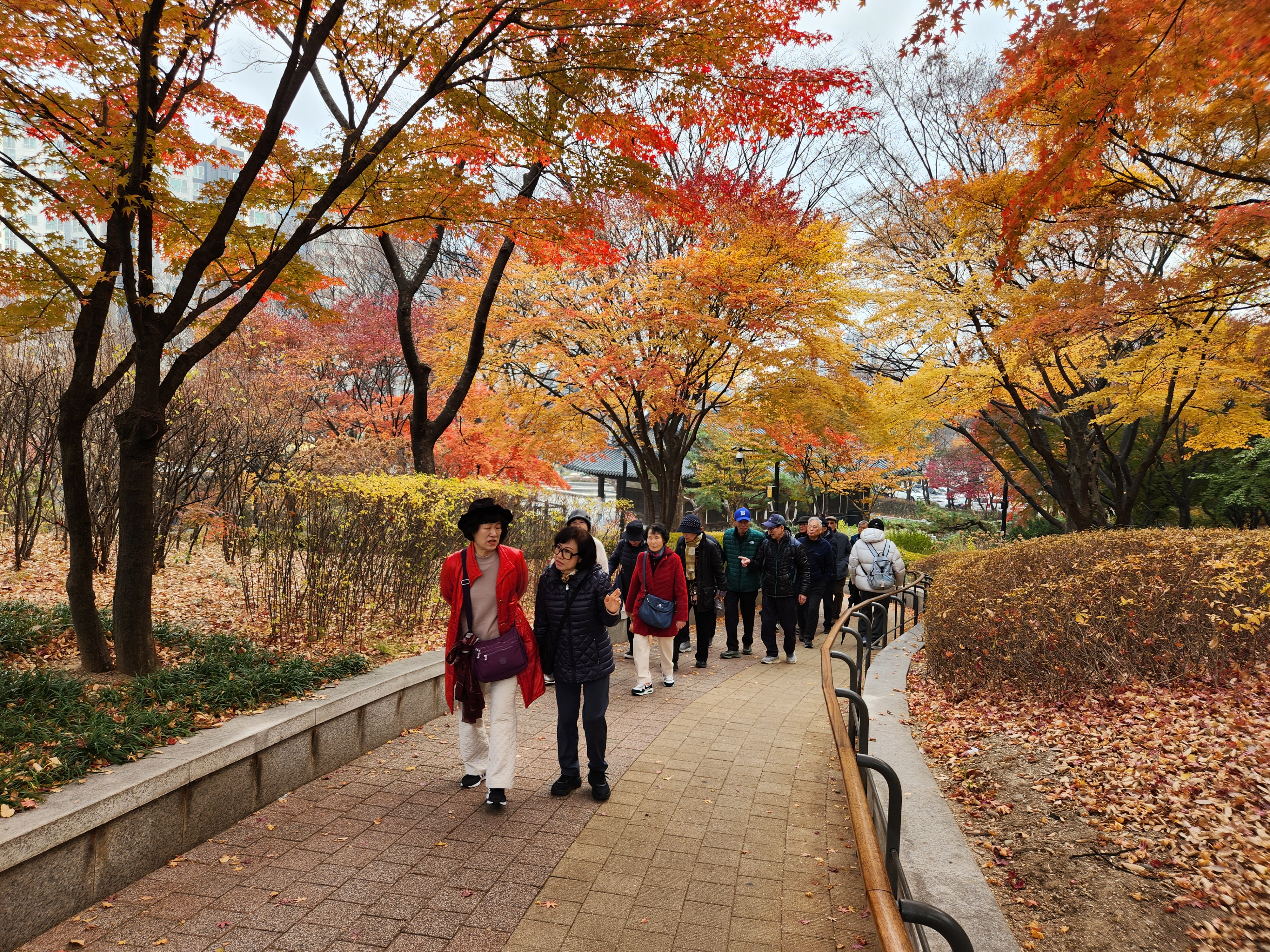 올 가을에 이 코스를 서너번 갔어도 갈때마다 좋고 가는 이들 모두가 편안하고 전혀 상상못한 풍경이라고 감탄한다. 서울에 오래 살았어도 이런 명소가 있는줄 몰랐다고 한다. 걷는 거리가 조금 먼듯 해도 첫 오르막 외에는 거의가 평지이고 오히려 후반에는 서서히 내리막 경사라서 힘들지 않다. 독립공원은 유관순열사상과 순국선열추모탑 옆으로 지나 위쪽에서 내려다보며 설명하고 곧장 안산자락길 데크가 시작되는 초입으로 올라가 잠시 숨을 고르고 물을 마신 뒤 오른쪽으로 북측길로 들어선다. 서울시내와 인왕산쪽 전망이 시원스러운 데크길을 따라 계속 나아간다. 중간쯤에 정자가 있어 둘러앉아 커피와 간식을 나누고 쉬어간다. 준비해간 동요집으로 초등학교때 불렀던 동요를 합창했다. 봄노래를 시작으로 여름, 가을, 엄마, 누나, 동무노래 등등 계속 이어진다.
