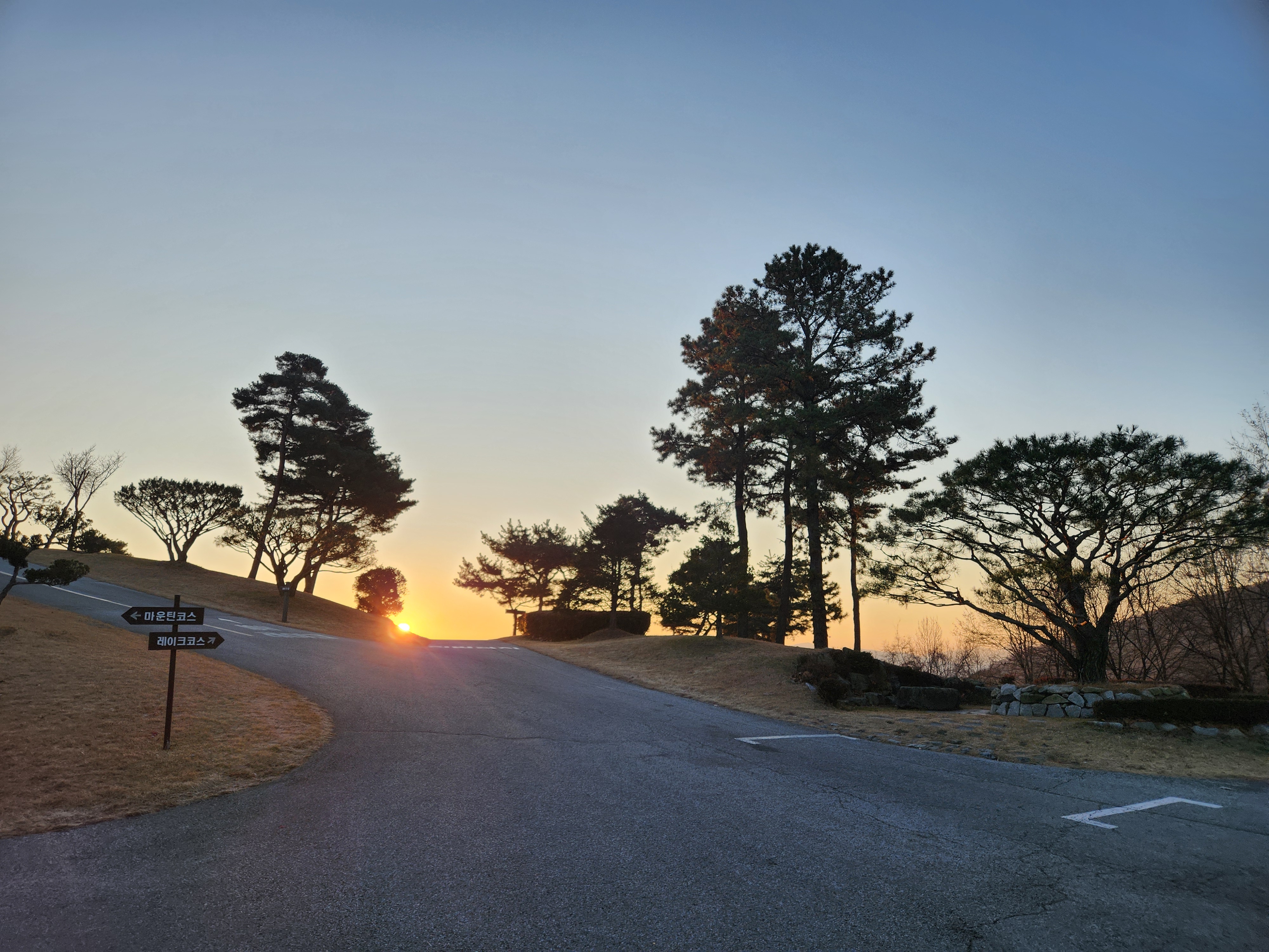 레이크코스로 가는 길위로 찬란한 아침해가 비친다.