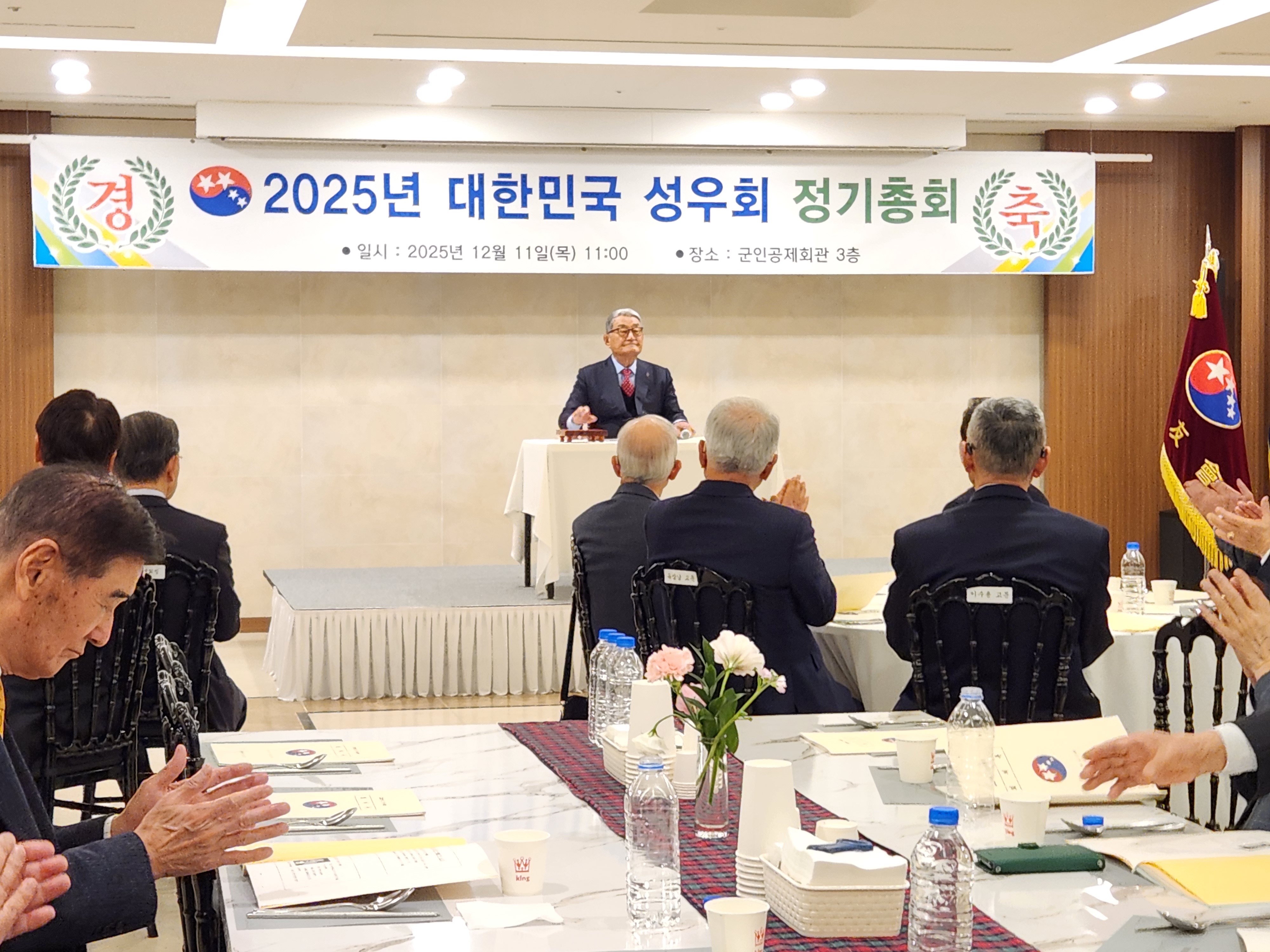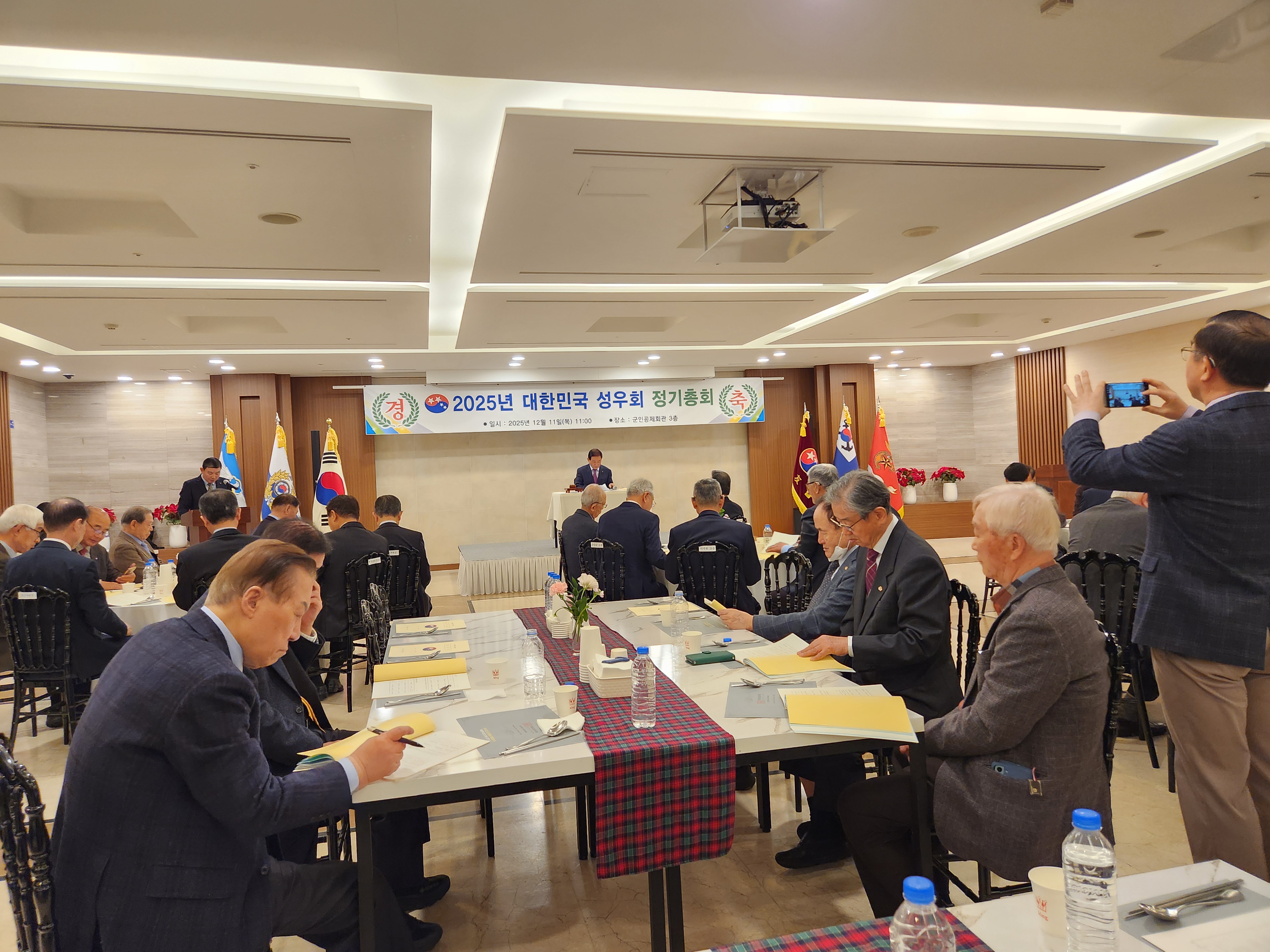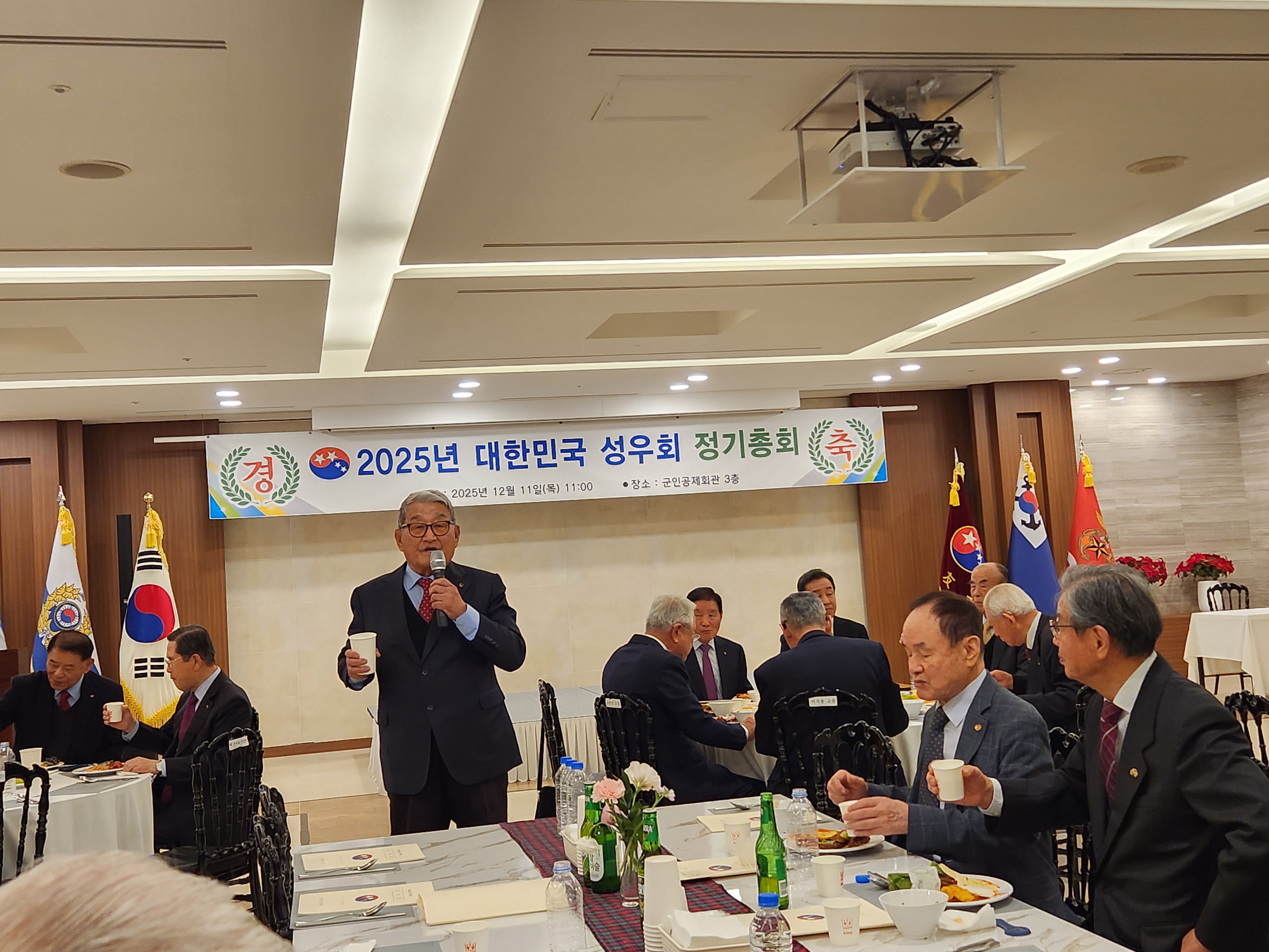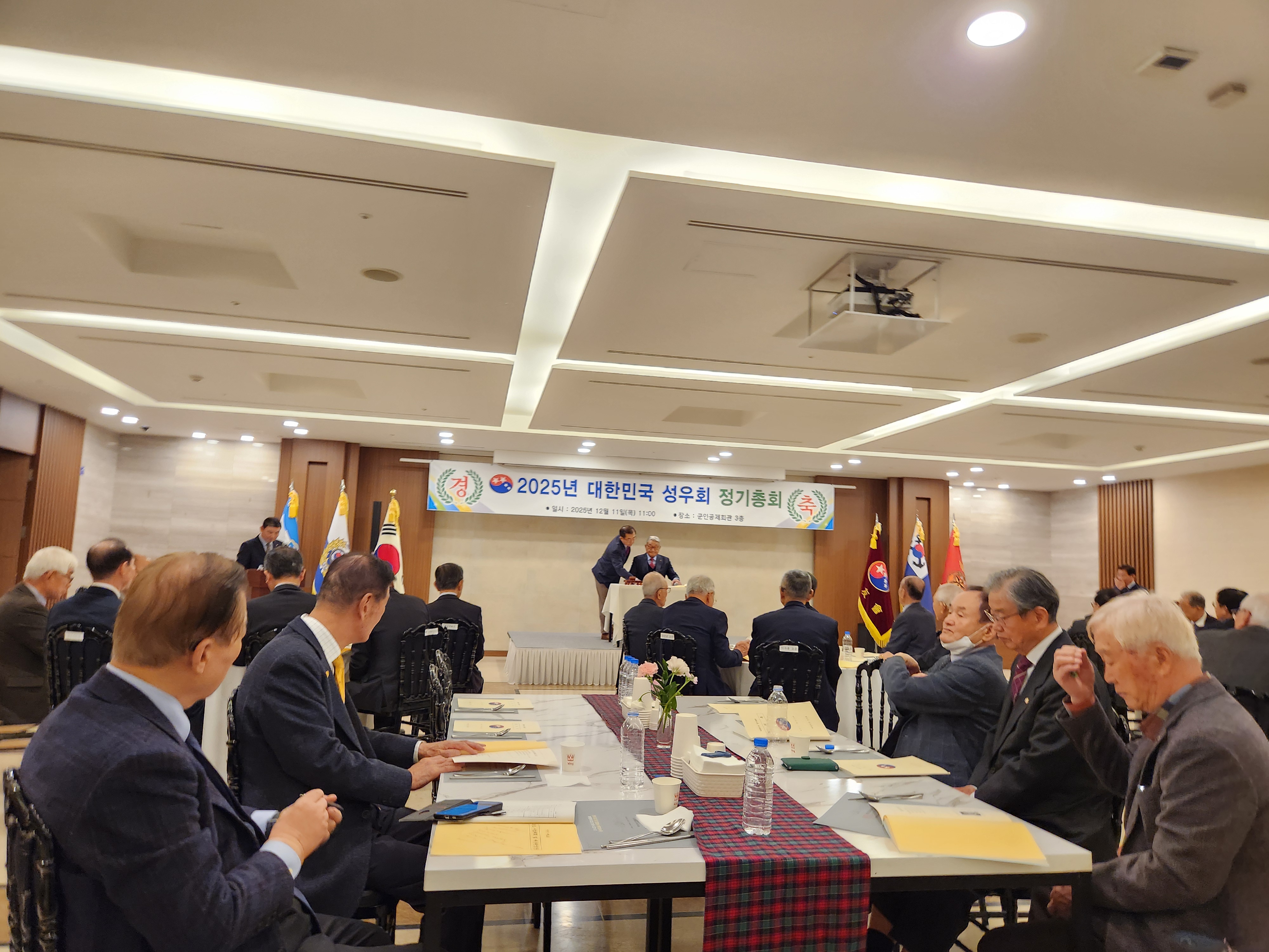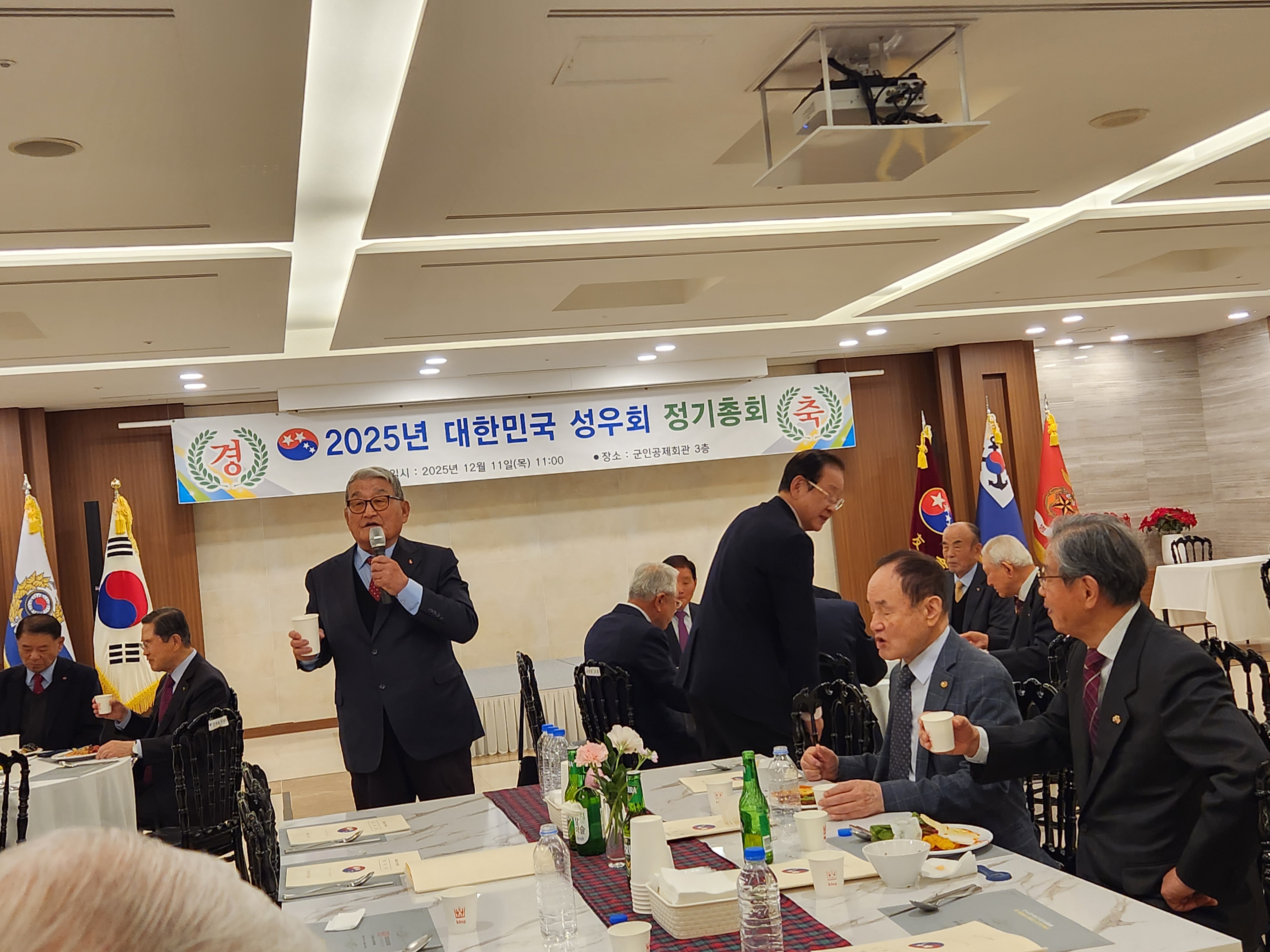 '25.12.11(목) 11시, 군인공제회관에서 星友會총회가 개최되어 업무보고에 이어 임충빈회장에 이어 향후 2년간 회장의 역할을 하게 될 후임으로 해군 박인용제독이 선출되어 새로 구성된 회장단이 인사를 하고 힘찬 새출발을 다짐했다.