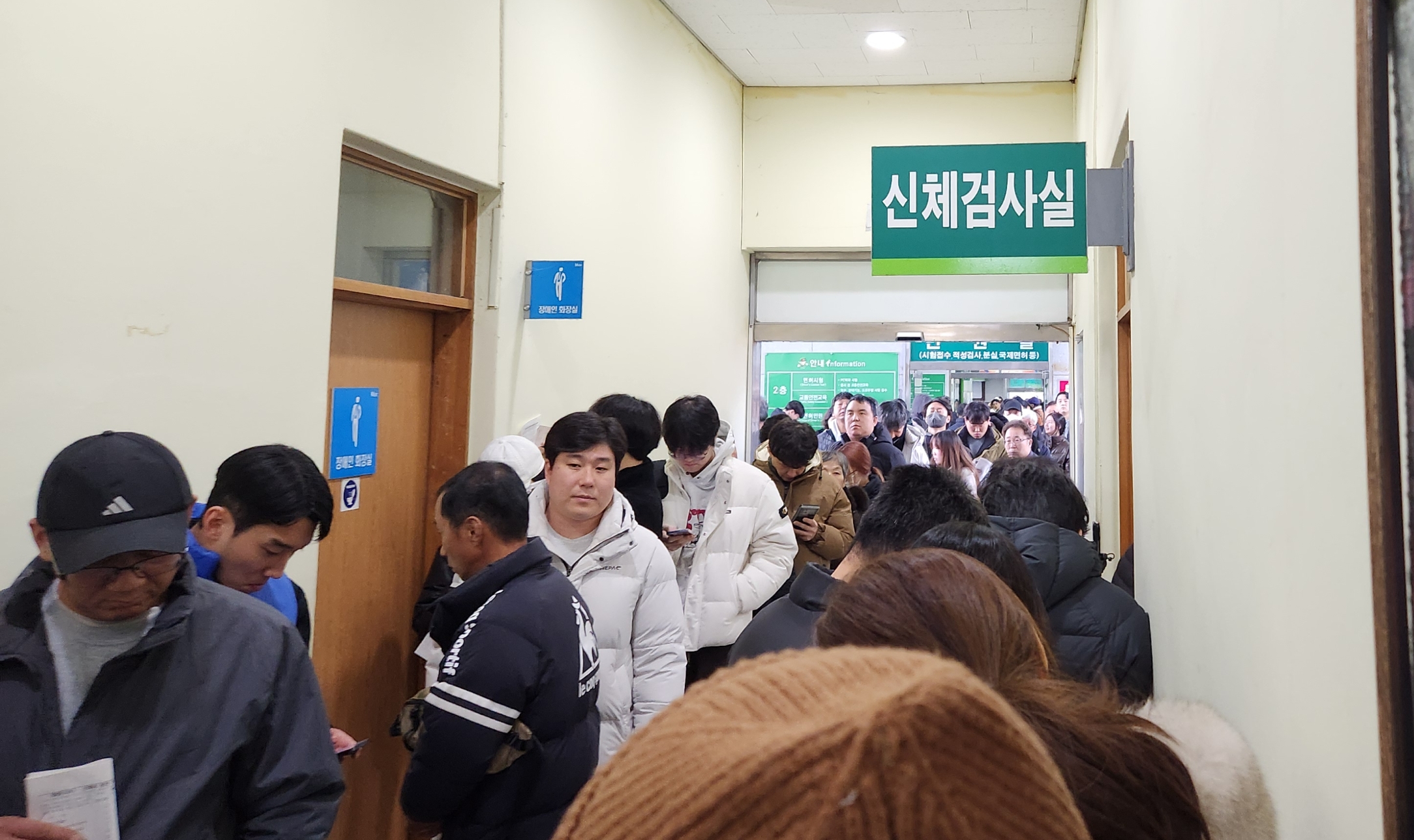 신체검사 대기줄이 100명넘게 구불구불 서있다. 눈맛사지를 하고 지압을 하면서 30여분 넘게 기다려 시력검사를 했다. 한쪽은 또렷이 보이는데 한쪽은 흐릿하다. 한쪽눈은 가까이가 잘 보이고 다른 쪽은 멀리가 잘 보이니 이래저래 불편함이 없는데 검사를 해서 점수를 매기니 문제가 되고 있다. 겨우 합격선 도장을 받았다.