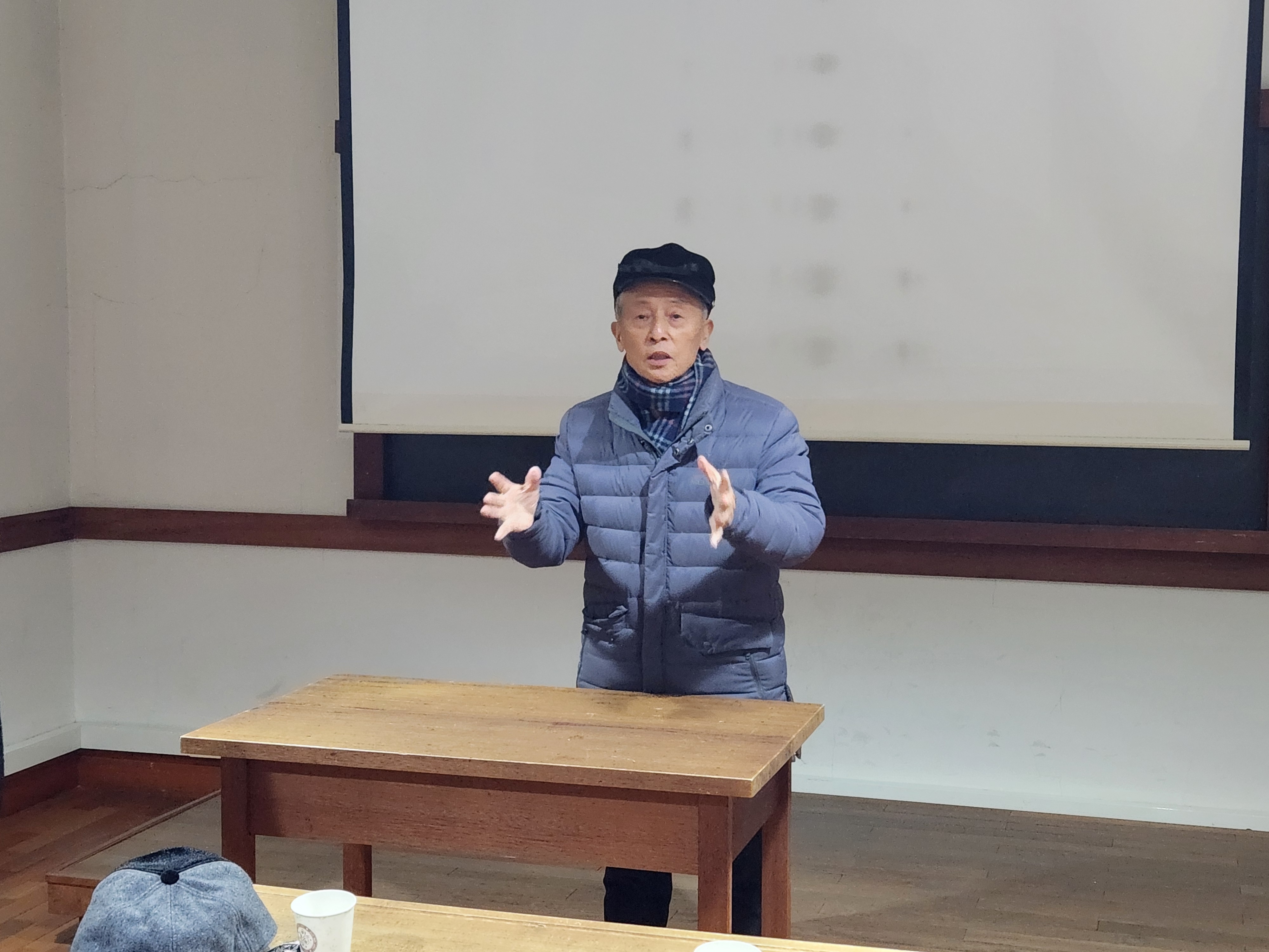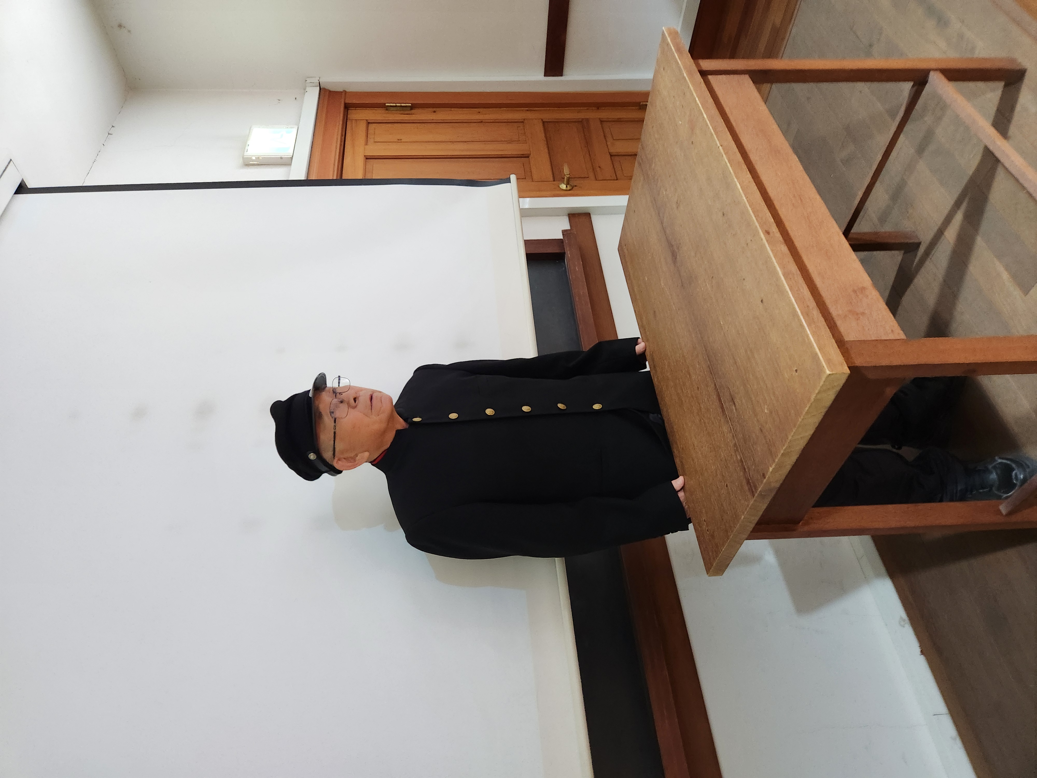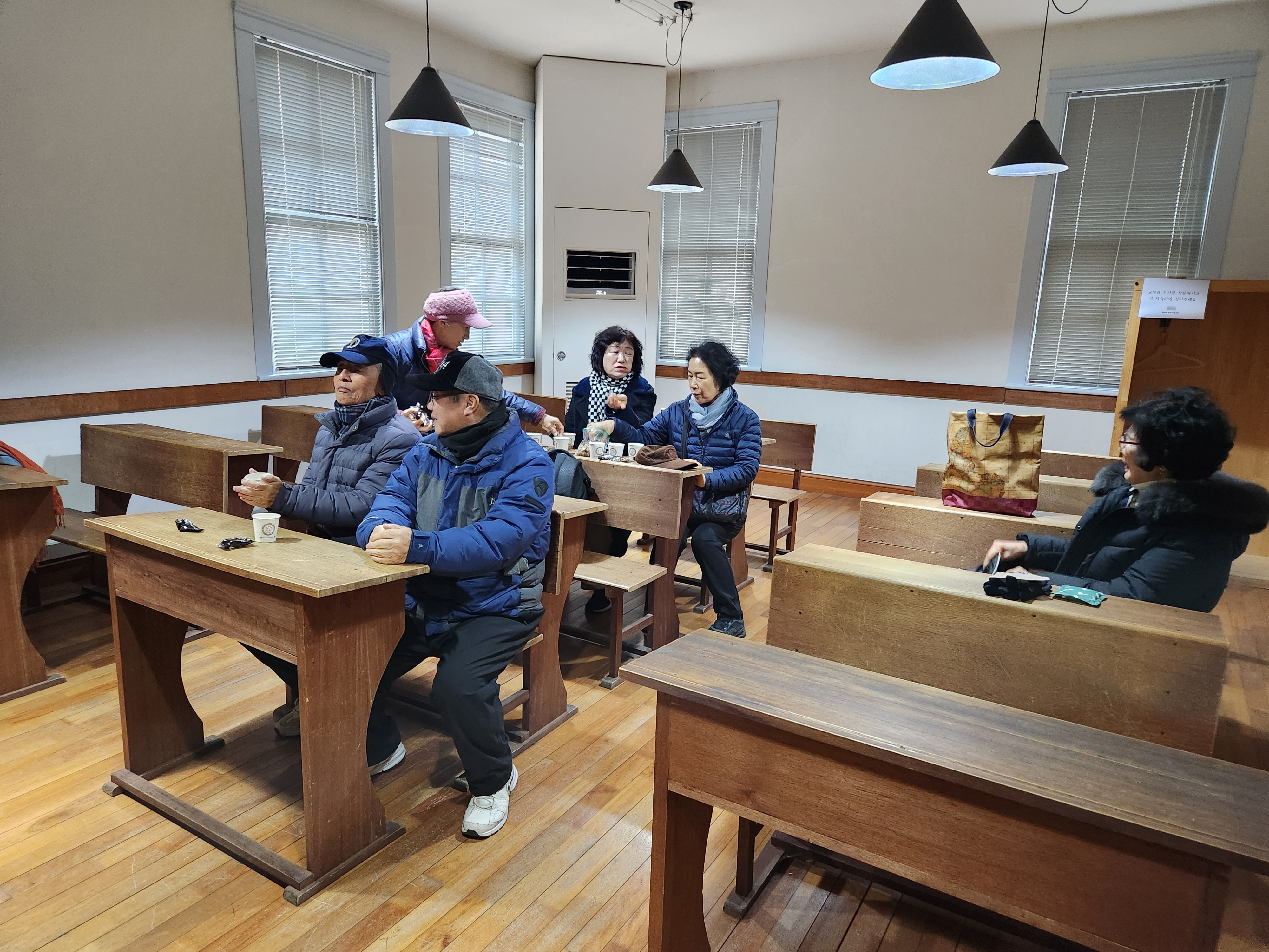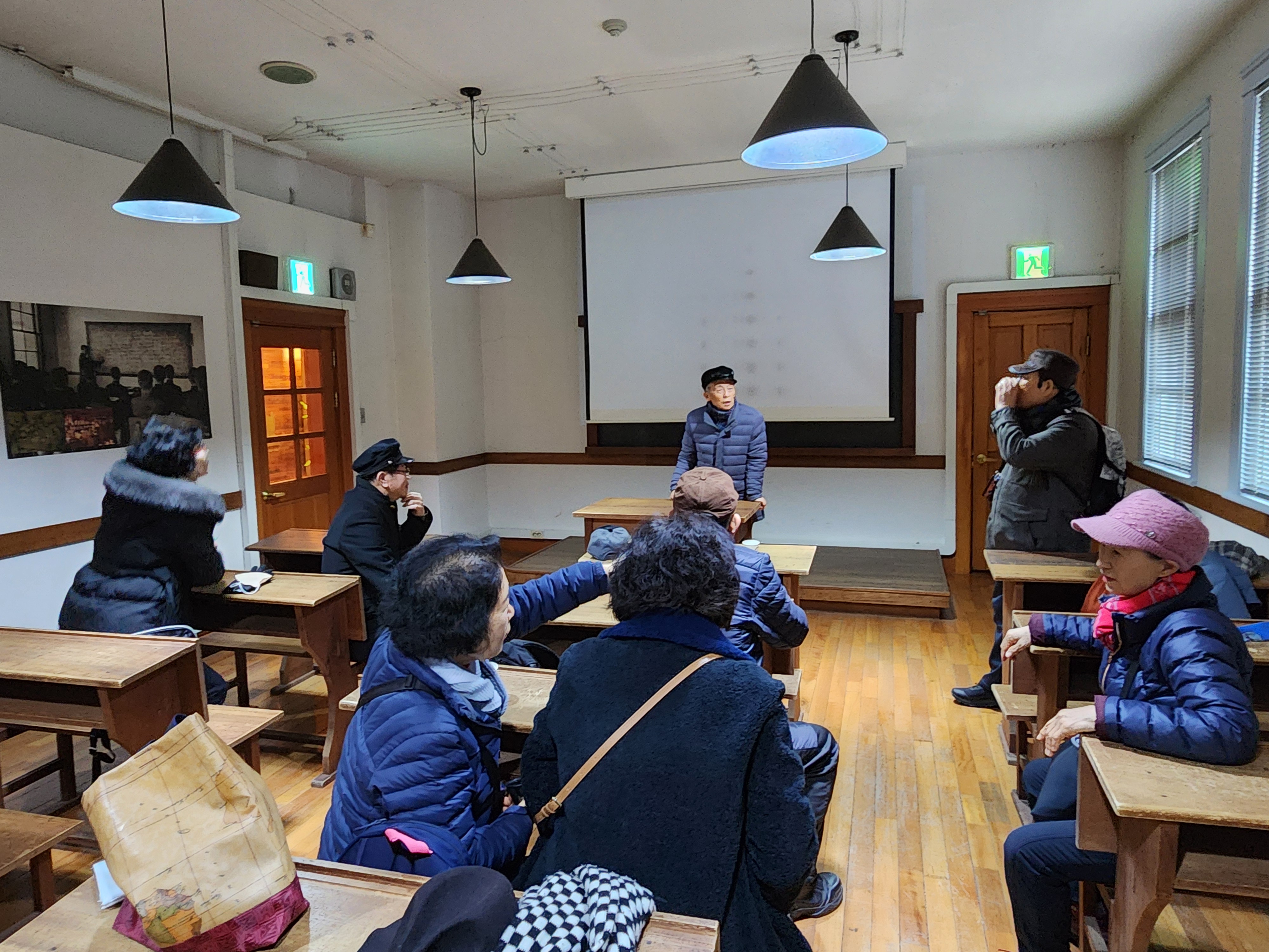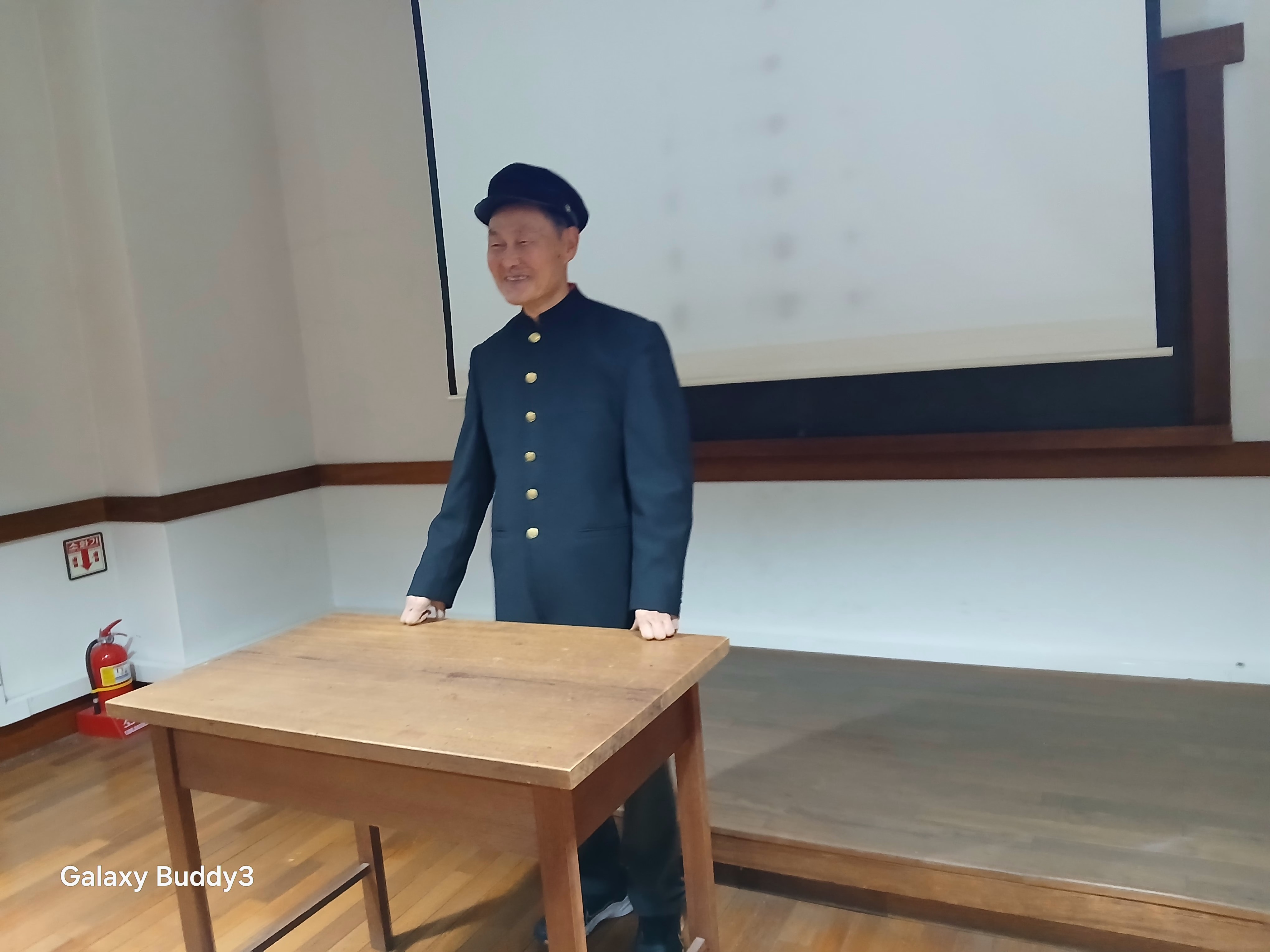 옛교실 하나가 그대로 보존되어 교복과 학생모도 있다. 고등학생 교복과 모자를 쓰고 칠판앞 교탁에 서서 개인별로 짧은 자기소개 연설을 했다. 색다른 분위기다.