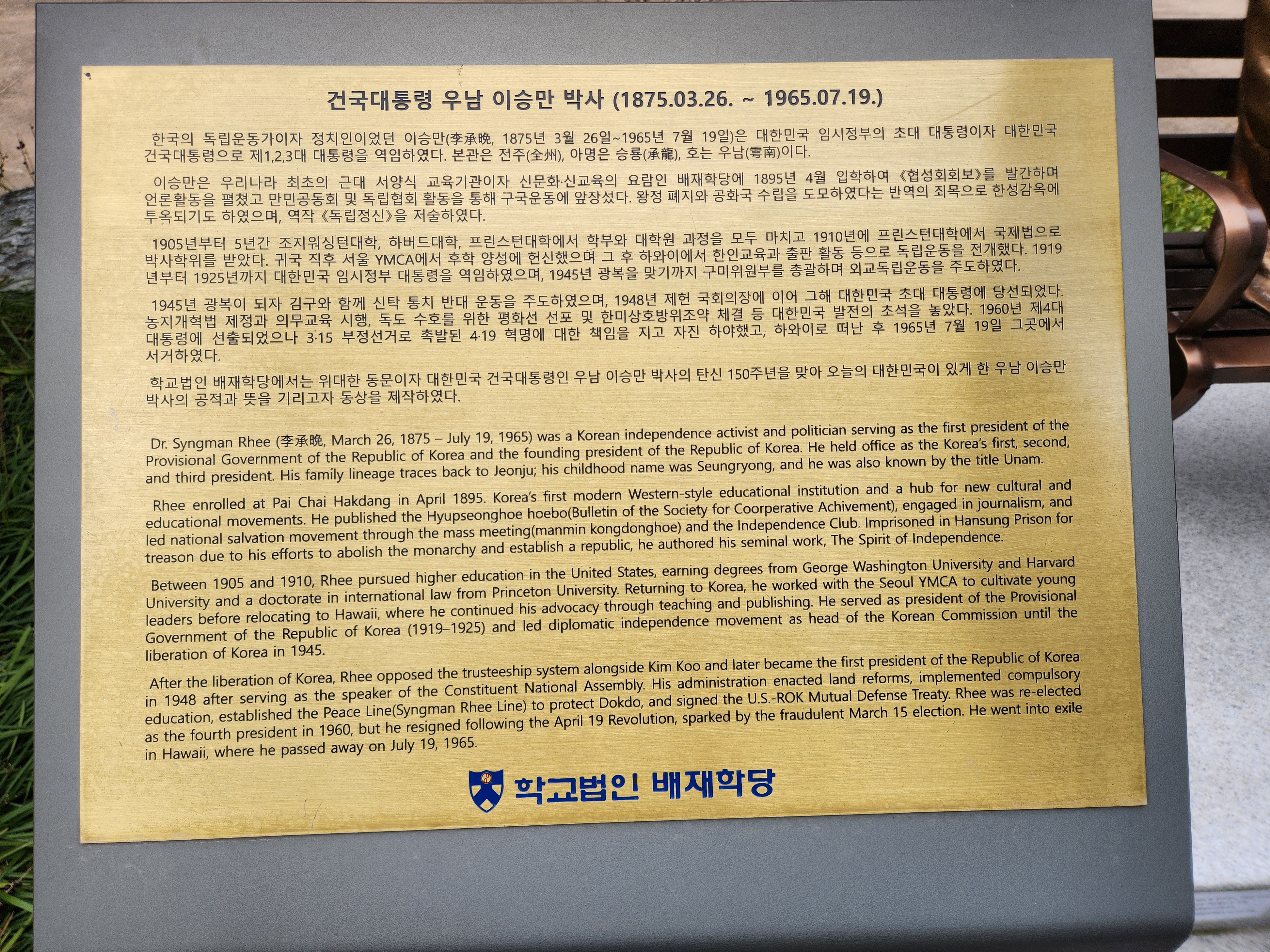 이승만대통령이 수학한 배재학당의 벤치에 동상이 올해에 완성되었다.