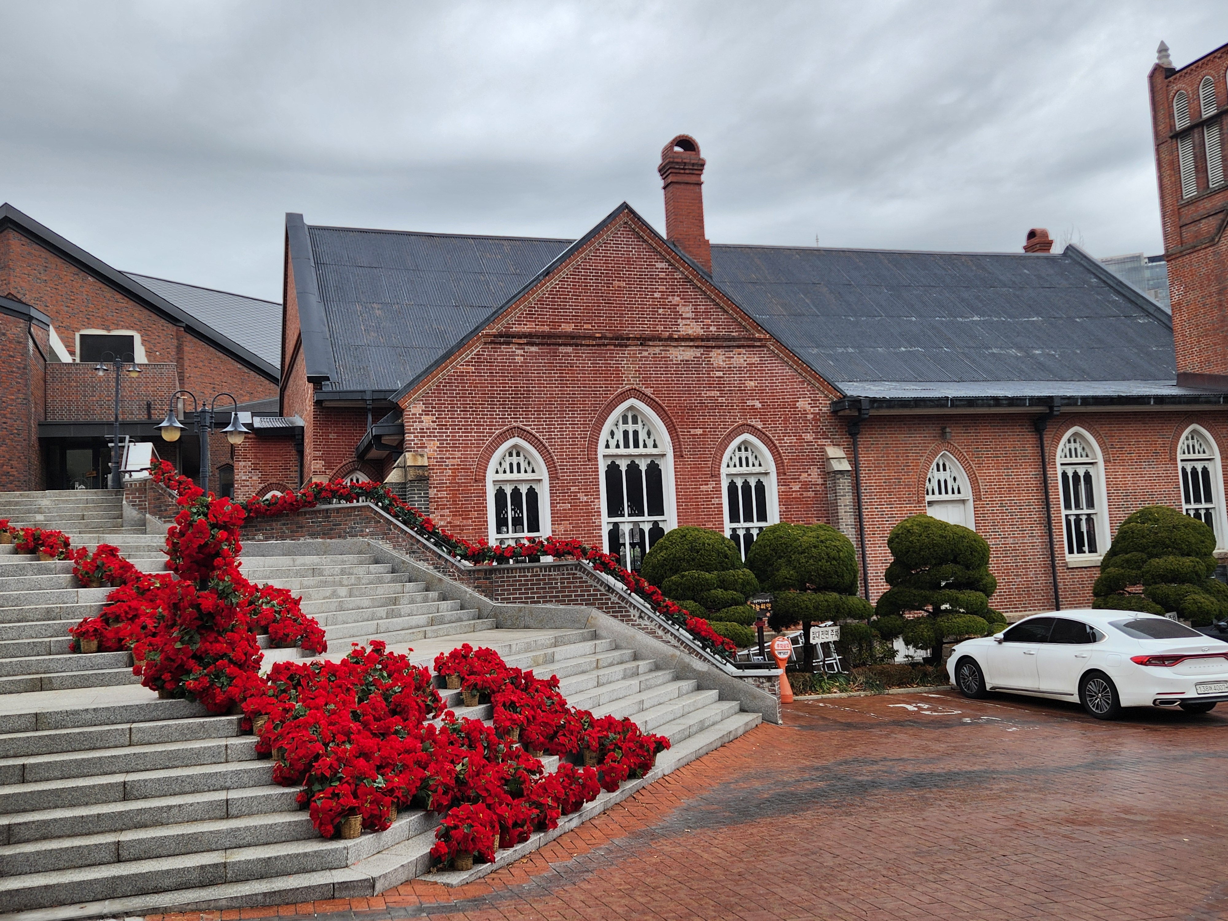 담장너머로 빨간 싼타복 입은 유관순열사상이 보인다.