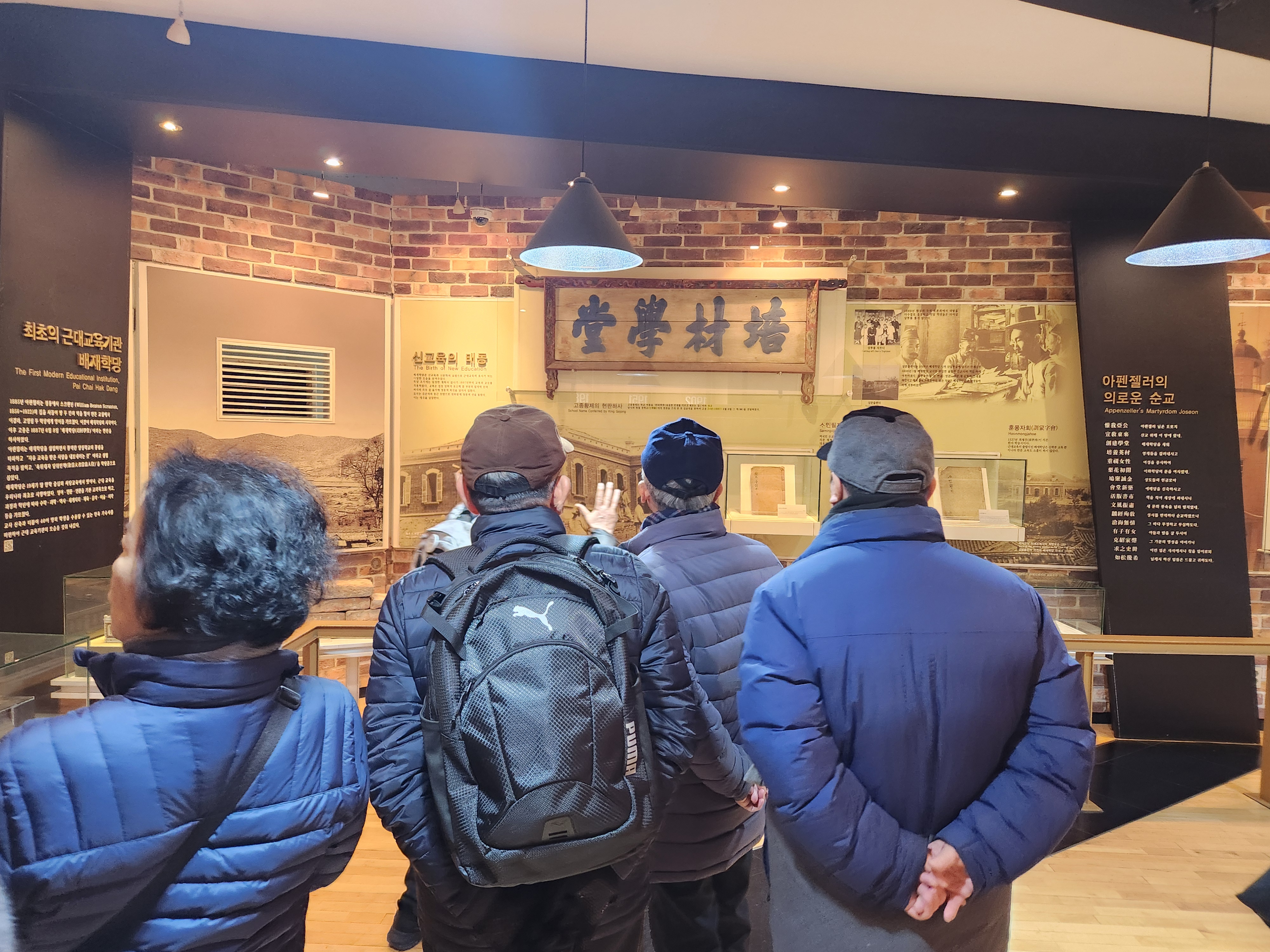 10:30, 시청역 9출구에서 8명이 만나 전문해설사의 안내와 설명으로 투어를 시작했다. 한태식동기가 다녔던 배재고등학교자리의 기념박물관이 첫번째 포인트이다. 아펜젤러선교사가 1885년에 학교를 세우고 학교이름을 고종에게 지어달라고 하여 인재를 배양하는 학교가 되라는 염원으로 '培材學堂'이라는 현판을 하사하셨다. 이승만대통령이 여기서 공부를 하면서 선교사의 한글선생역할을 했고 올해에 기념박물관 앞 벤치에 좌상이 설지되어 곁에 앉아 친근하게 기념사진을 찍을 수 있다.