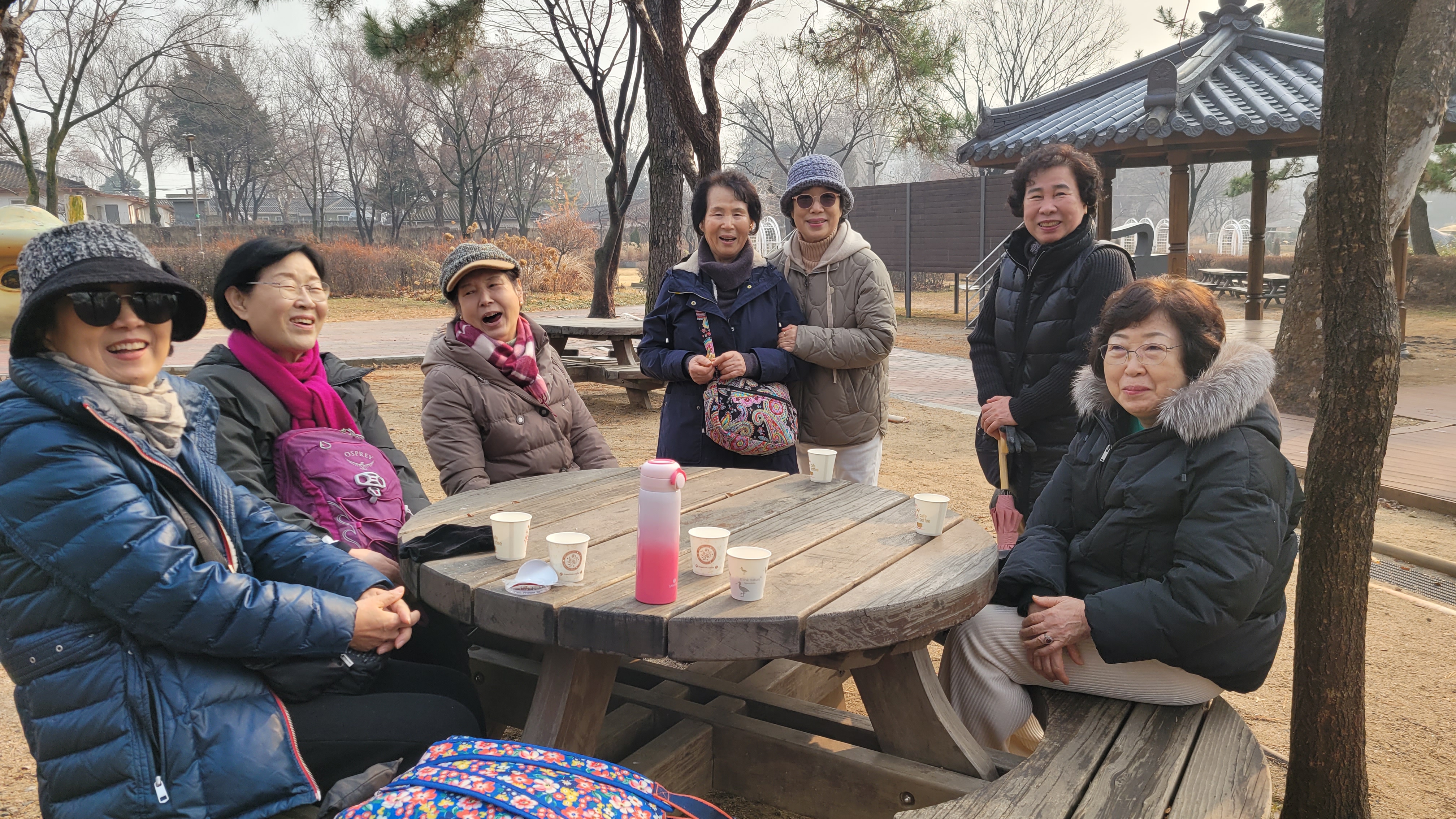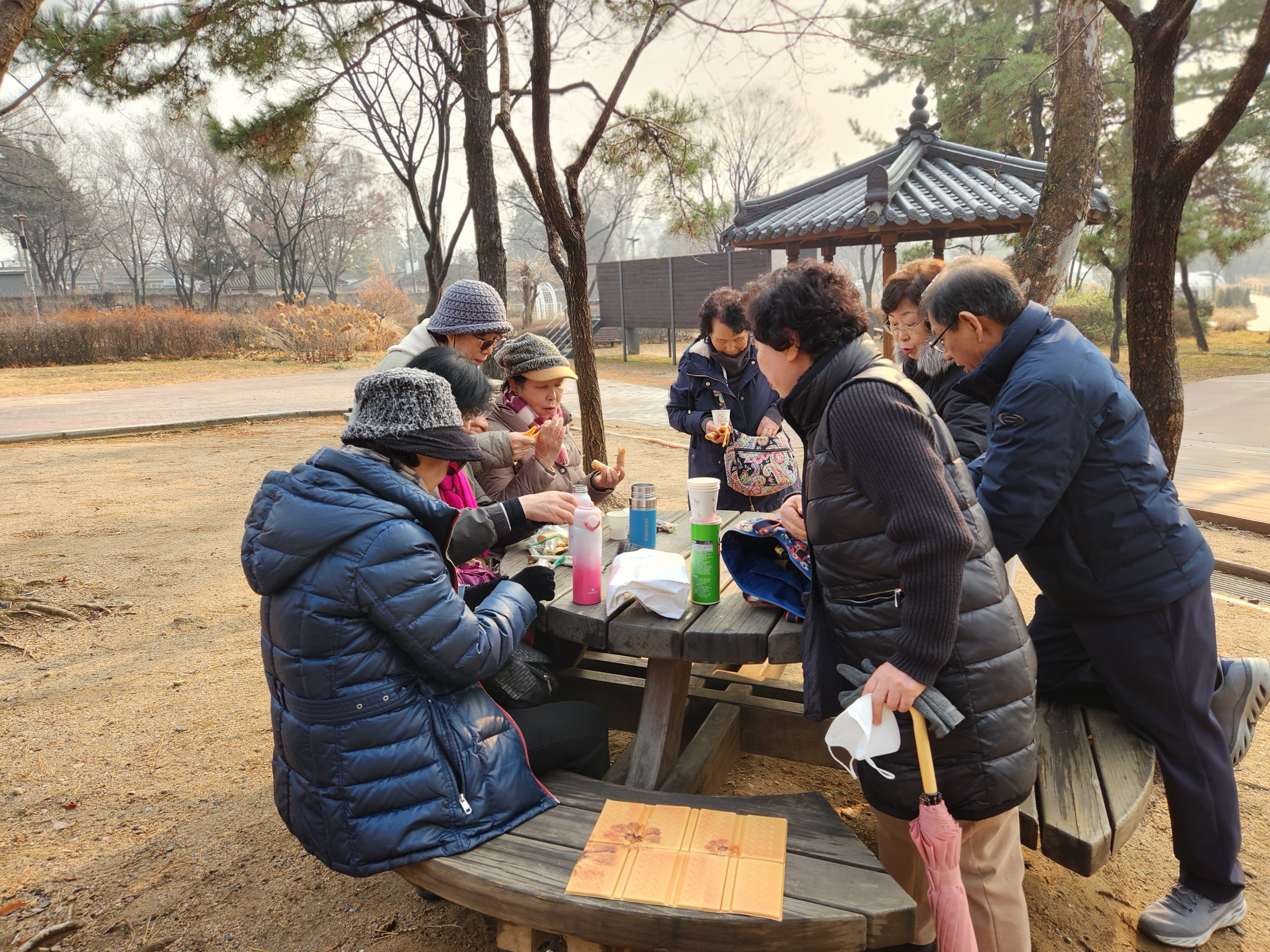 피크닠테이블에 옹기종기 들러앉아 따끈한 커피와 간식을 나누었다. 야외소풍나온 분위기가 된다.