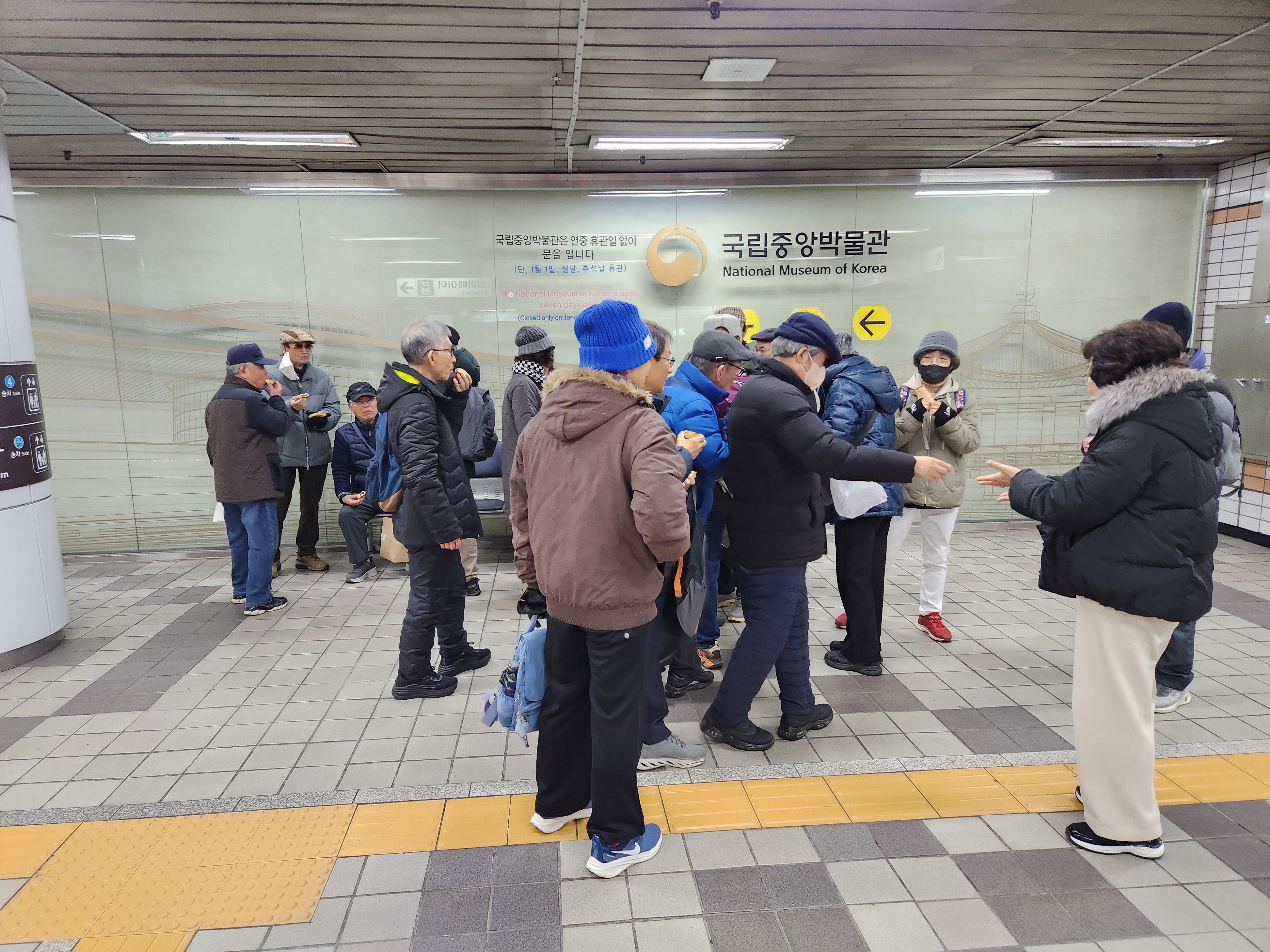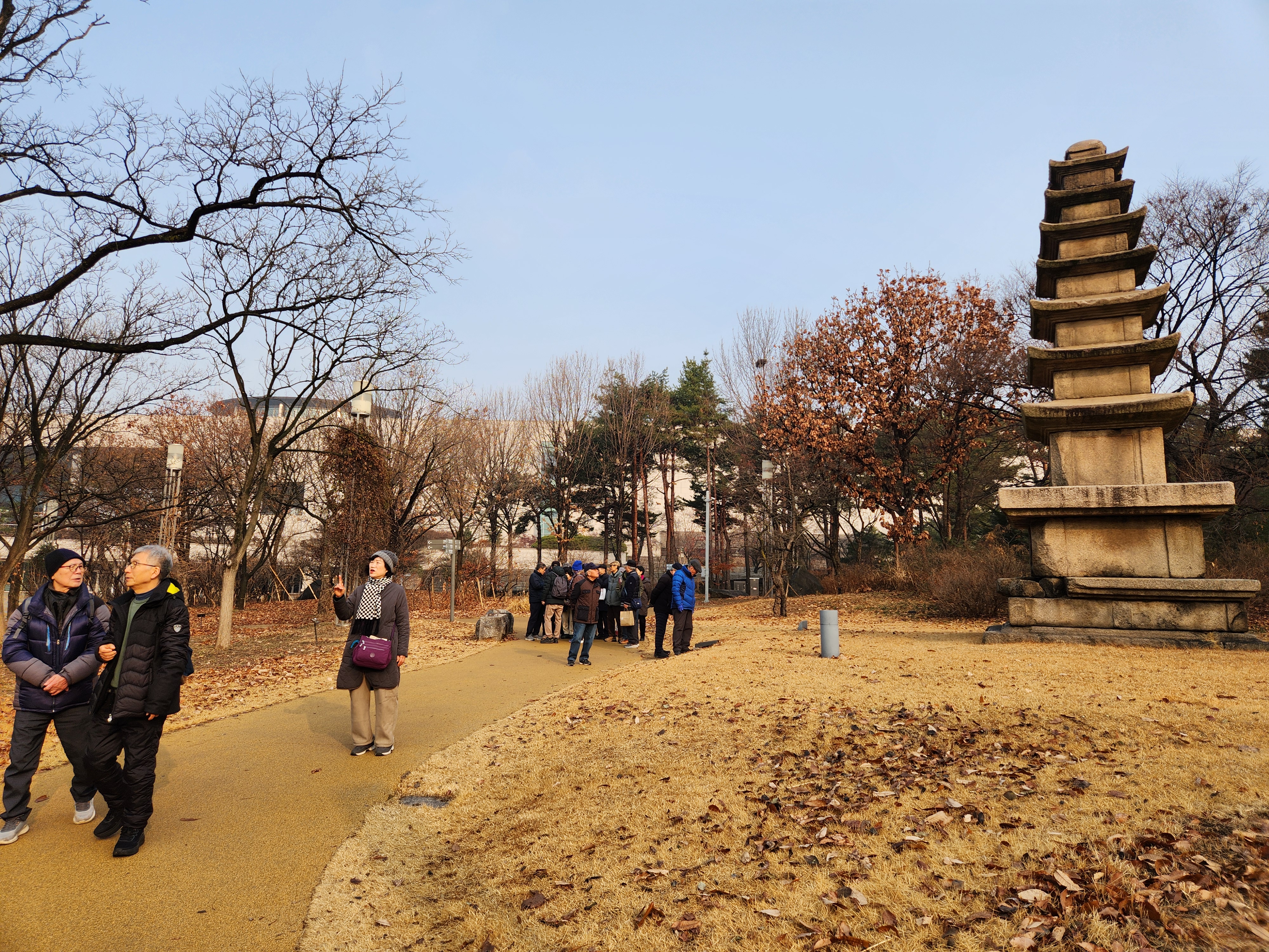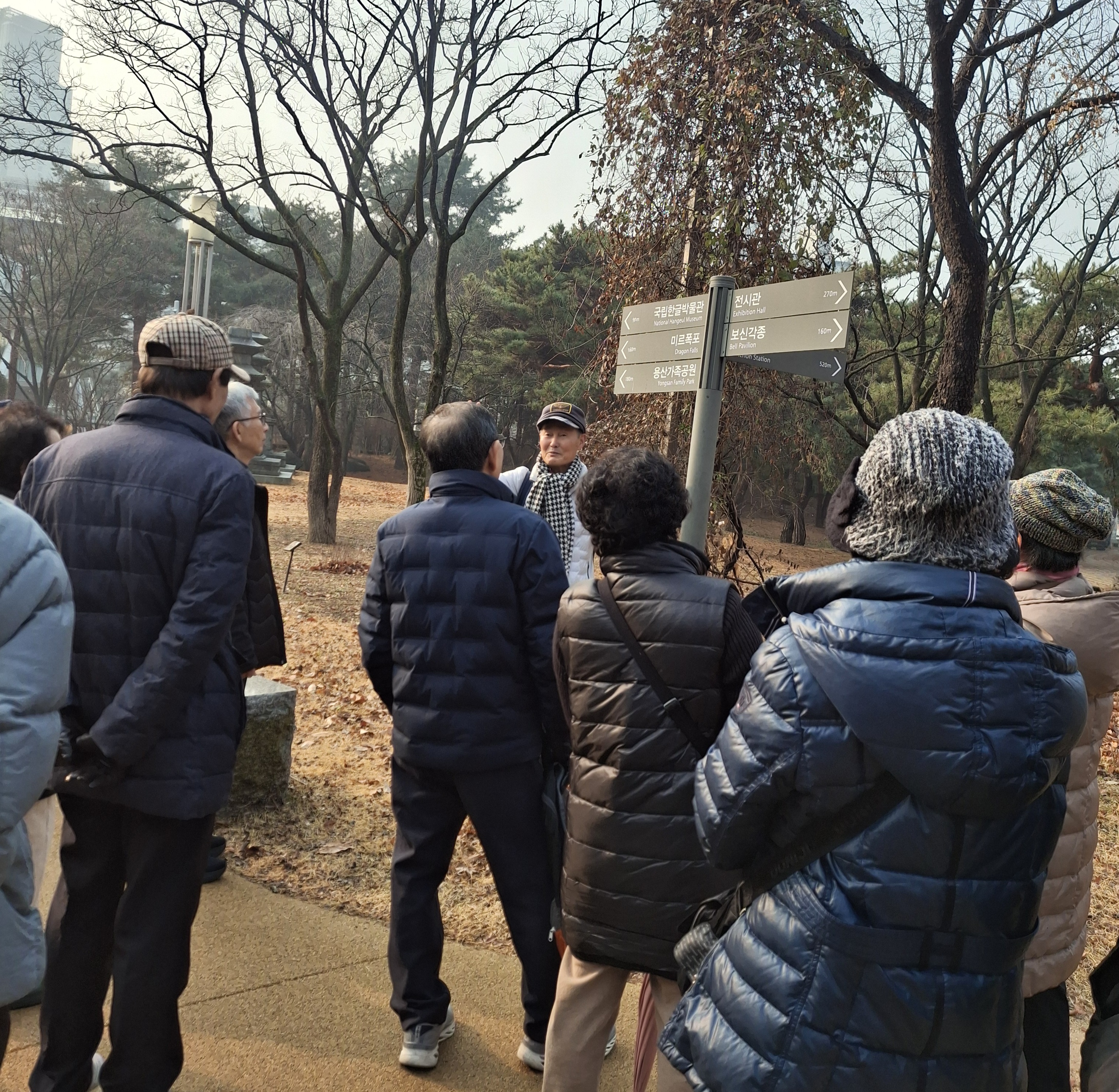 '25.12.29(월) 10:30, 이촌역 박물관쪽 출구에서 고교 일육우보회 23명이 만나 국립박물관 야외 탑공원을 지나 용산가족공원을 돌아보고 픽크닠탁자에 둘러앉아 간식타임,