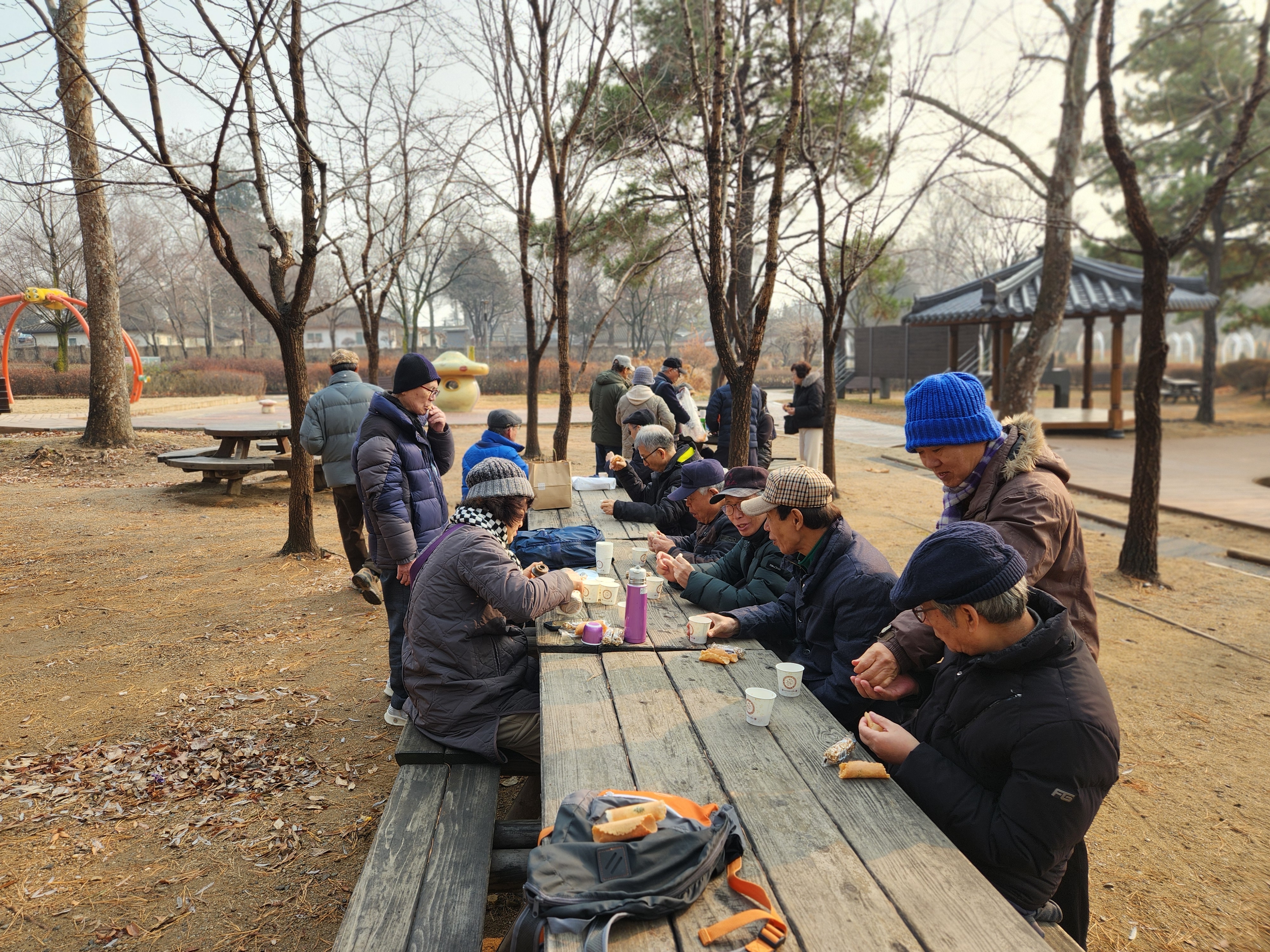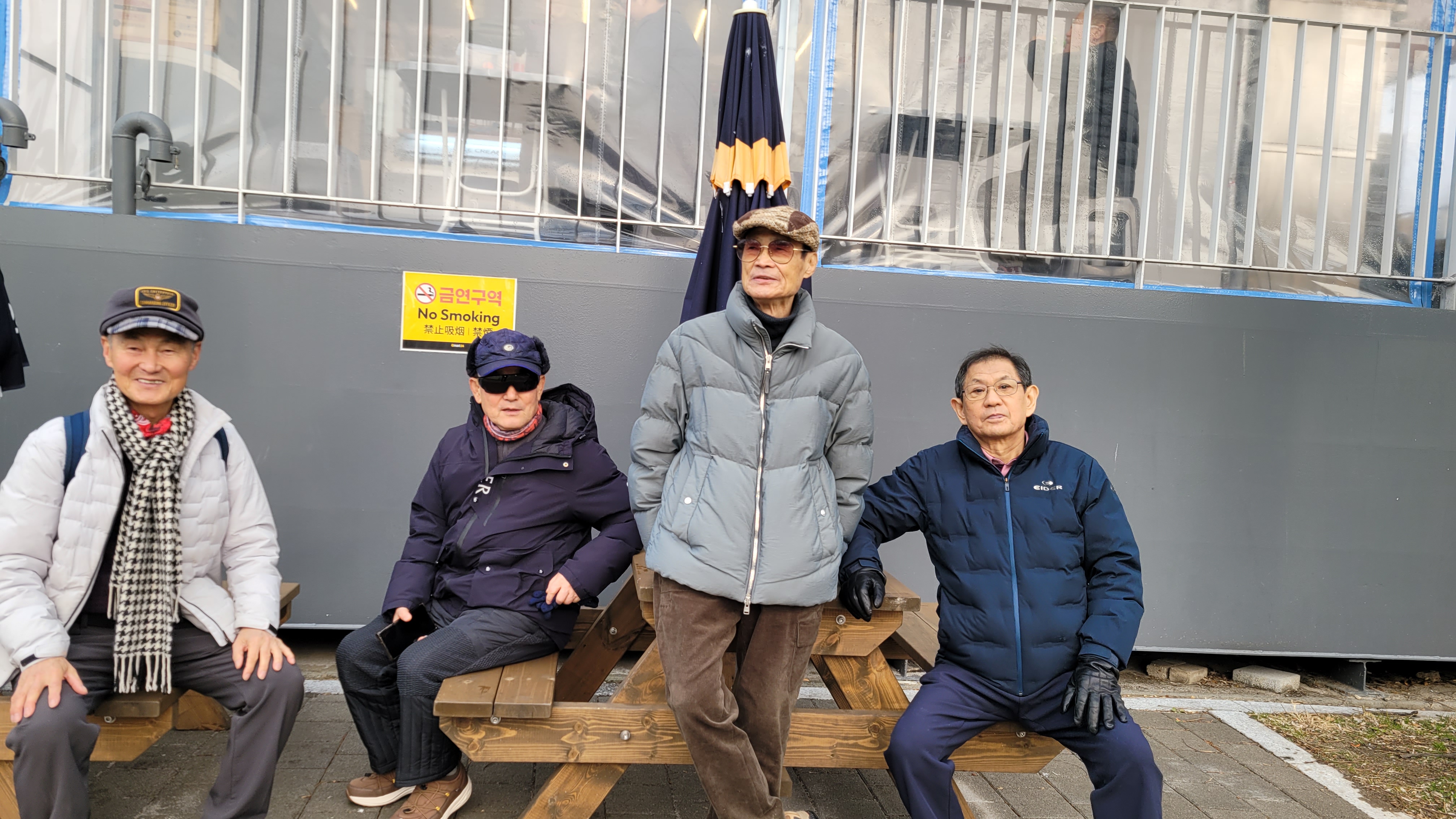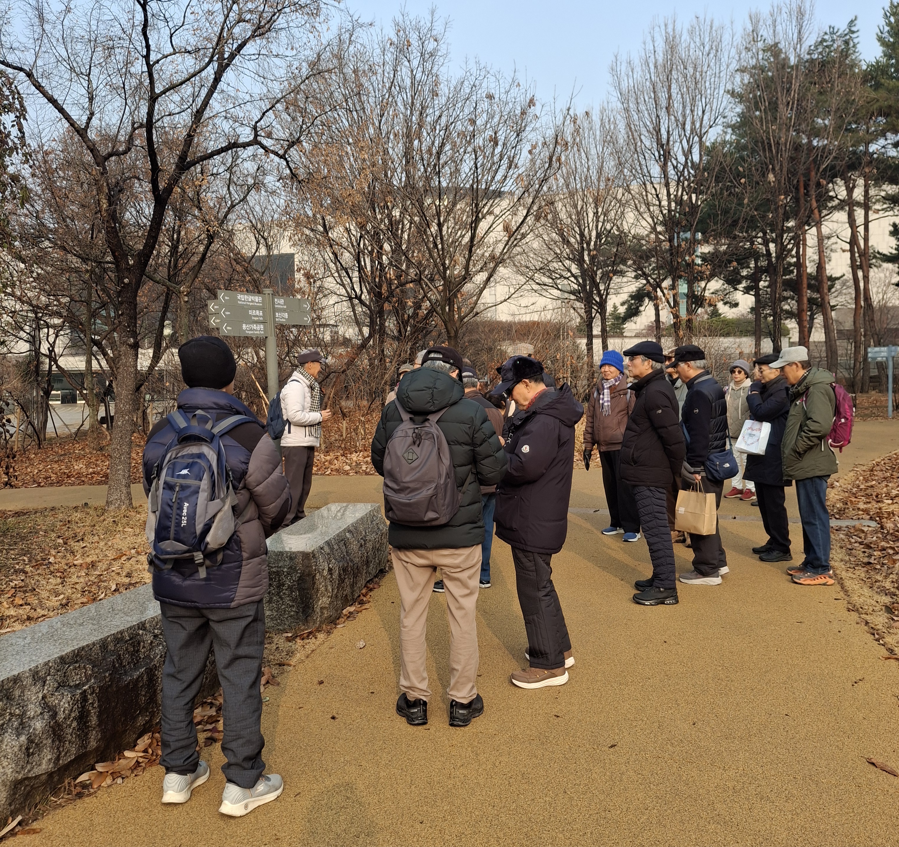 '25.12.29(월) 10:30, 이촌역 박물관쪽 출구에서 고교 일육우보회 23명이 만나 국립박물관 야외 탑공원을 지나 용산가족공원을 돌아보고 픽크닠탁자에 둘러앉아 간식타임,