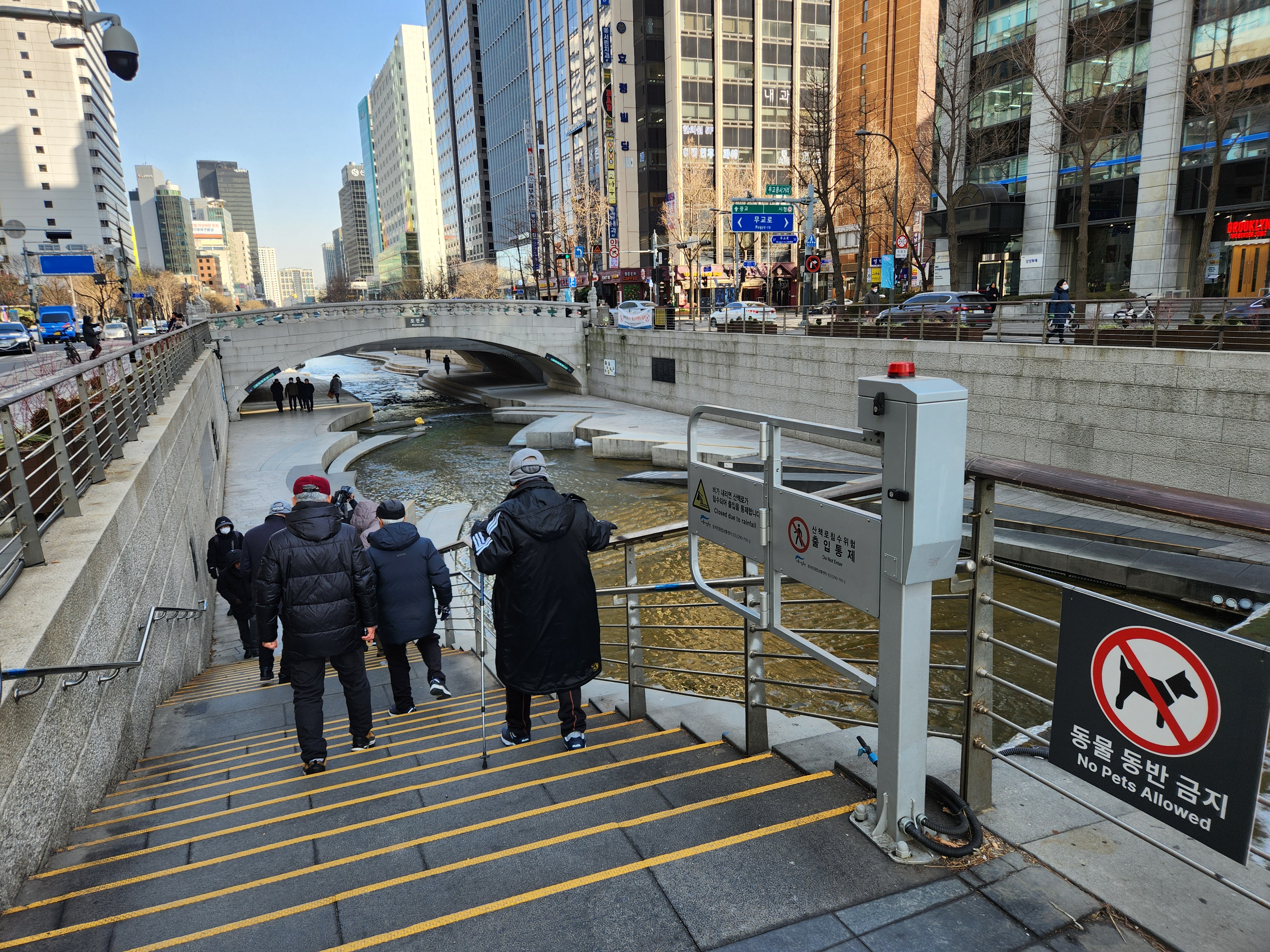 청계광장에서 해설사와 함께 청계천 수변길로 들어선다. 한강에서 하루 4만톤 끌어들인 물줄기가 폭포수 아래로 우렁차게 수직낙하하고 있었다. 하천은 백색소음으로 긴장을 완화하고 심리적 안정감을 준다고 한다. 청계천의 역사 이야기는 다리를 중심으로 엮어진다. 청계천에는 22개의 다리가 있지만 해설사와 함께하는 다리는 14개로 오간수교까지 약 3km이다.