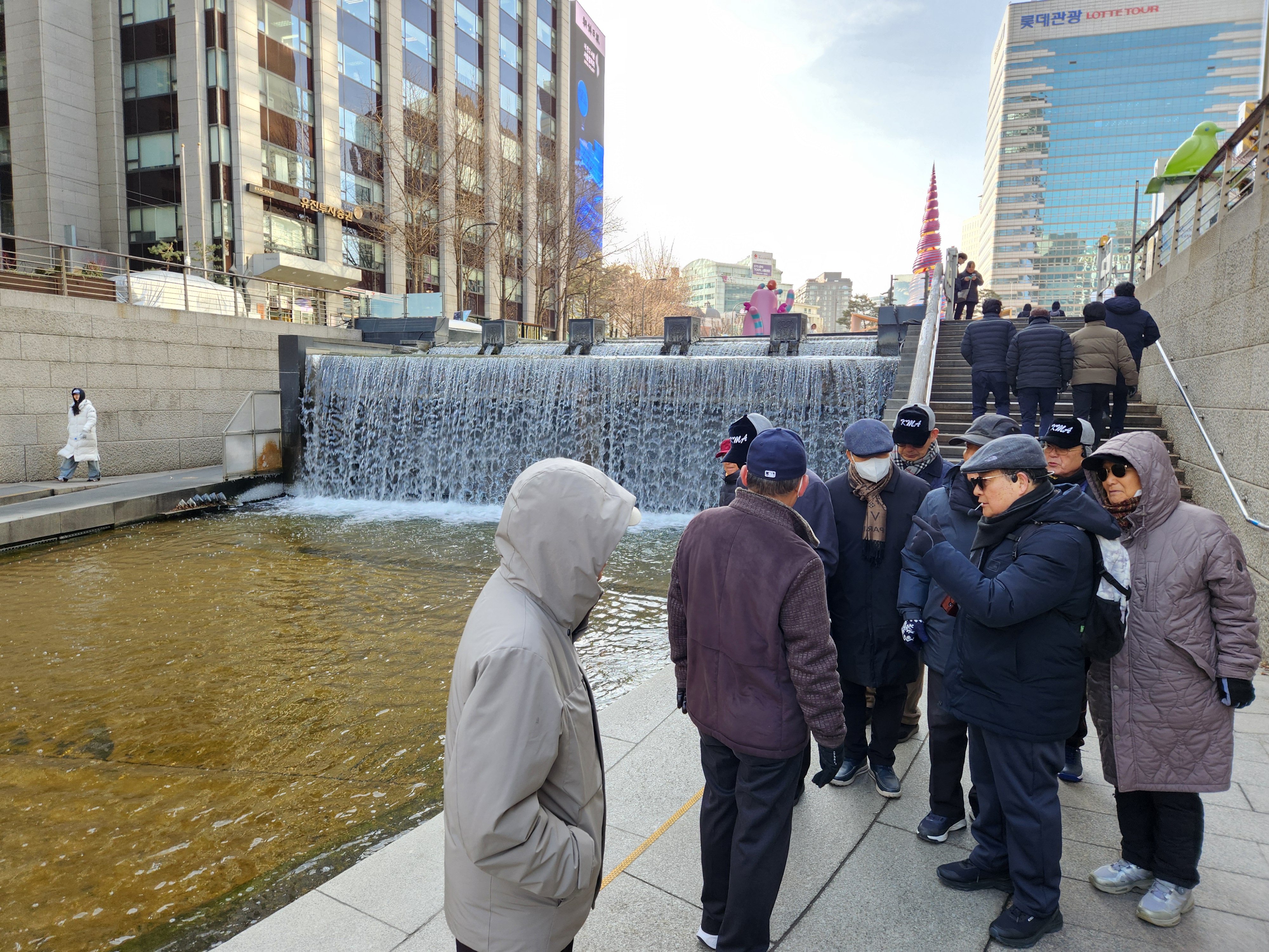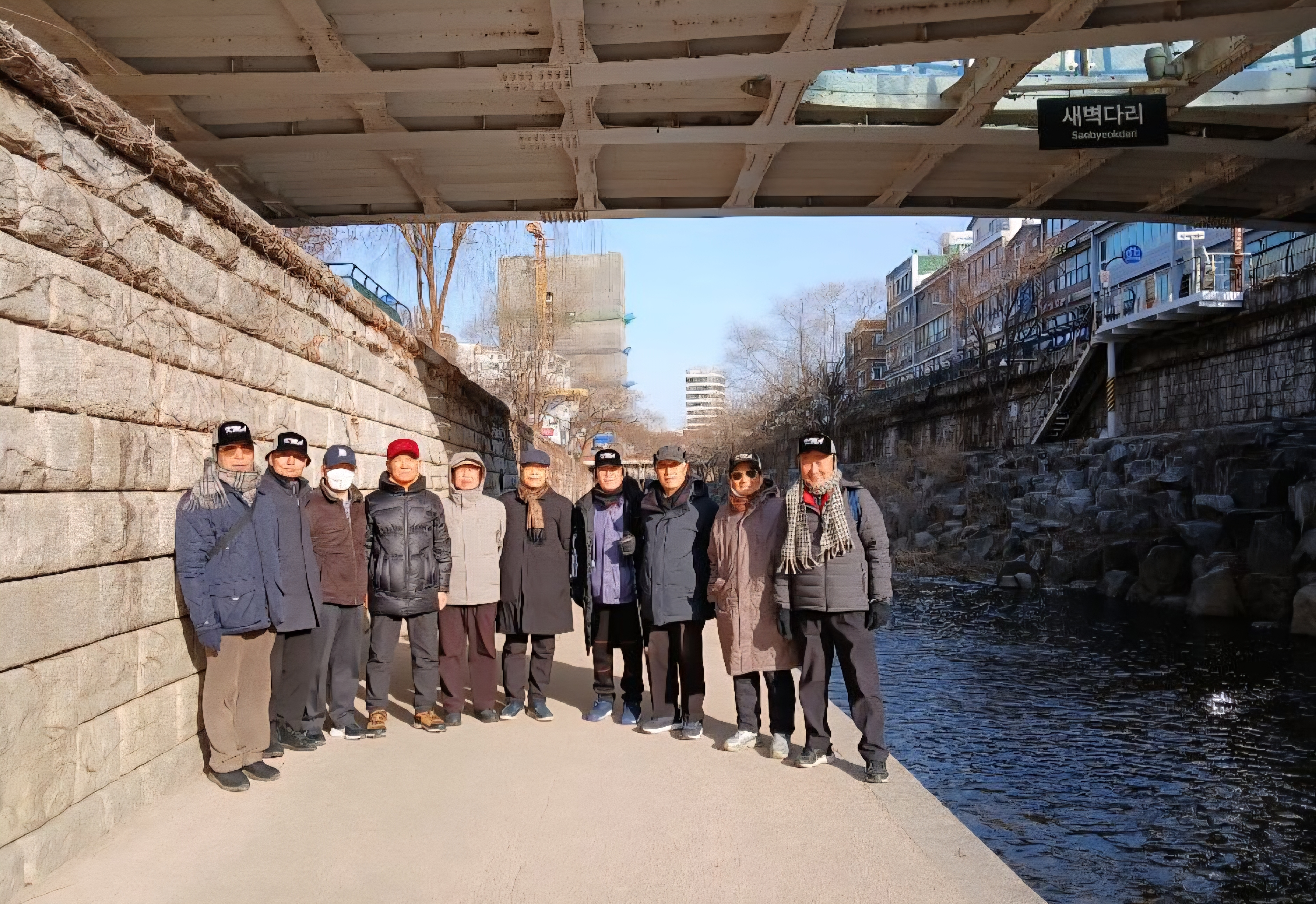 오후시간인데도 영하4도로 무척 추운날, 청계광장 소라탑앞에서 14:30 동기생 여의도포럼 10명이 만나 중구청 전문해설사 신성덕선생의 설명과 안내로 청계천 전체 11km 구간의 22개 교량 중에 상류 모전교에서 오간수교까지 3km, 14개 교량을 돌아보고 동대문 부근에서 저녁식사