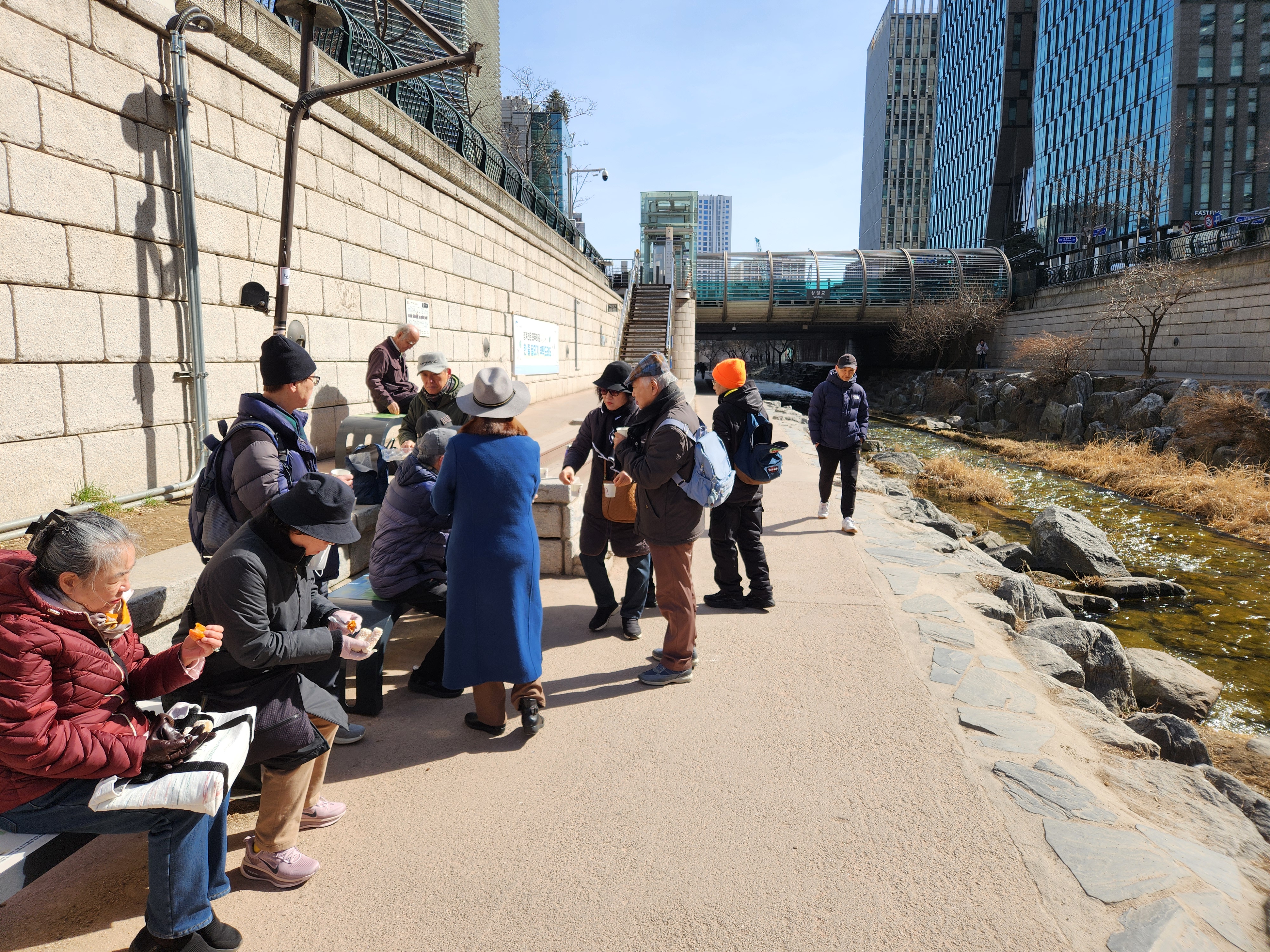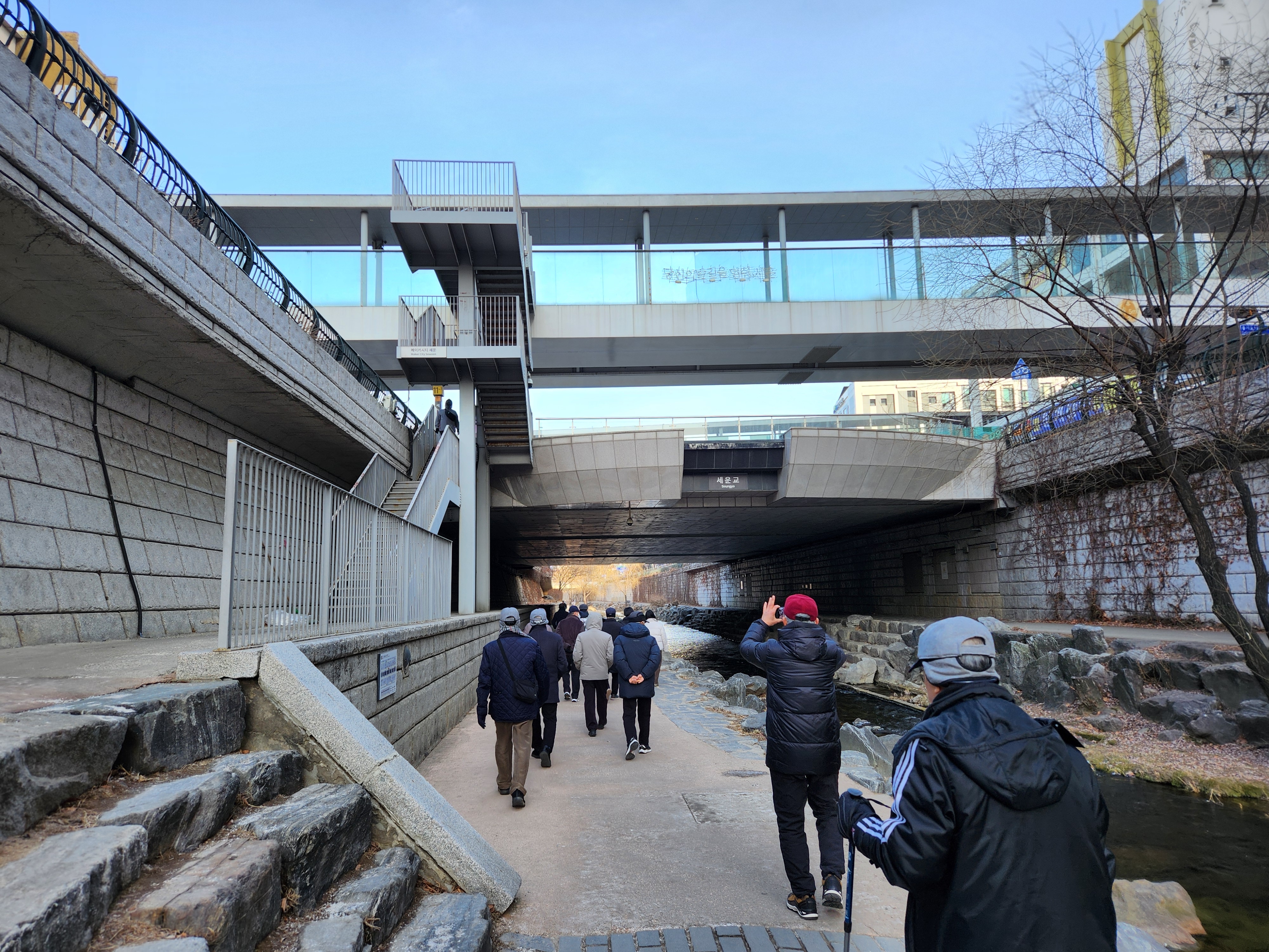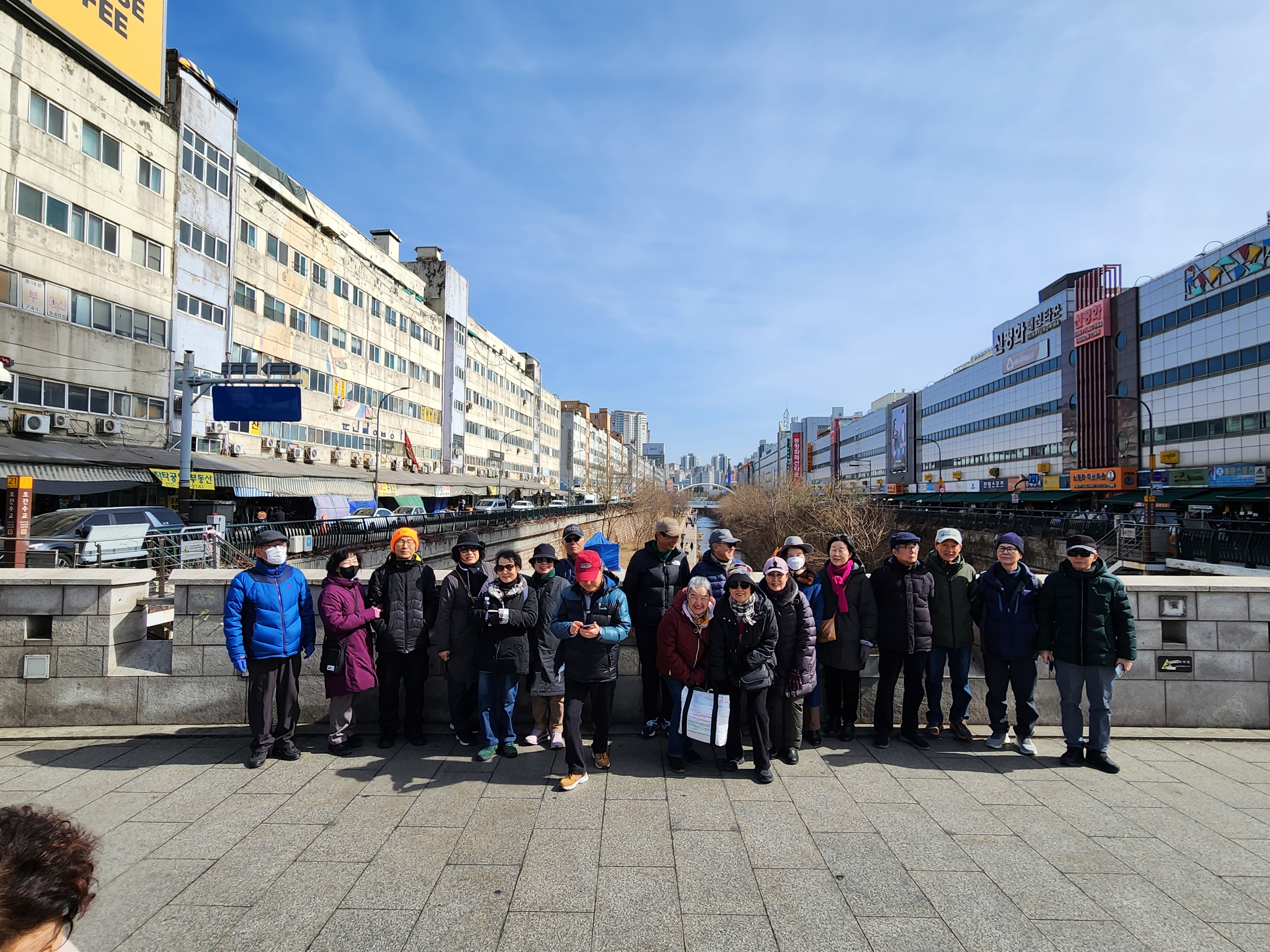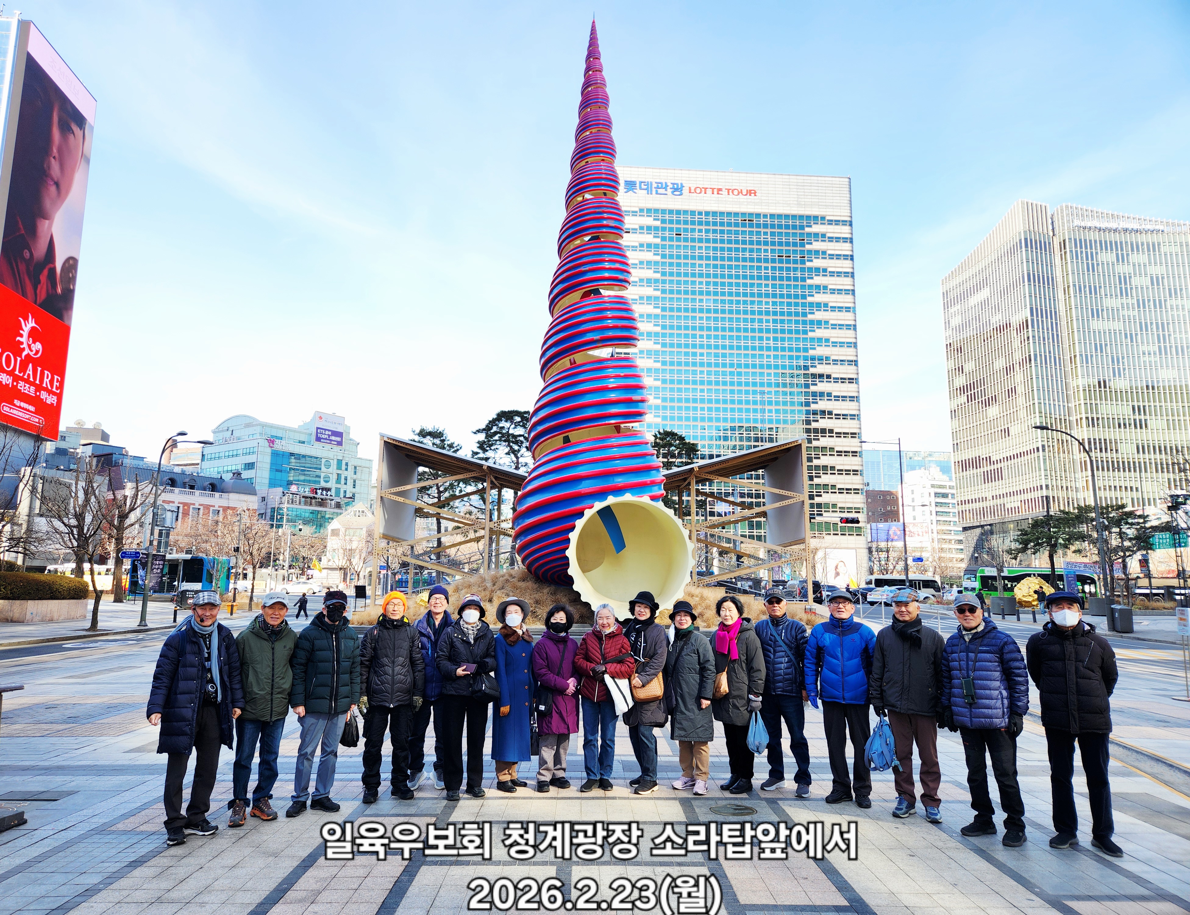 '26.2.23(월) 10:30, 광화문역 5출구 청계광장 소라탑앞에 고교 친구와 가족들 17명이 만나 청계천 11km 22개 교량 중에 14개교량 해설답사