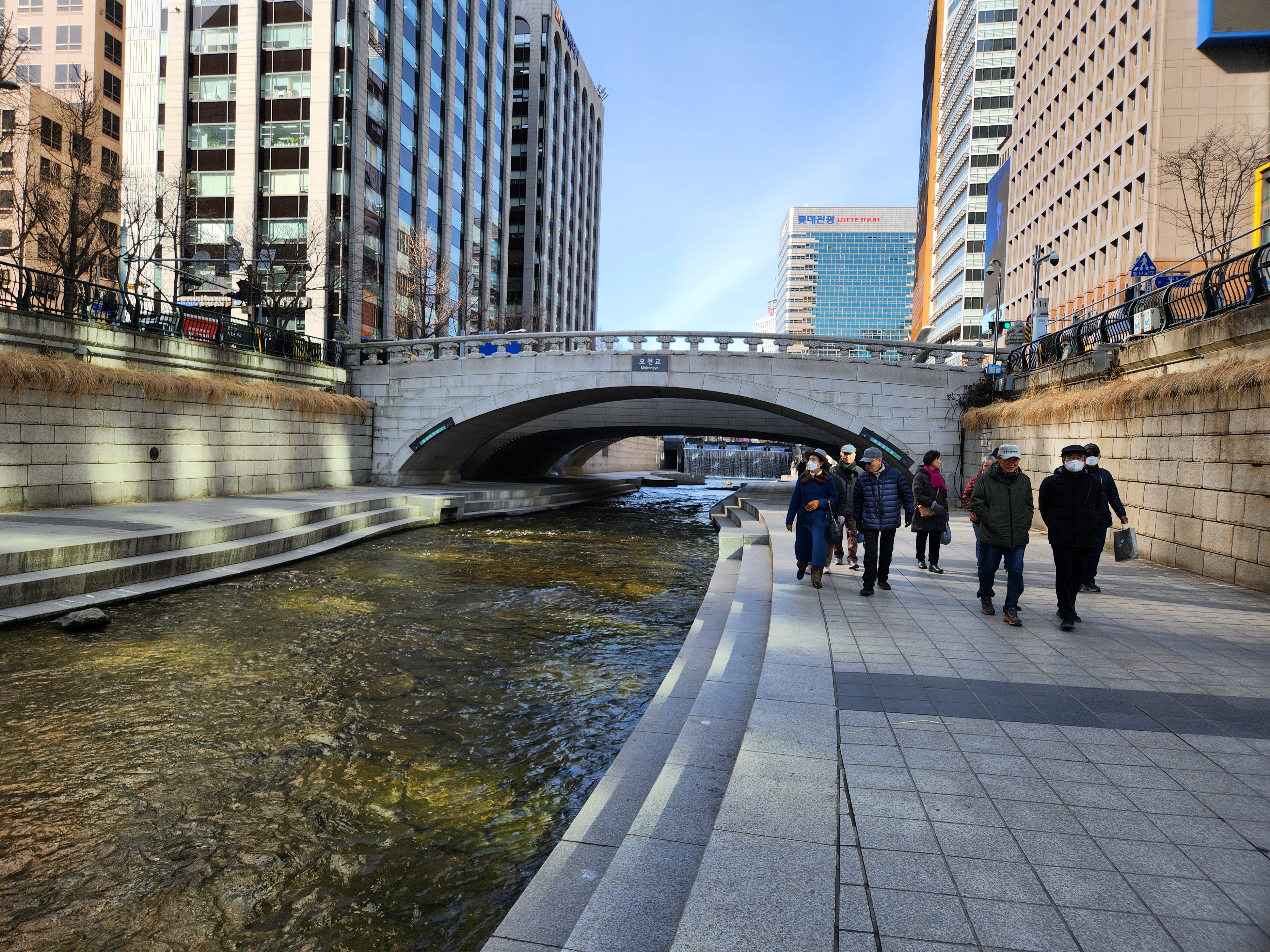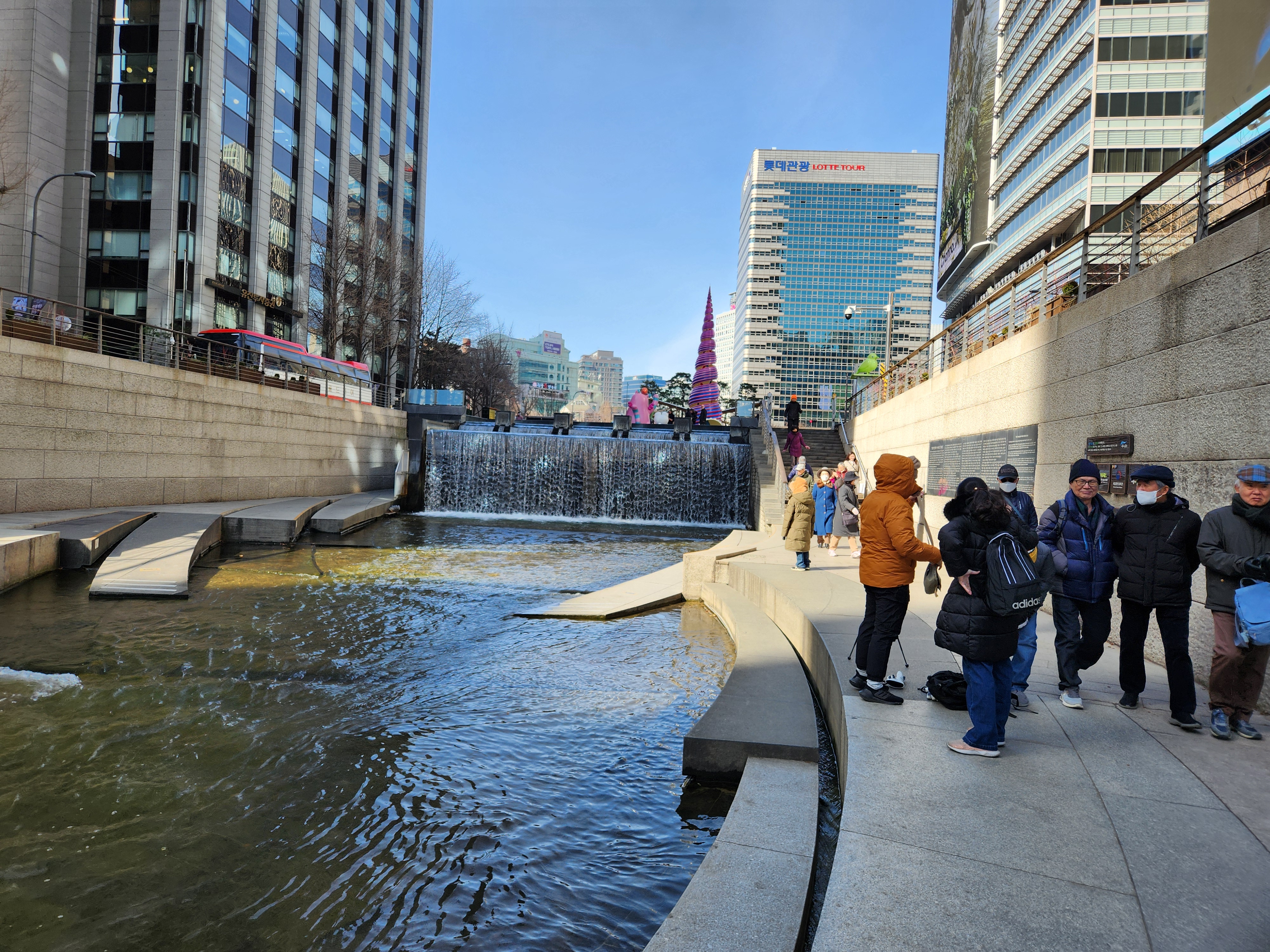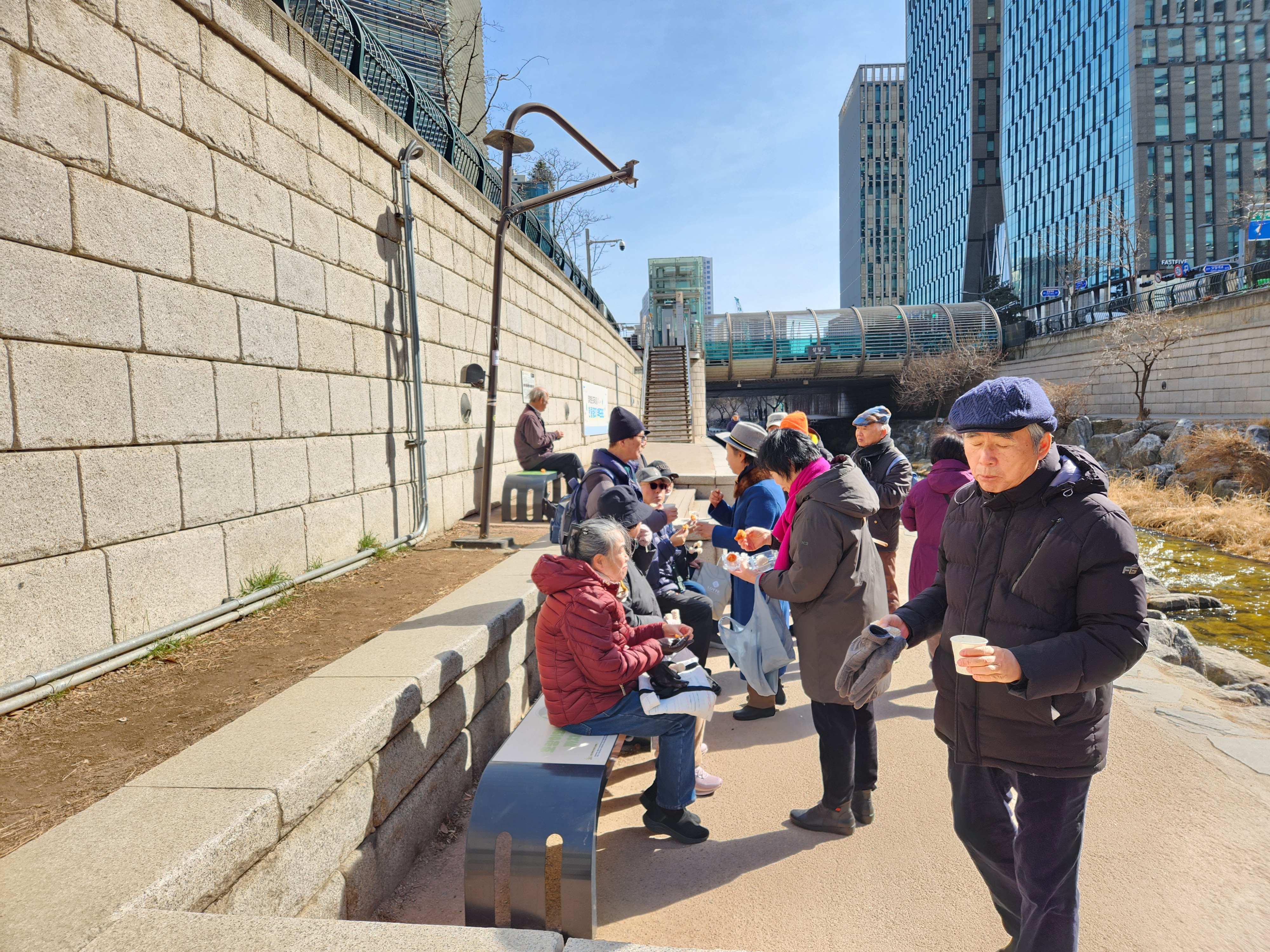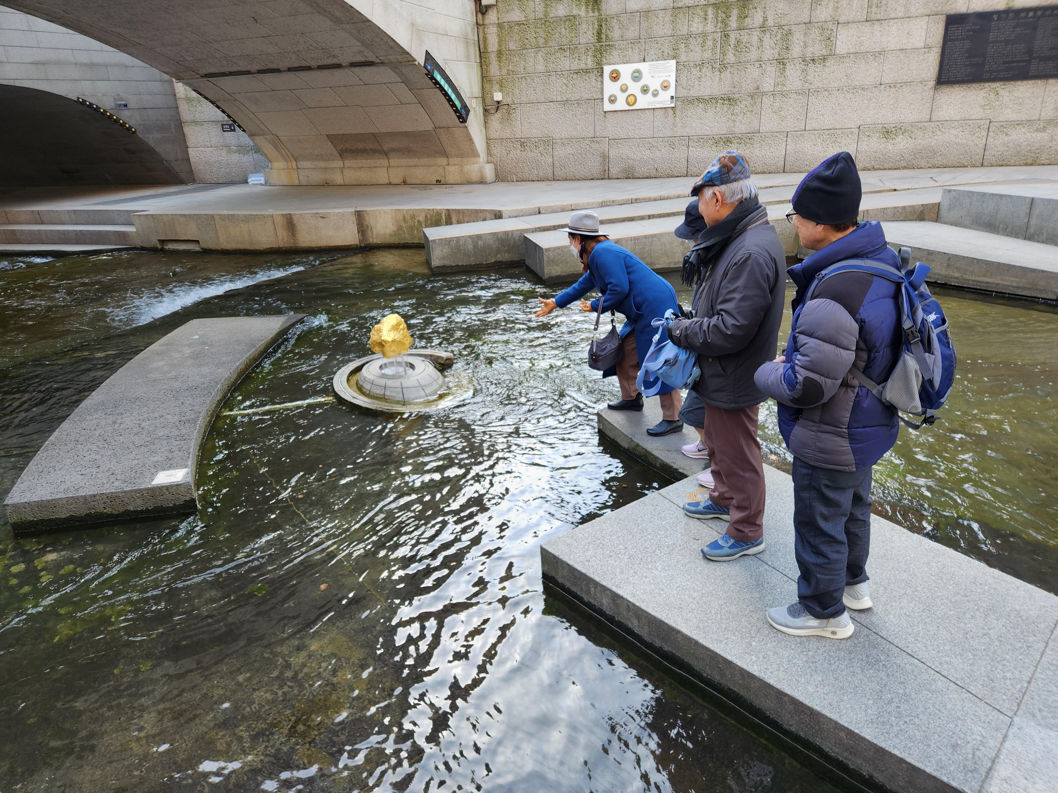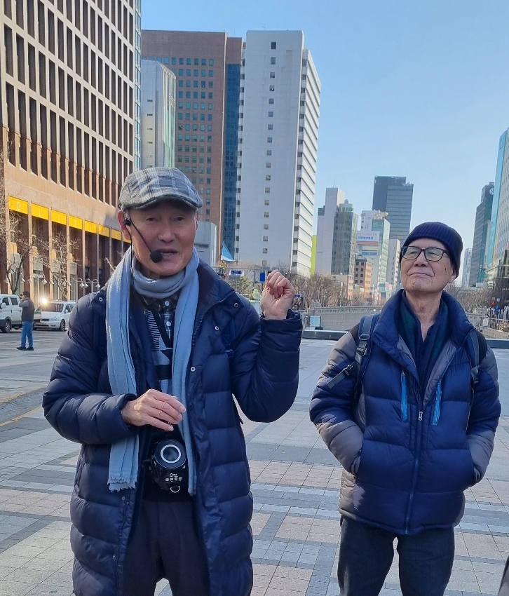 '26.2.23(월) 10:30, 광화문역 5출구 청계광장 소라탑앞에 고교 친구와 가족들 17명이 만나 청계천 11km 22개 교량 중에 14개교량 해설답사
