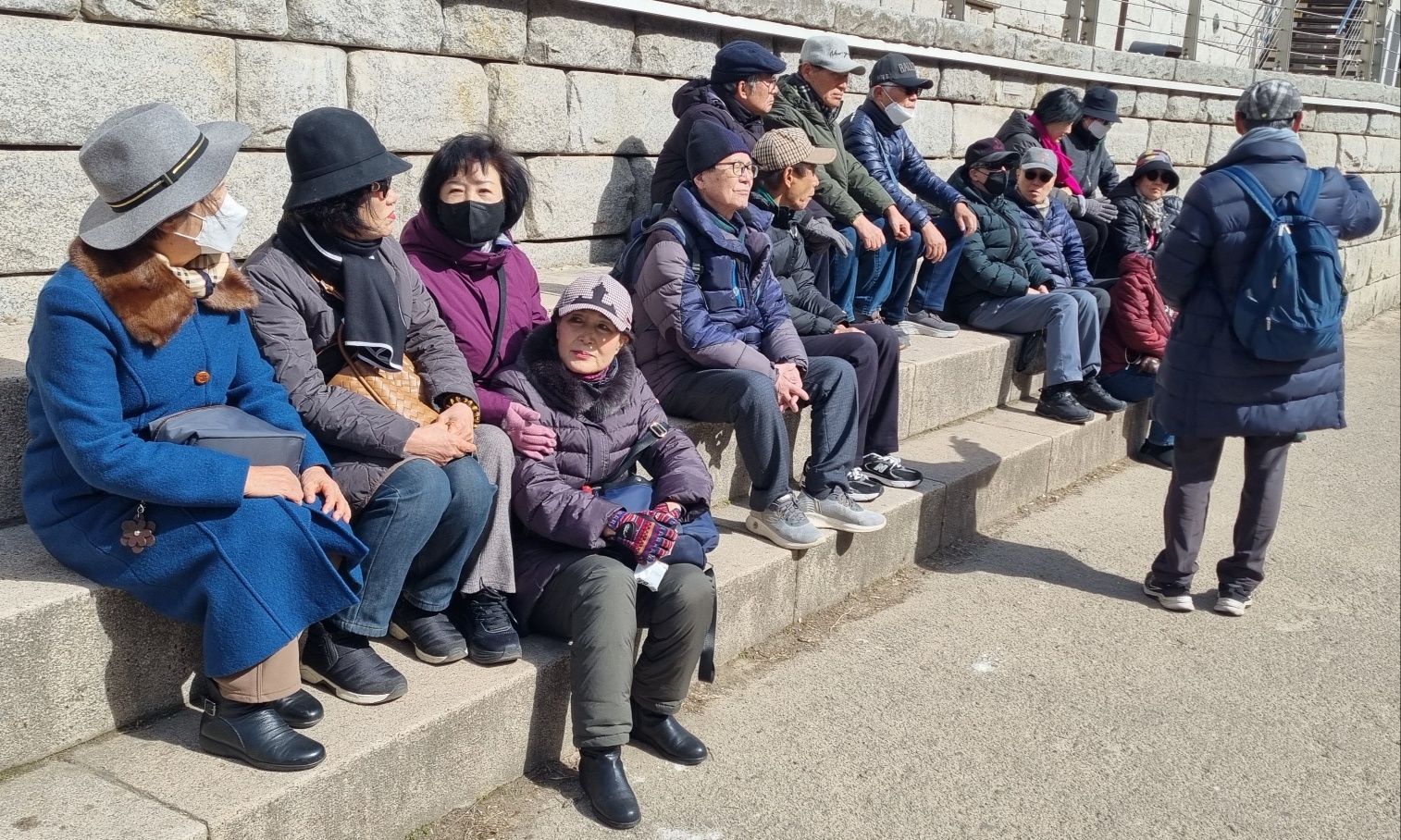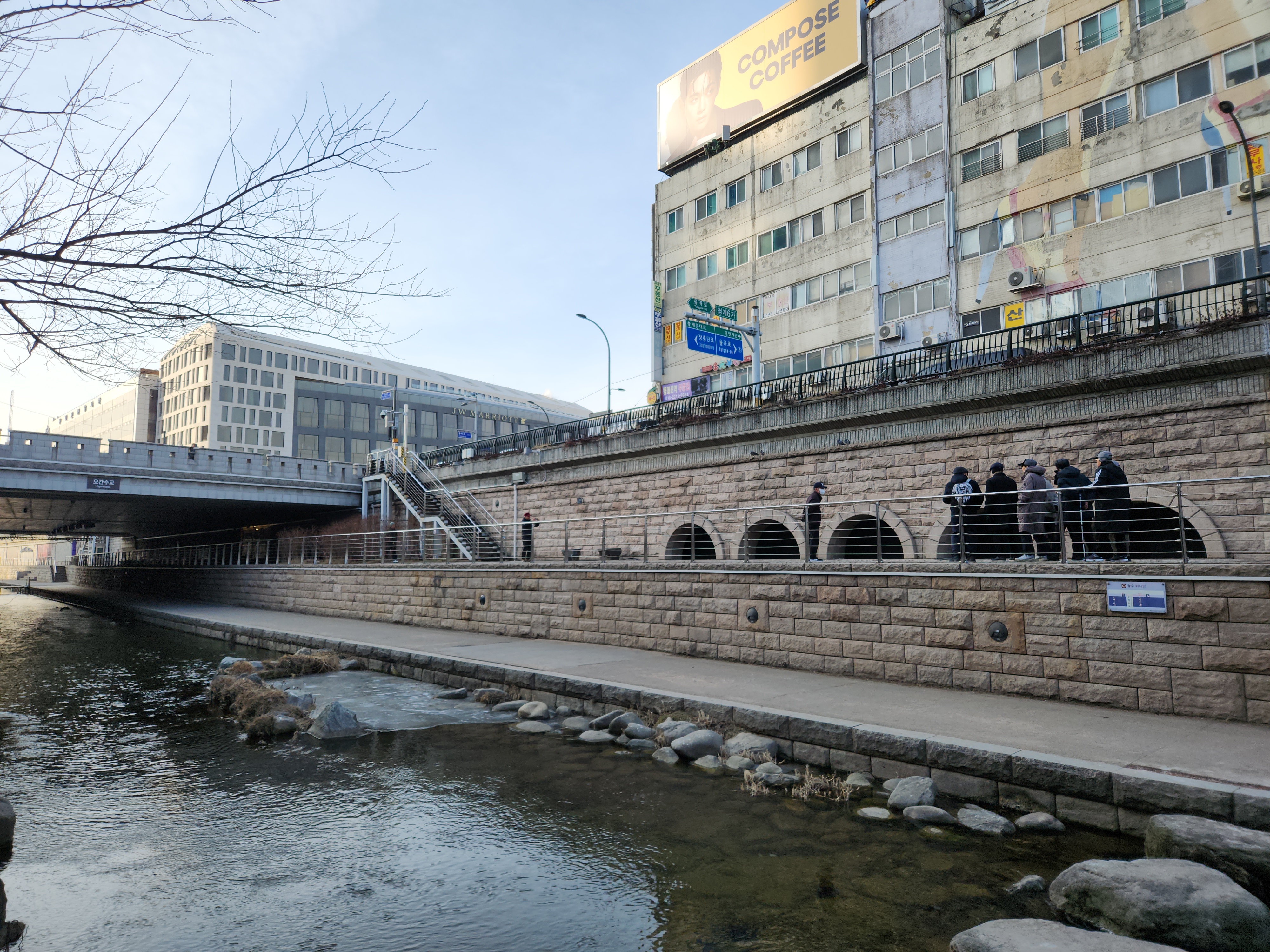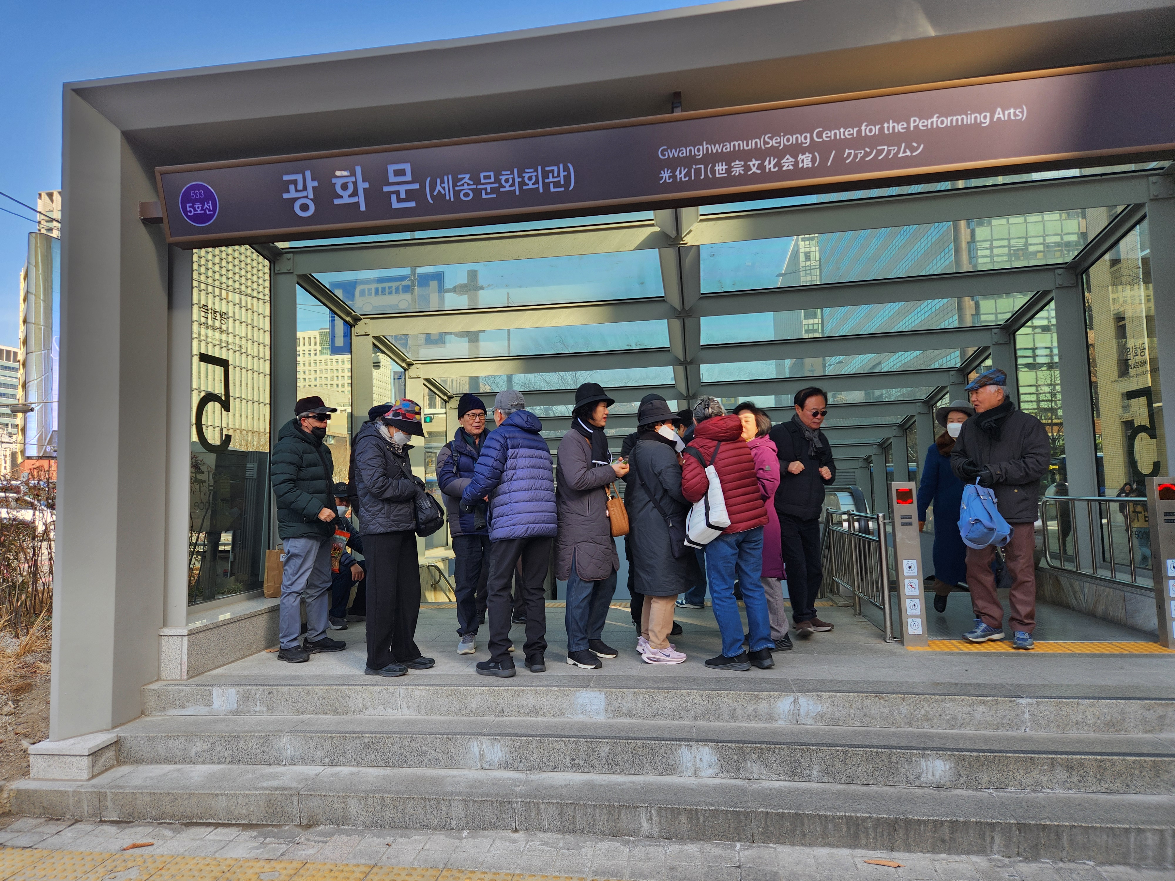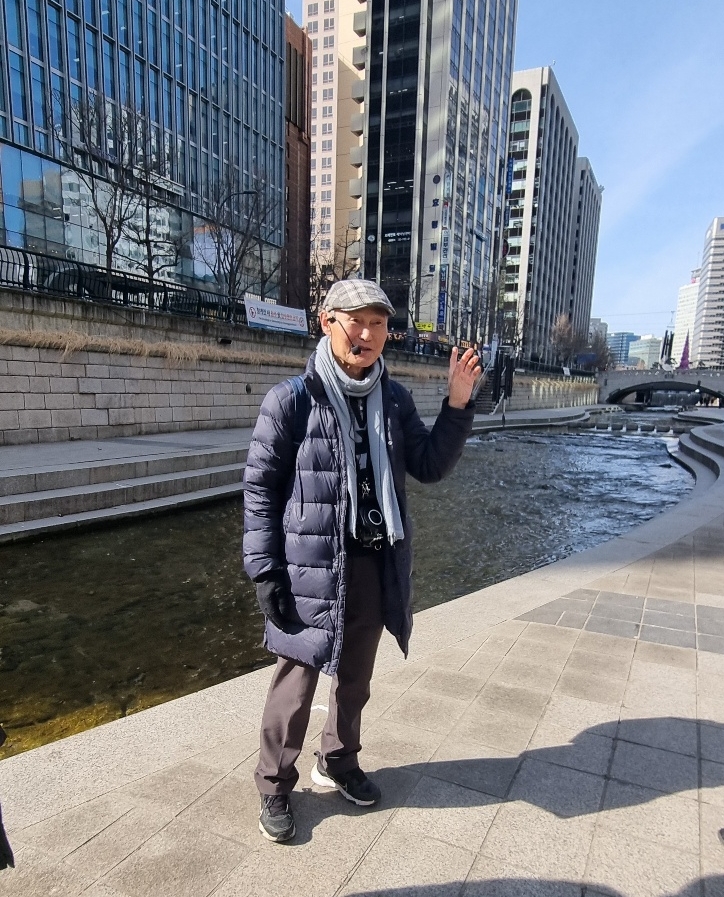 '26.2.23(월) 10:30, 광화문역 5출구 청계광장 소라탑앞에 고교 친구와 가족들 17명이 만나 청계천 11km 22개 교량 중에 14개교량 해설답사