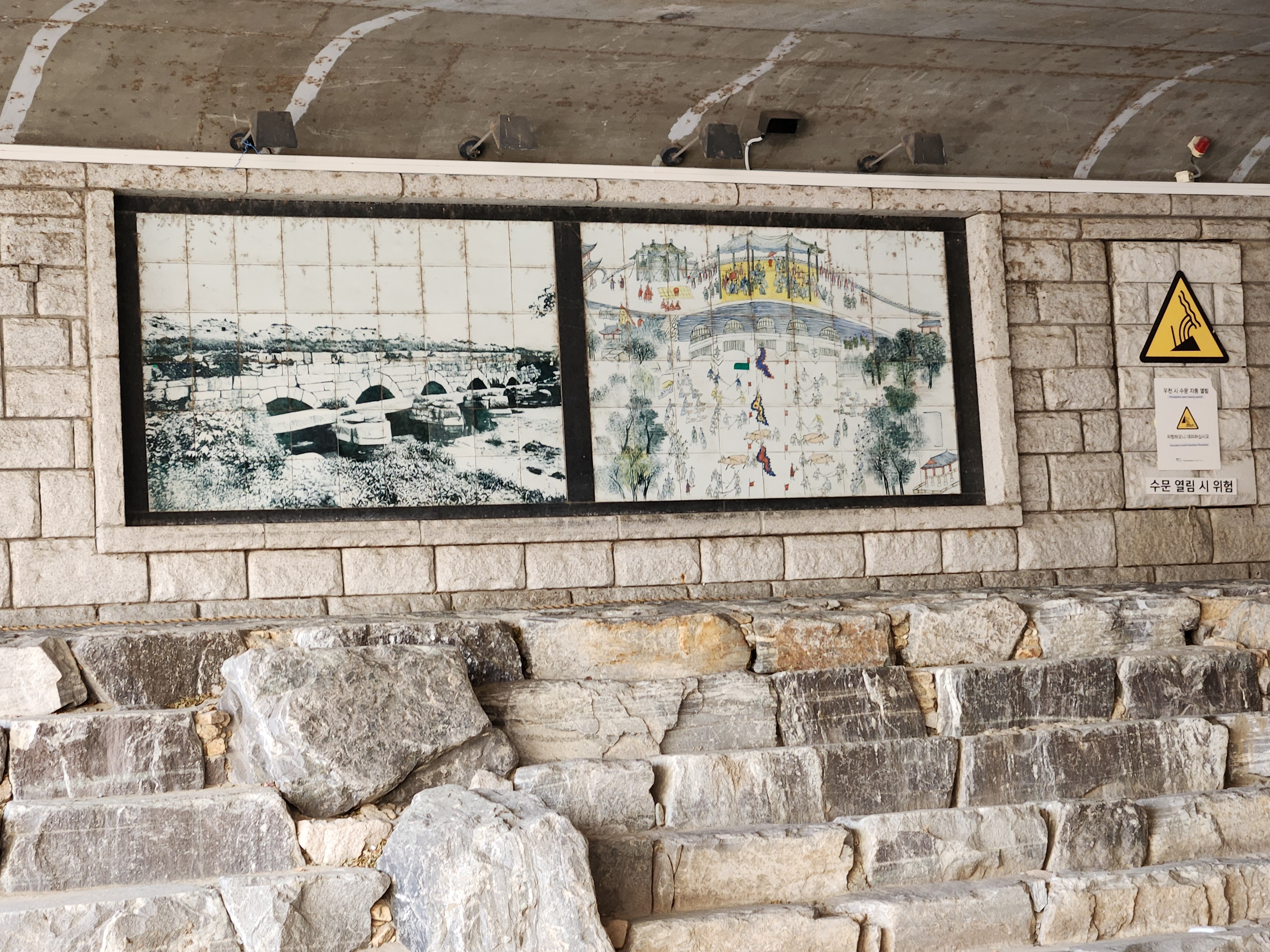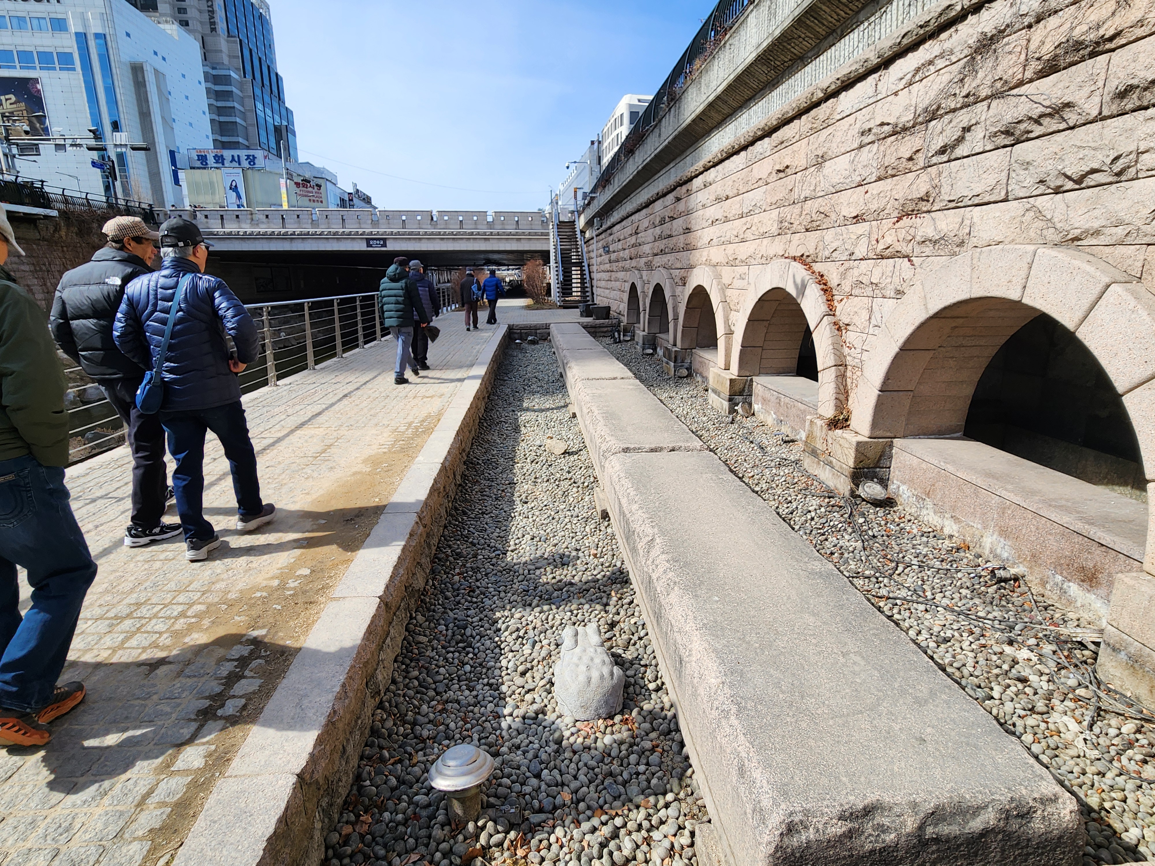 한강에서 하루 4만톤 끌어들인 물줄기가 폭포수 아래로 우렁차게 수직낙하하고 있었다. 하천은 백색소음으로 긴장을 완화하고 심리적 안정감을 준다고 한다. 청계천의 역사 이야기는 다리를 중심으로 엮어진다. 청계천에는 22개의 다리가 있지만 해설사와 함께하는 다리는 14개로 오간수교까지 약 3km이다.
